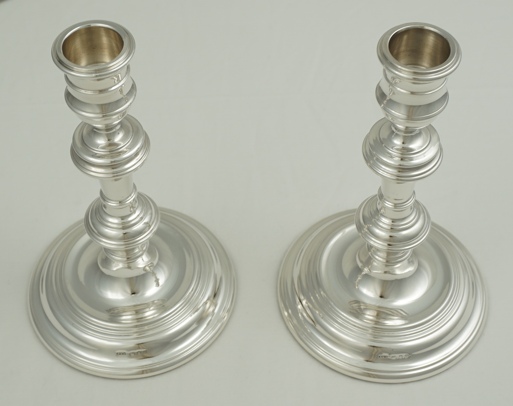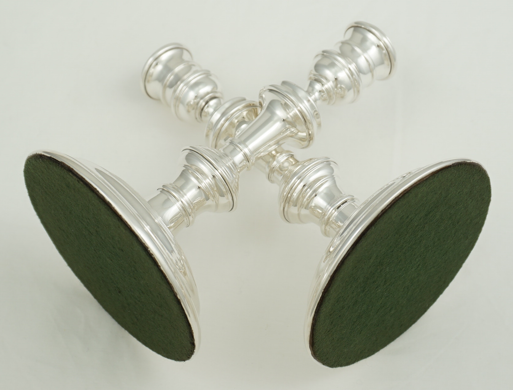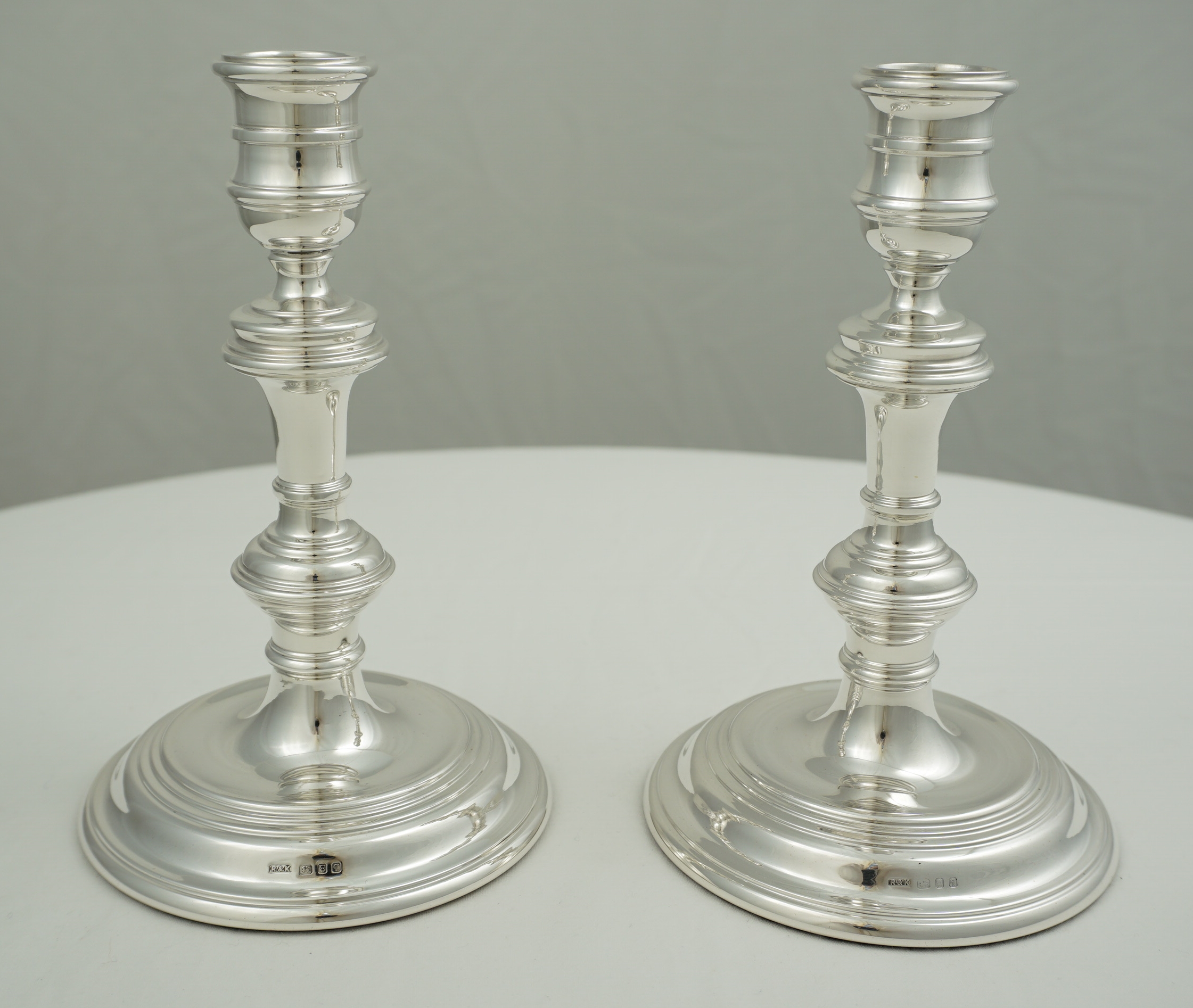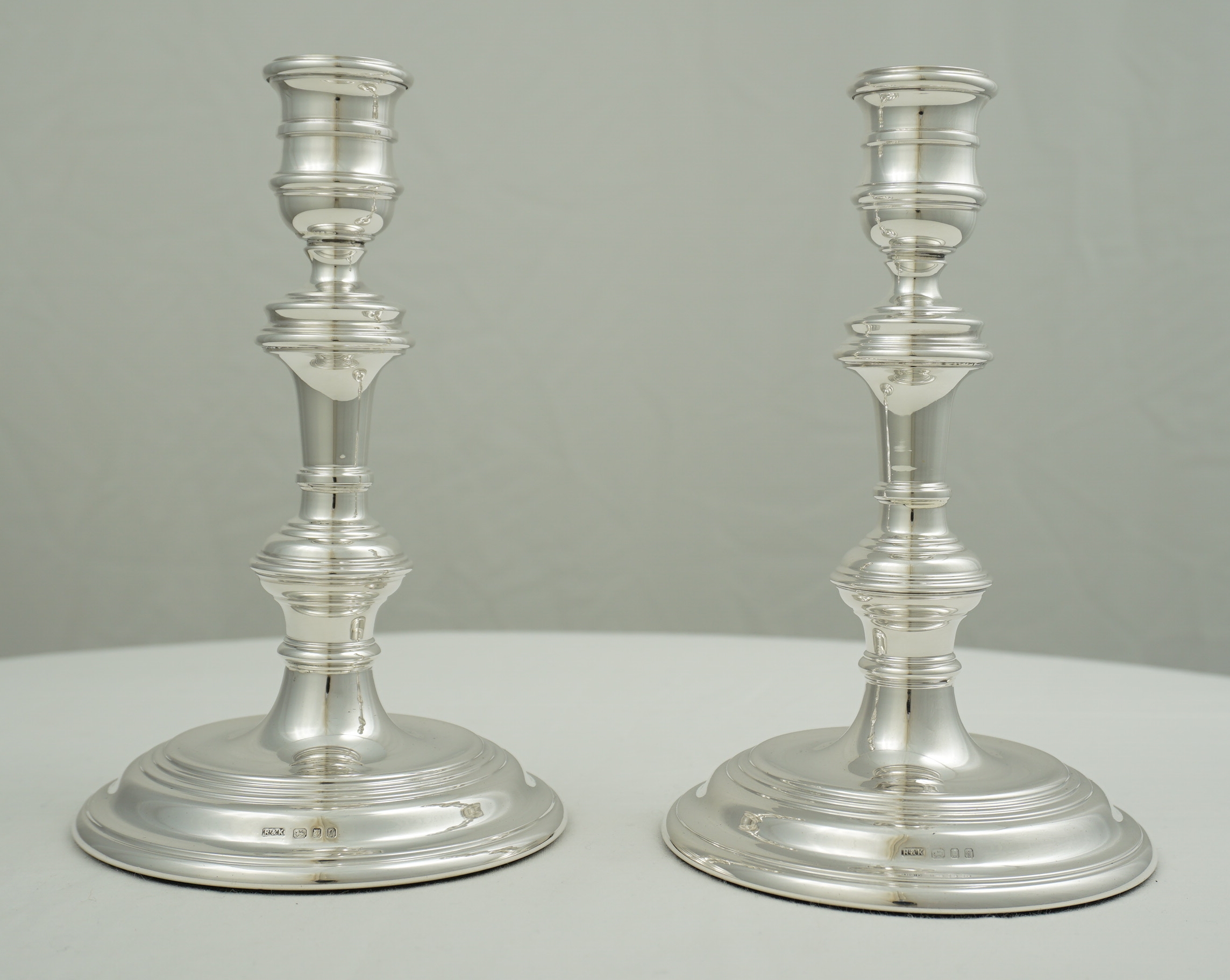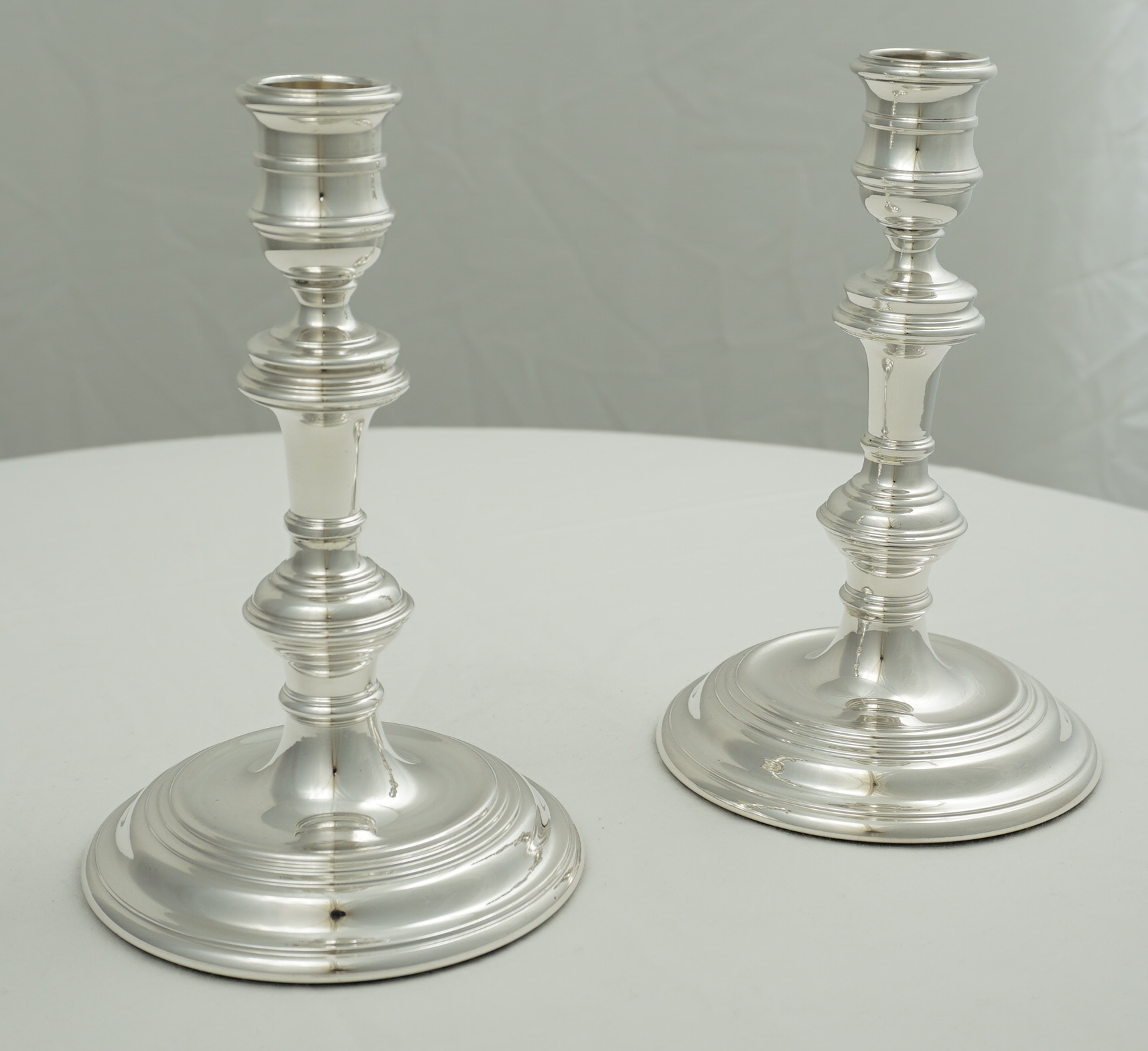 DESCRIPTION | Very good and useful pair of vintage George I (1714-27) style English plaster loaded sterling silver candlesticks with a flattened knop above a secondary knop and ring turned circular base with shallow depression. This last feature would catch spilt wax and also provided a convenient place to engrave your coat of arms. Note the lack of drip pans or sconces as we now call them. Sconces did not regularly appear on candlesticks until 1735. |