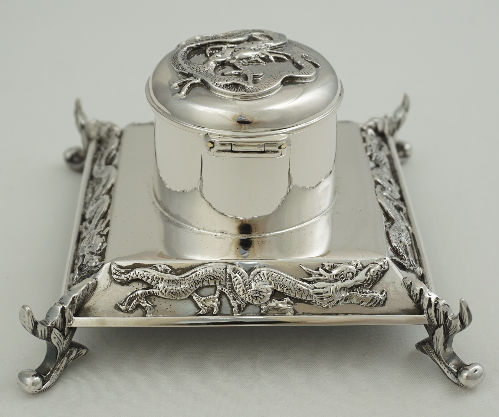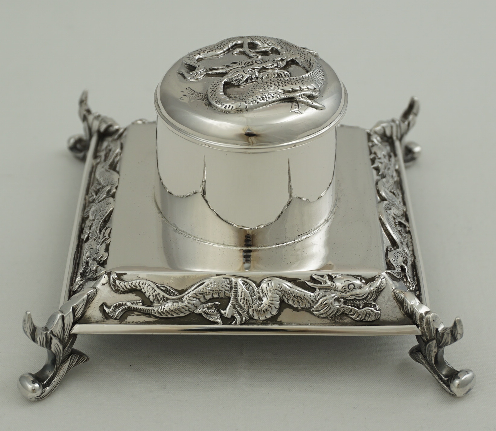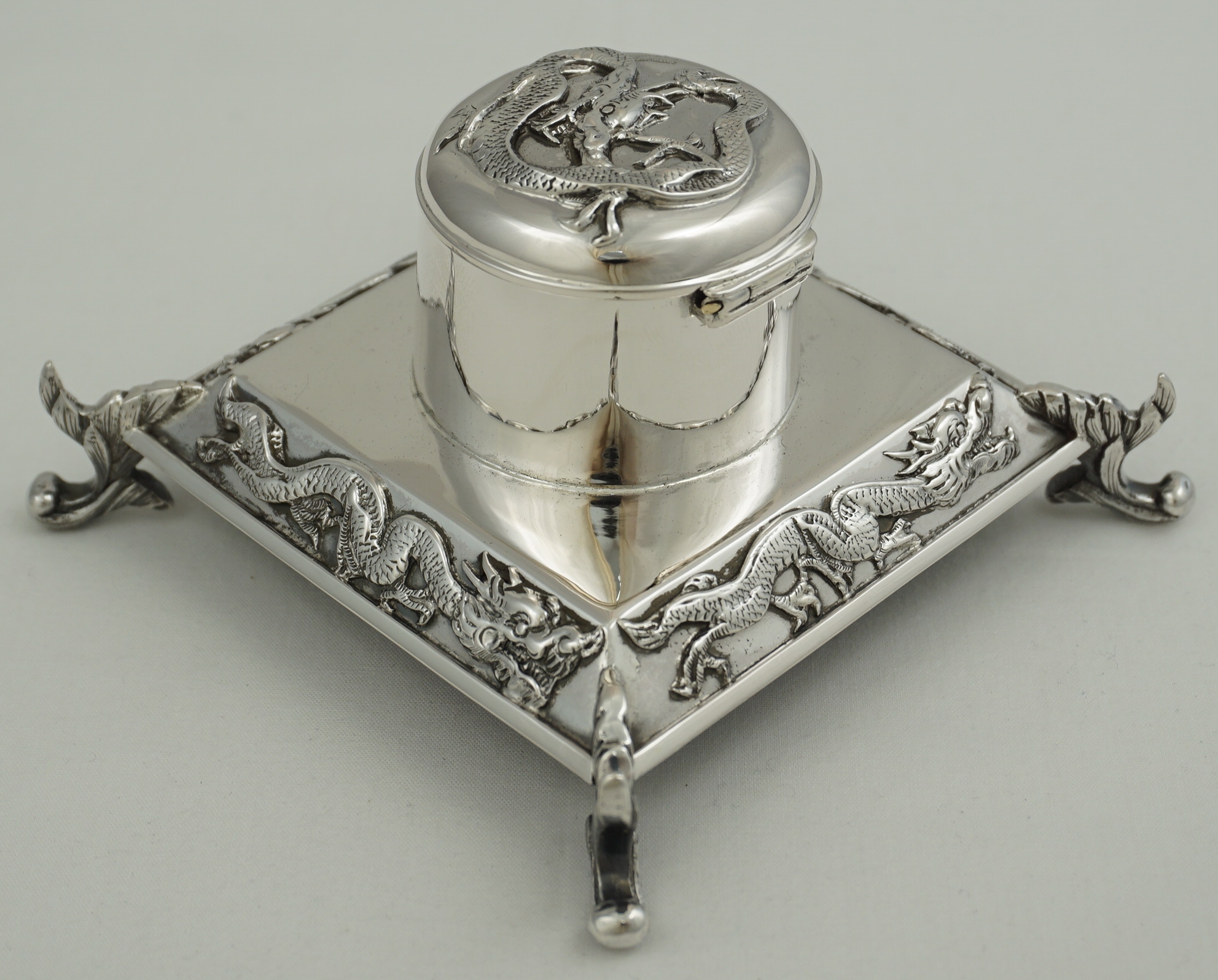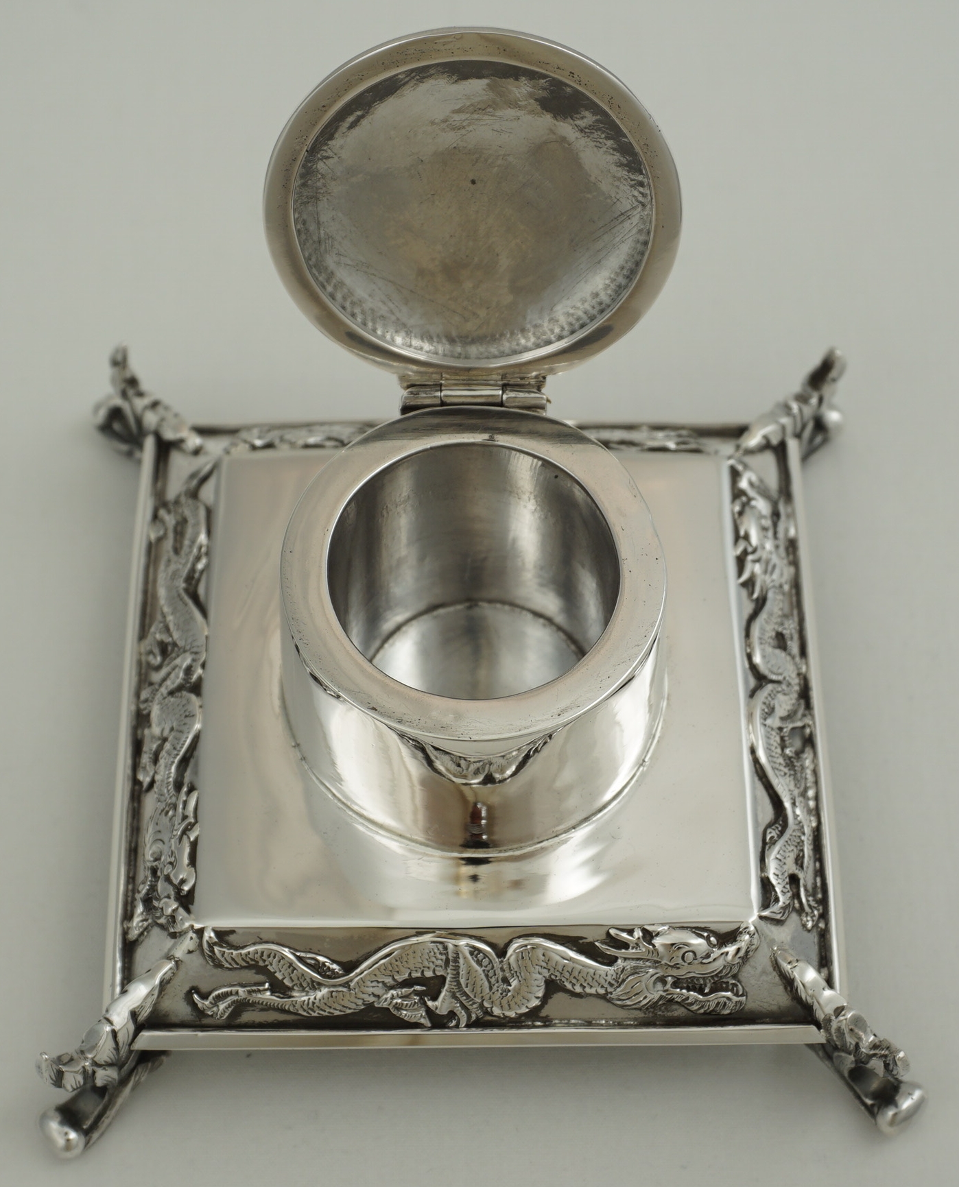 DESCRIPTION | Well detailed and good quality antique Chinese solid silver pagoda form inkwell with dragon decoration, four legs and four pen holders. Yes, I know, I wondered why only three claws per foot too and propose one or a combination of the following: the Chinese did not care as much about the number of claws as Wikipedia thinks that they did; the piece was made for general export outside of China to places where the number of claws had no meaning and three looked best with four or five too cluttered; the piece was made for the three claw preferring Japanese market that does also enjoy a bit of ink and calligraphy. |