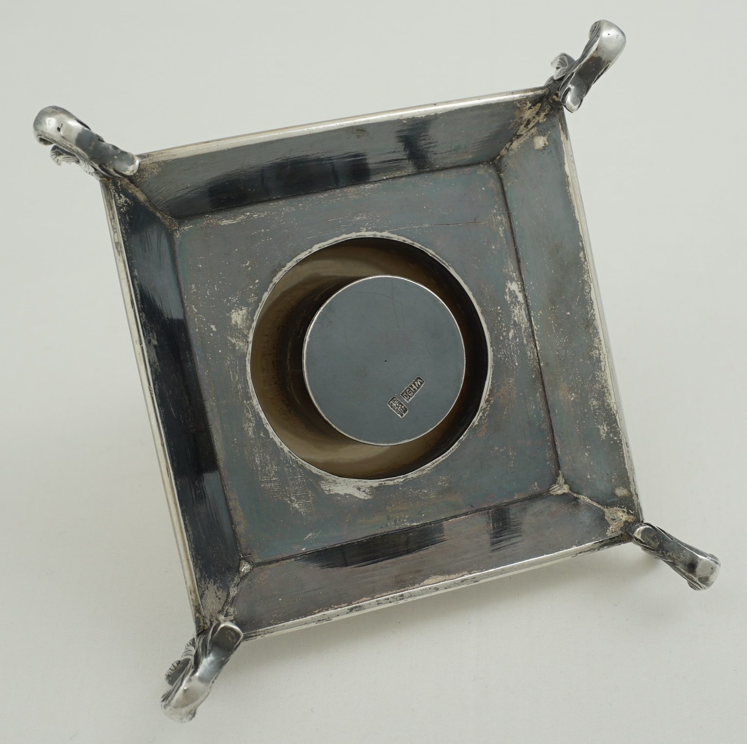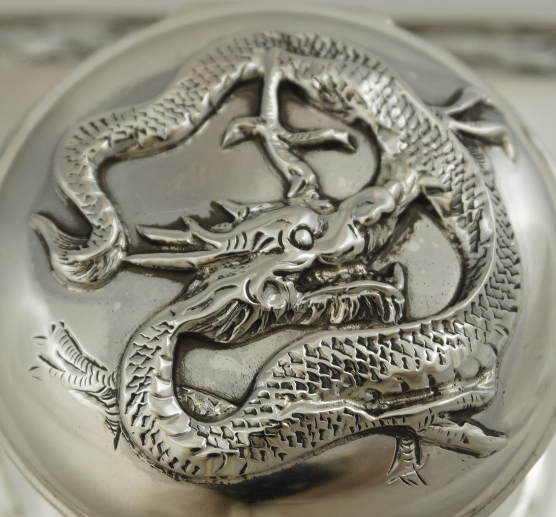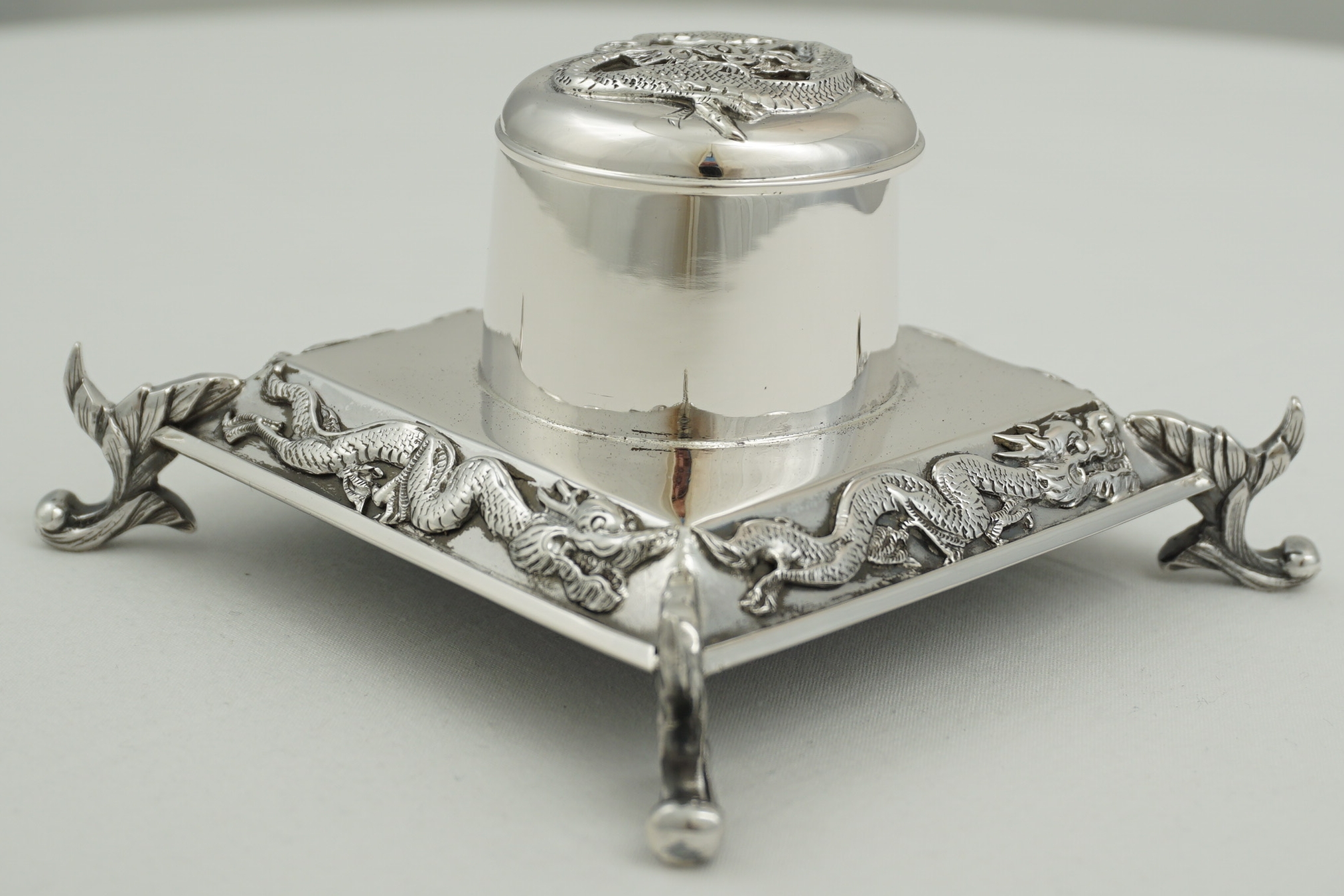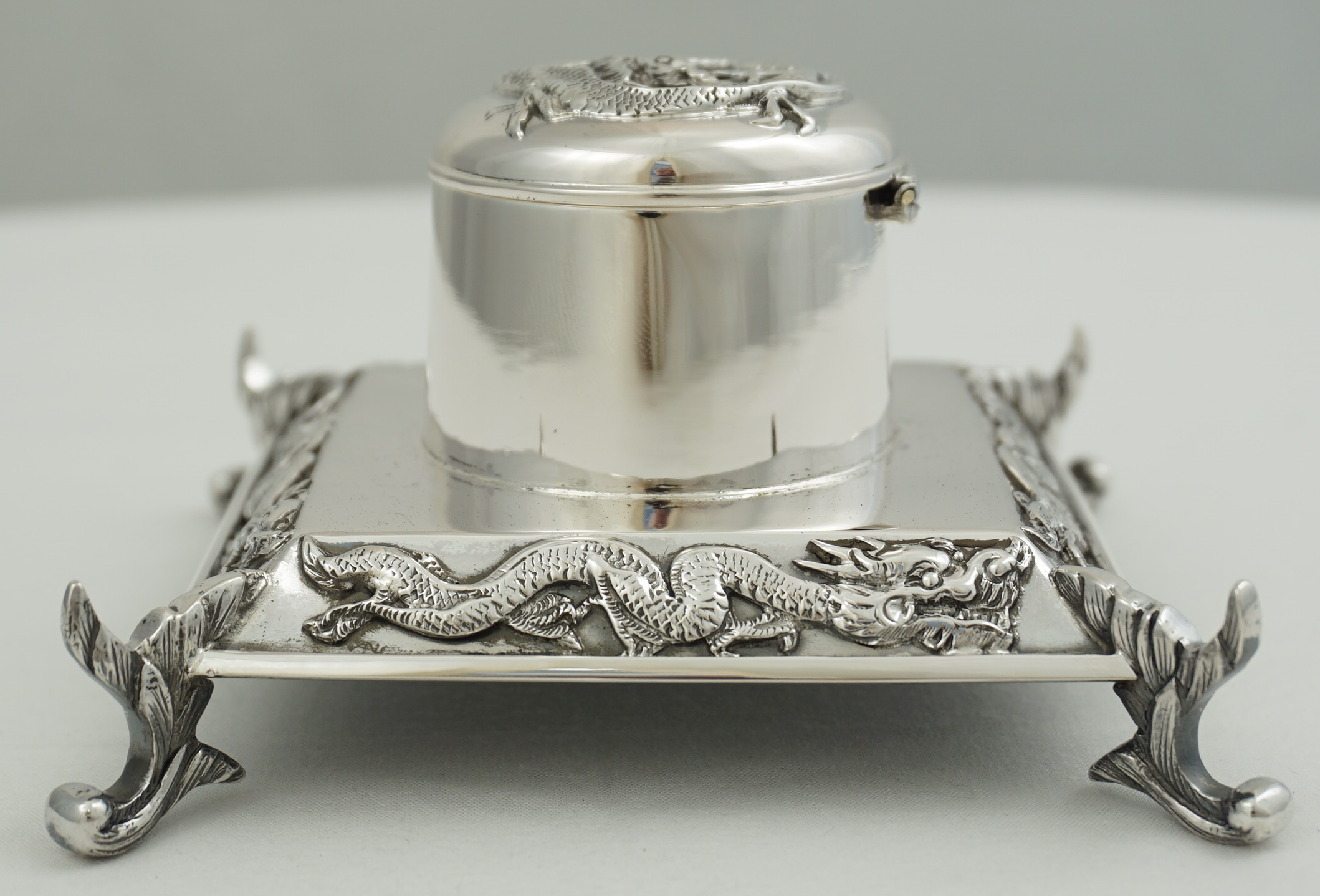 DESCRIPTION | Well detailed and good quality antique Chinese solid silver pagoda form inkwell with dragon decoration, four legs and four pen holders. Yes, I know, I wondered why only three claws per foot too and propose one or a combination of the following: the Chinese did not care as much about the number of claws as Wikipedia thinks that they did; the piece was made for general export outside of China to places where the number of claws had no meaning and three looked best with four or five too cluttered; the piece was made for the three claw preferring Japanese market that does also enjoy a bit of ink and calligraphy. |