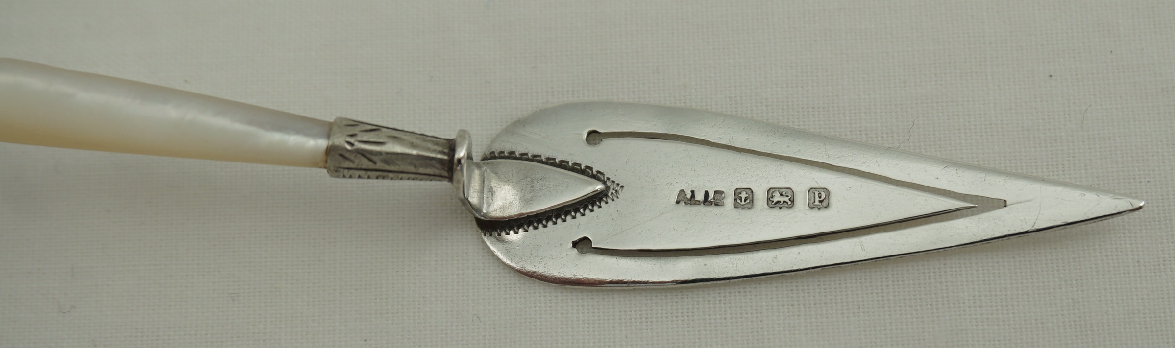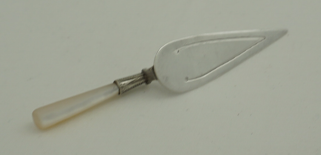 DESCRIPTION | Antique English solid sterling silver trowel form bookmark with a Mother Of Pearl handle. |