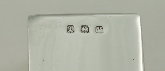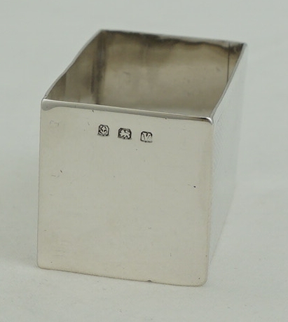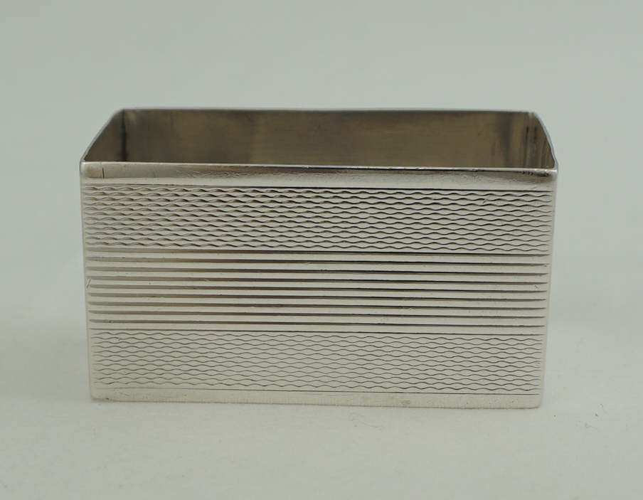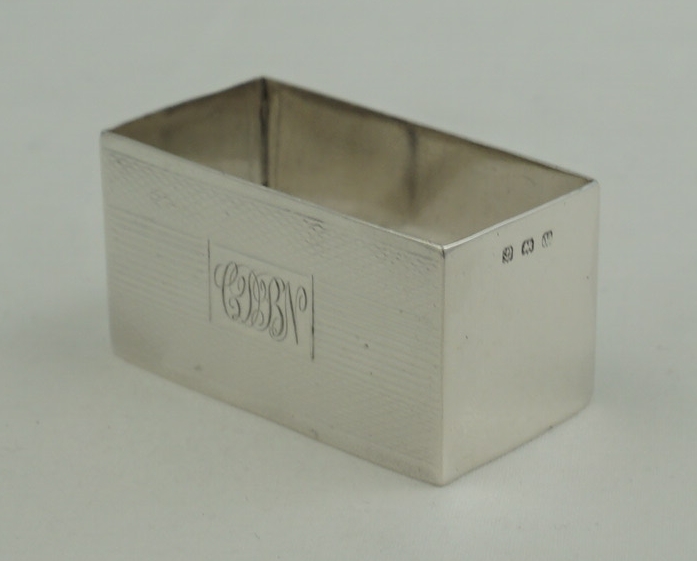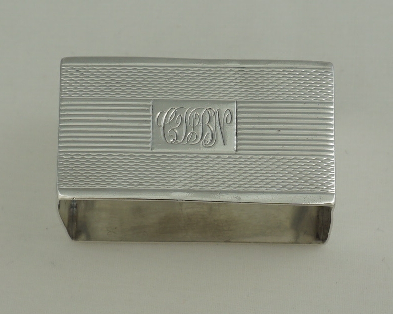 DESCRIPTION | Antique English solid sterling silver oblong napkin ring with engine turned engraved decoration and a monogram to the cartouche. |