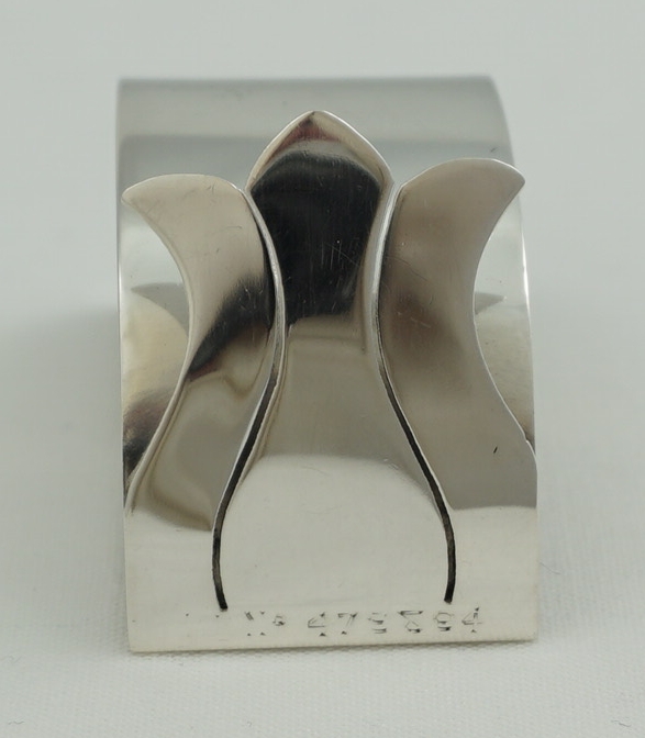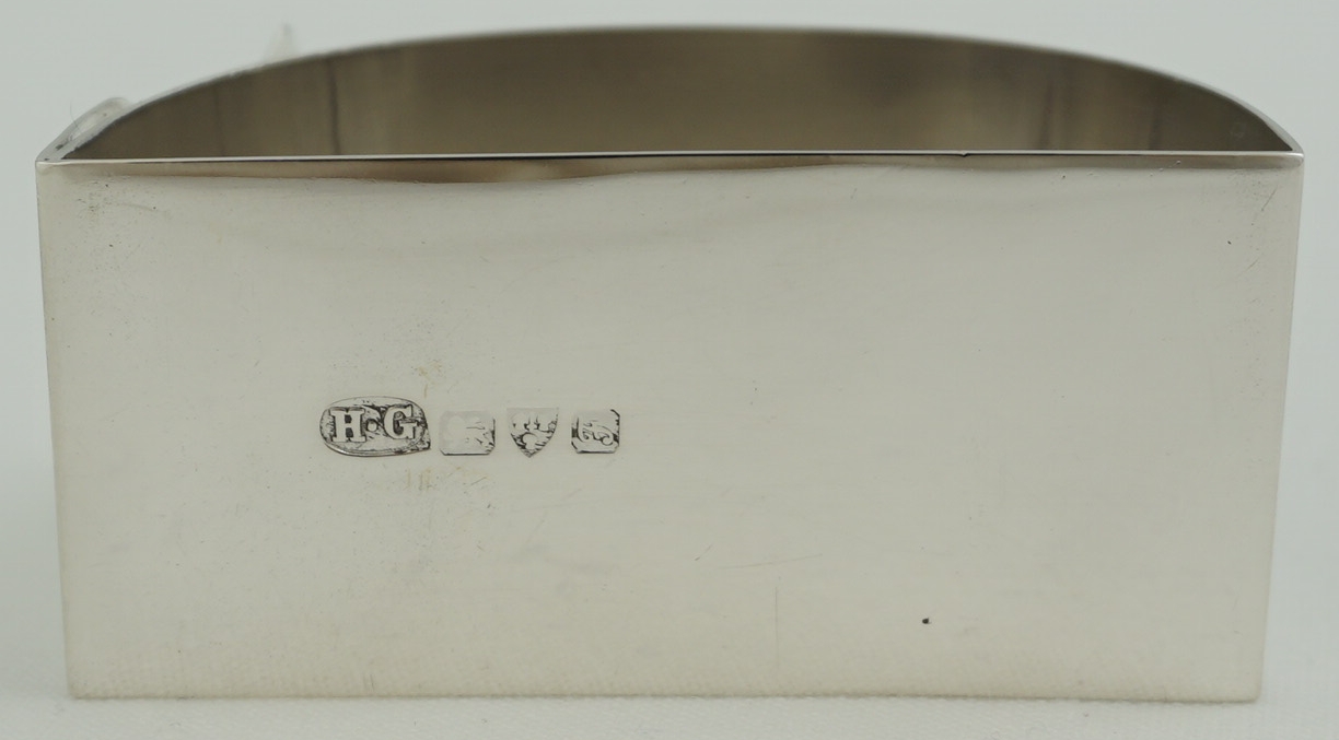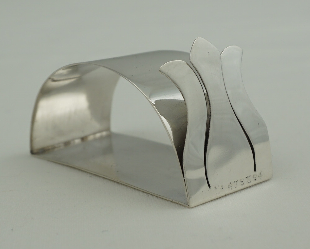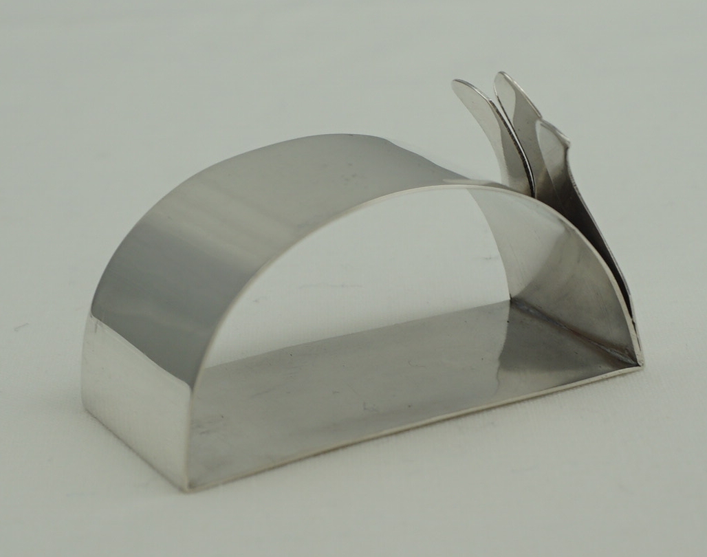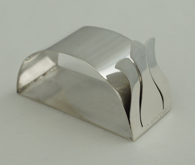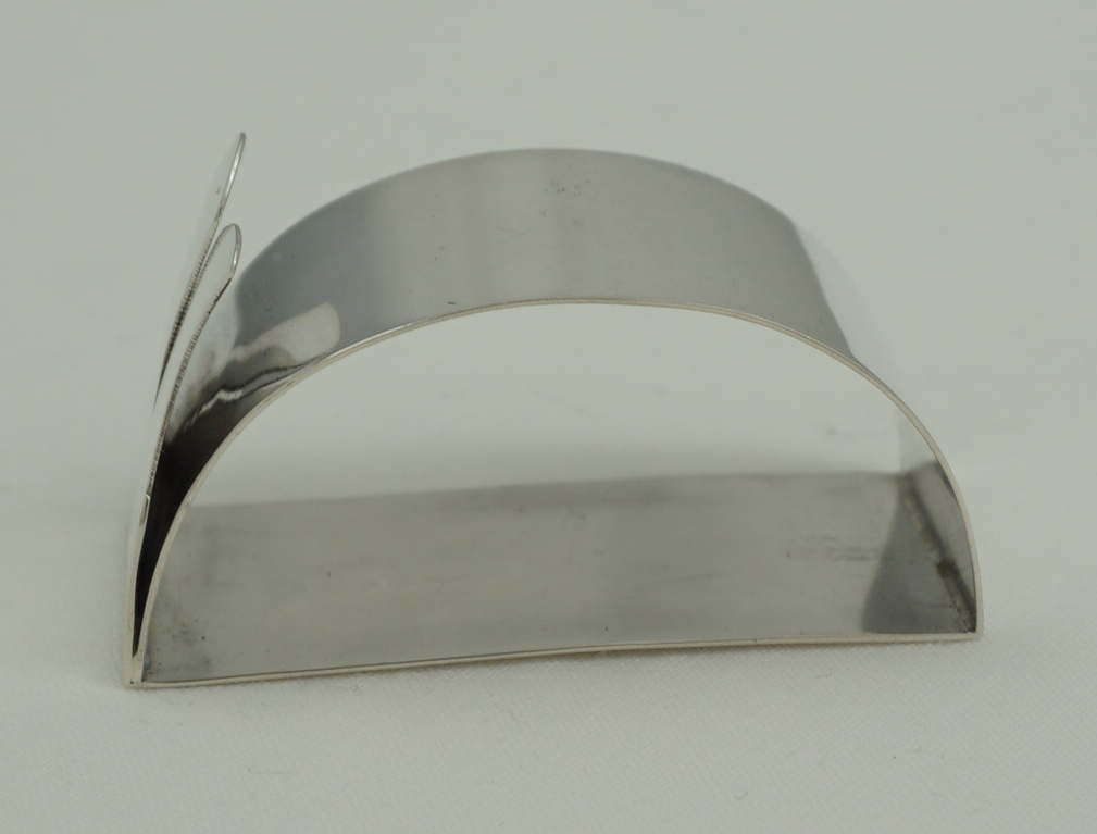 DESCRIPTION | Unusual antique English Edwardian solid sterling silver half-round napkin ring with an end clip. I suspect that this clip would hold a card naming the person designated to sit at that place or the upcoming menu. |