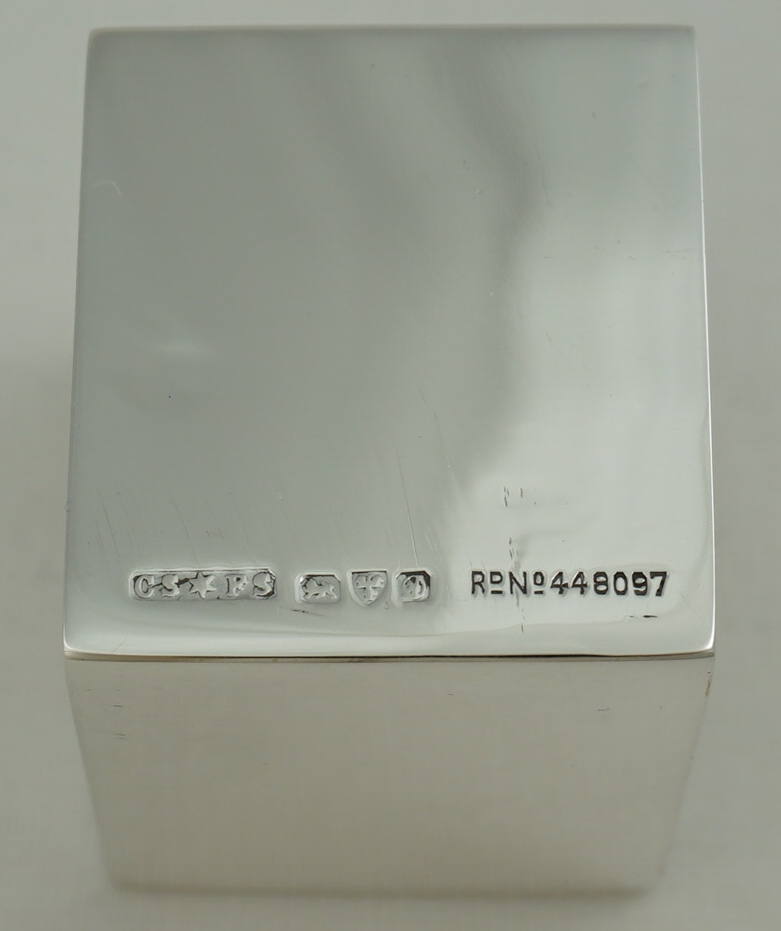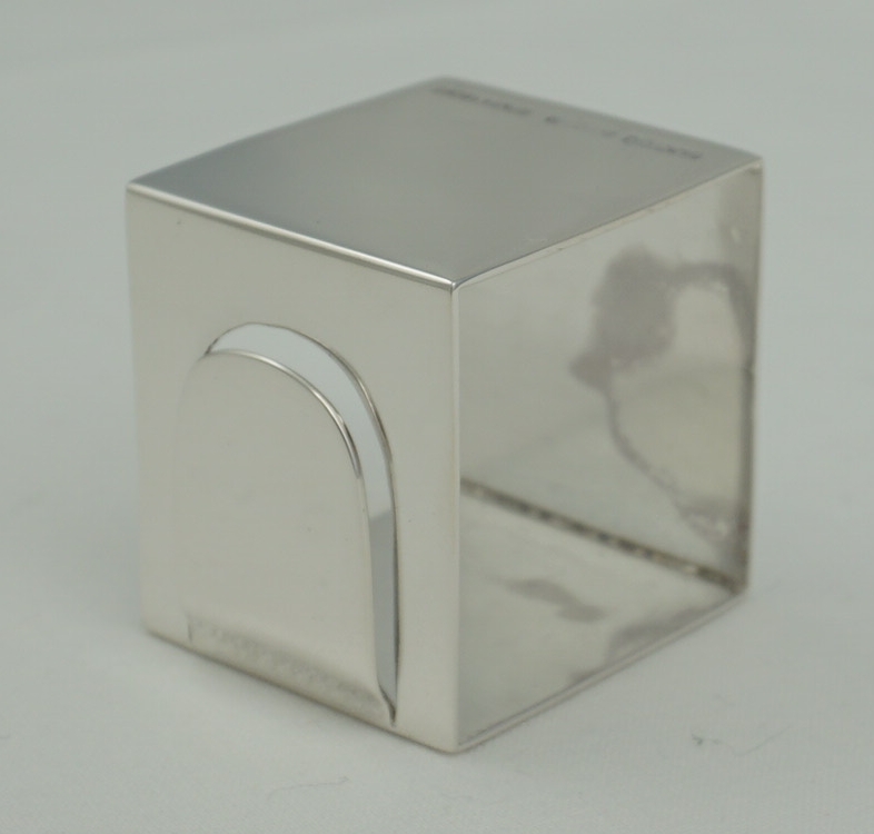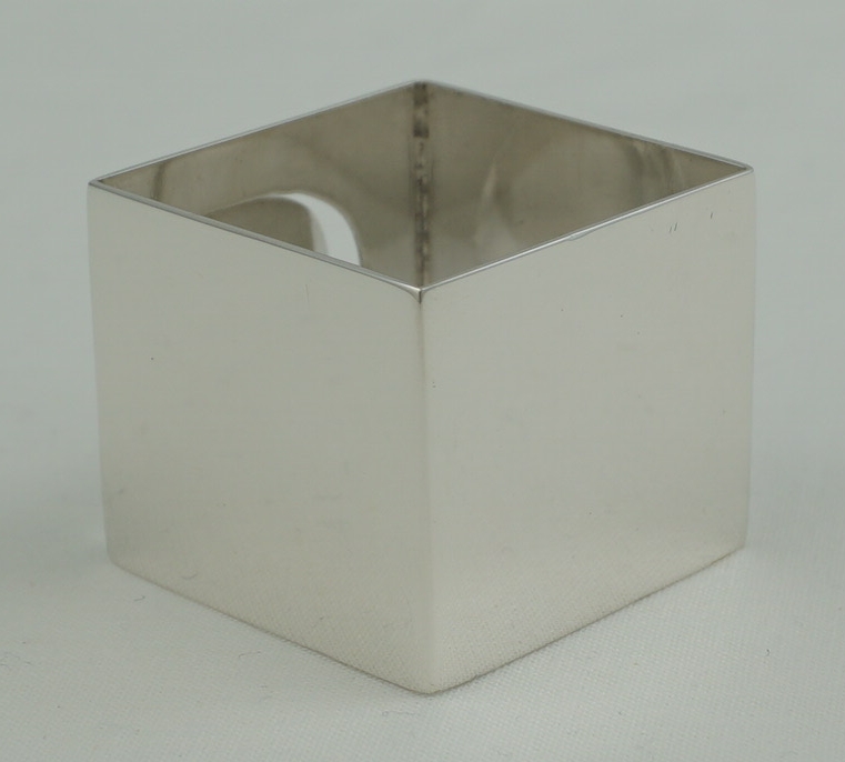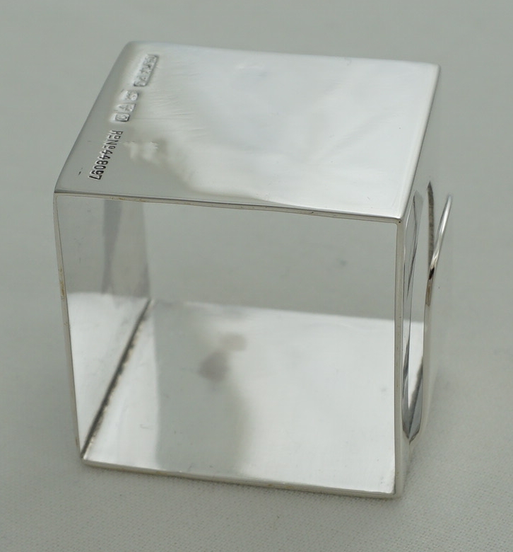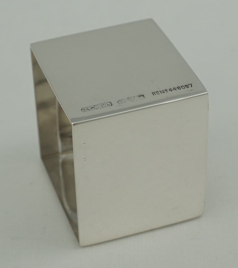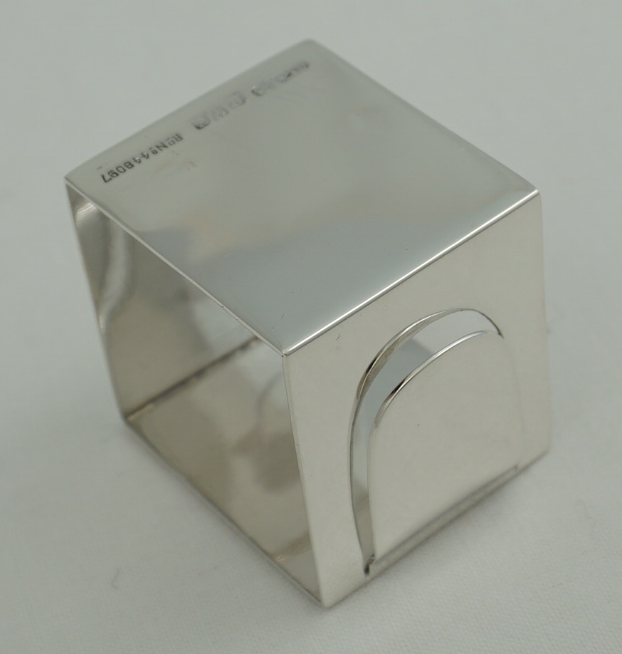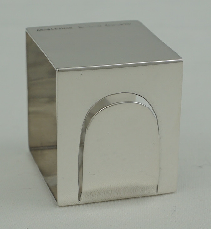 DESCRIPTION | Unusual vintage English solid sterling silver cube form napkin ring with an end clip. I suspect that this clip would hold a card naming the person designated to sit at that place or the upcoming menu. |