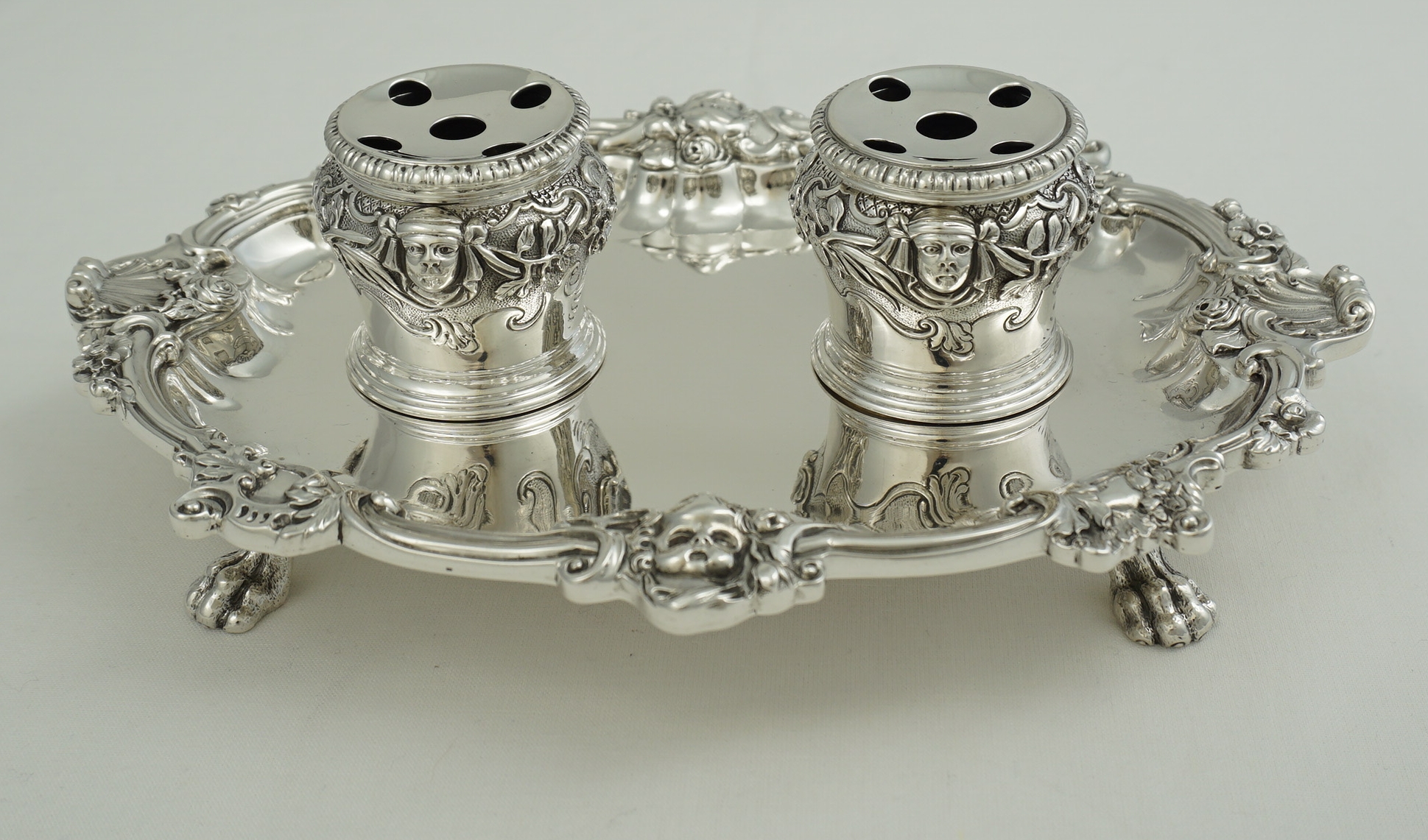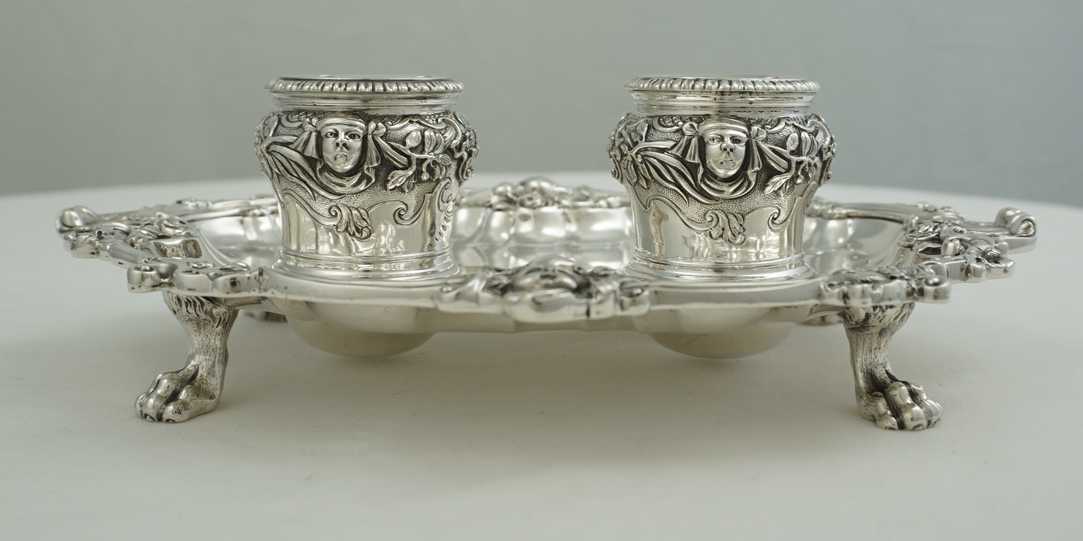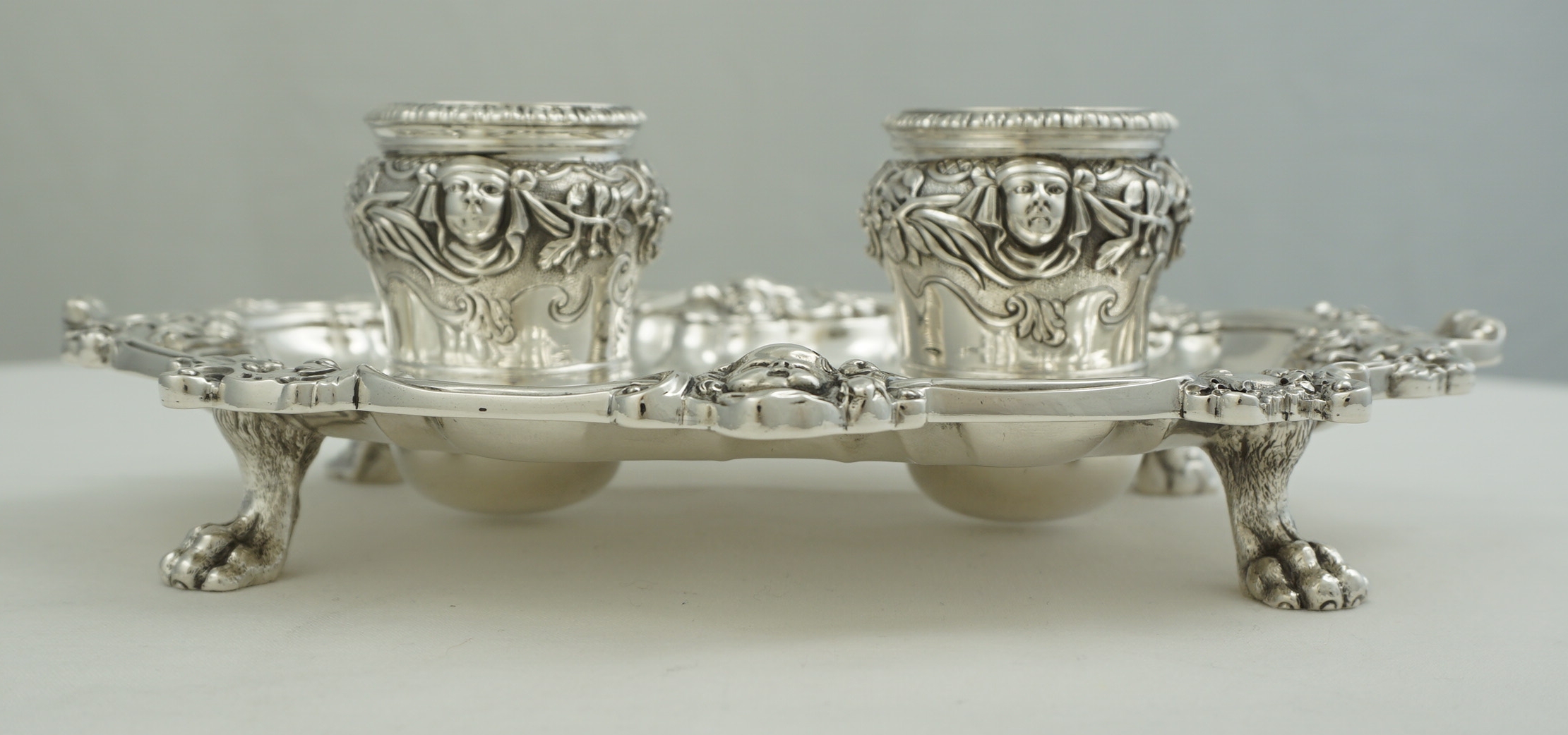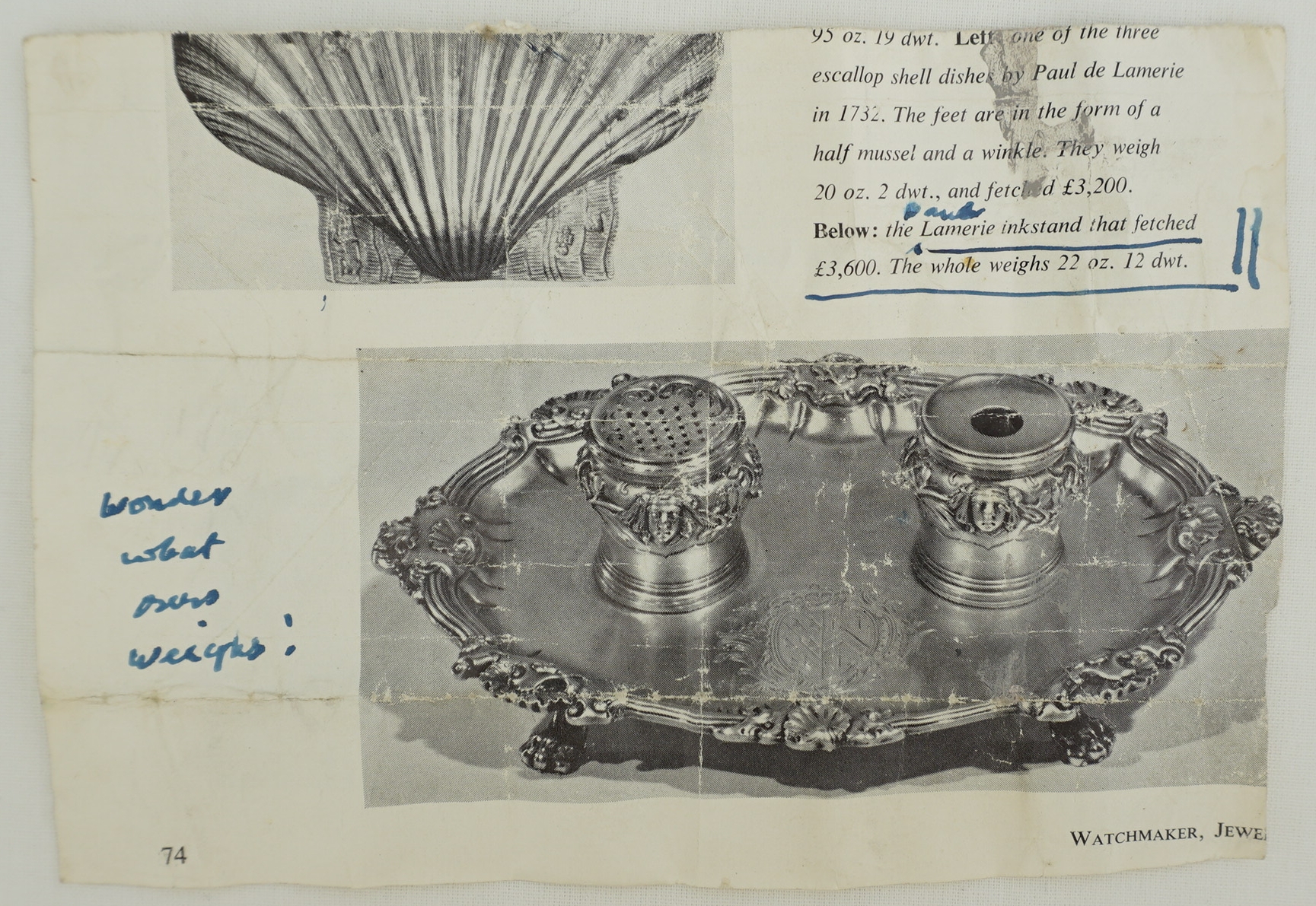 DESCRIPTION | Superb quality and significantly heavy antique English solid sterling silver reproduction of a rococo Paul de Lamerie inkstand from around 1741. There is an original at the V&A item no;0104037 Inkstand | Paul de Lamerie | V&A Explore The Collections. Another of the same weight as this example was sold at auction in 1960 for £3,600 (at the time a nice 3-bedroomed bungalow on the South Downs would have cost less). The magazine clipping is from May 1960. |