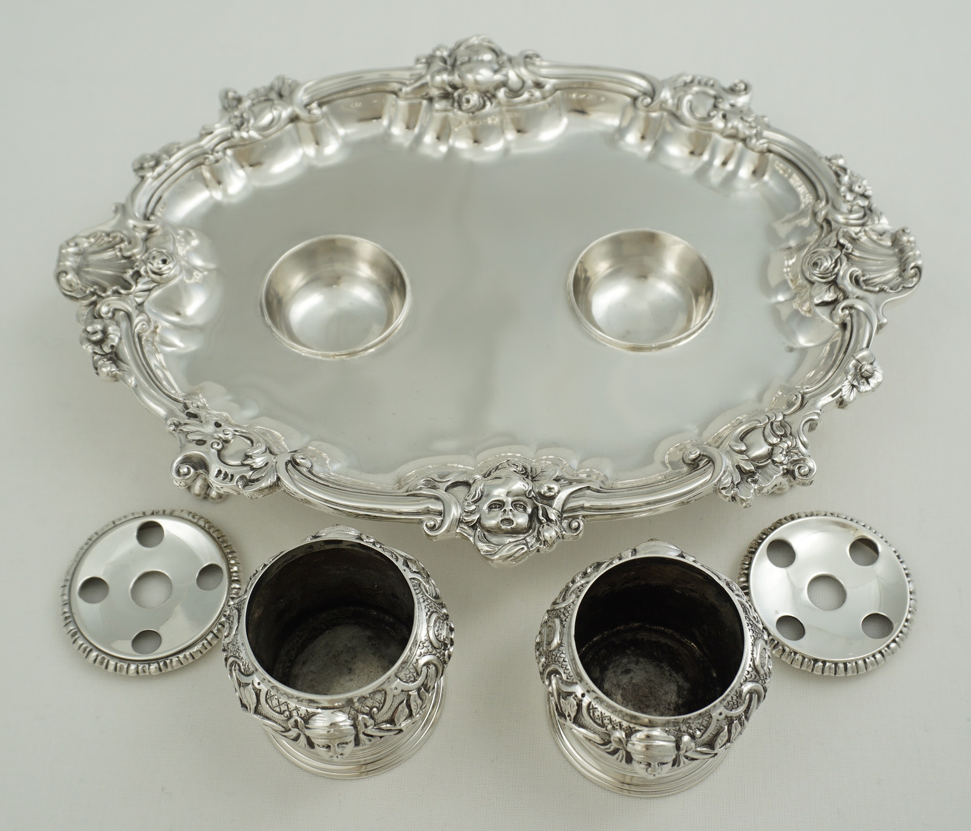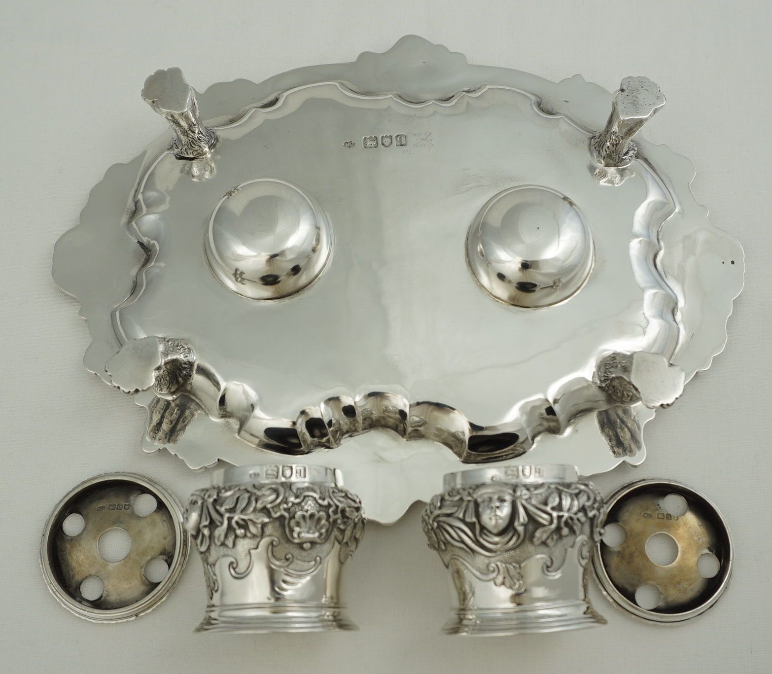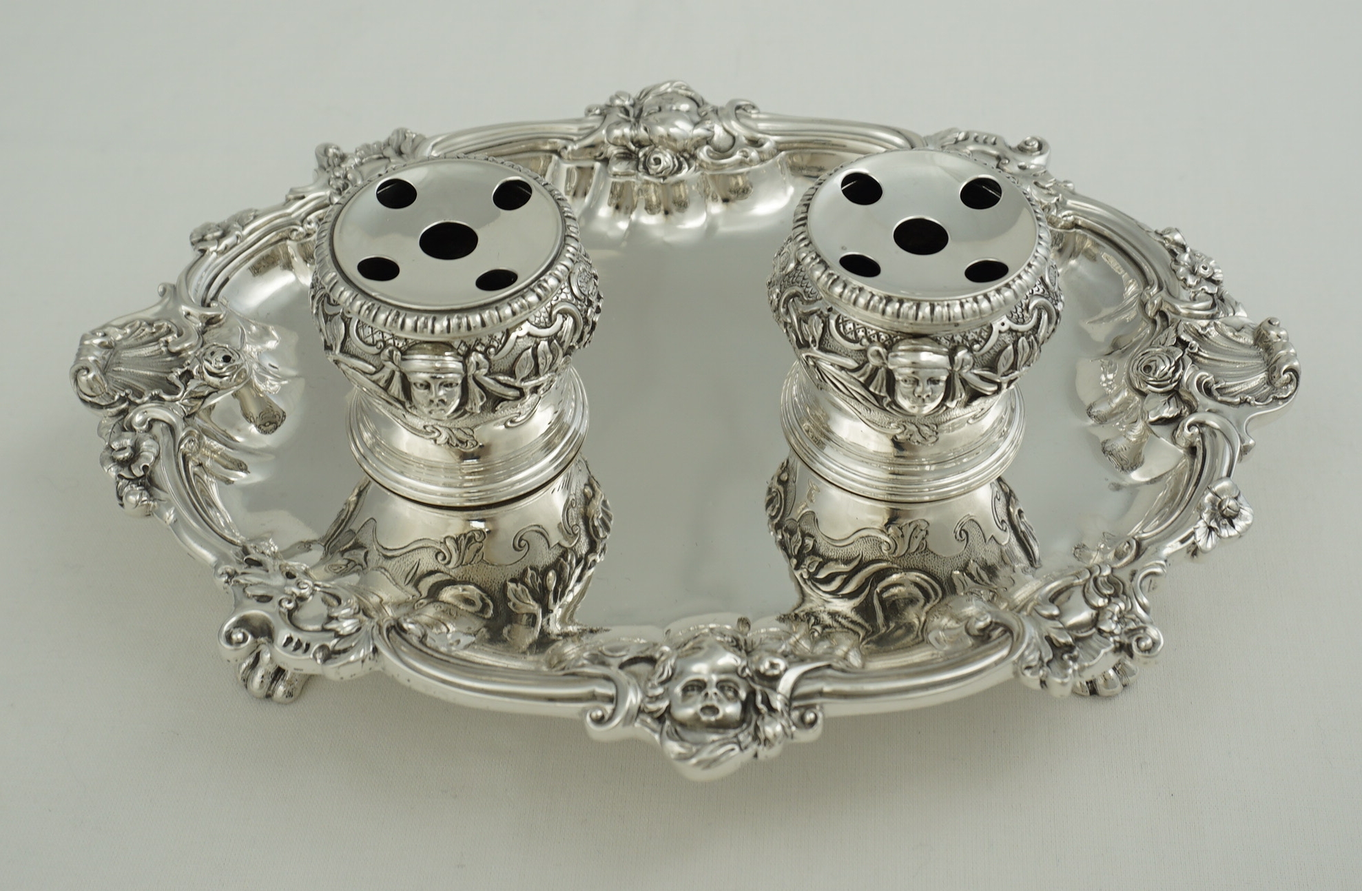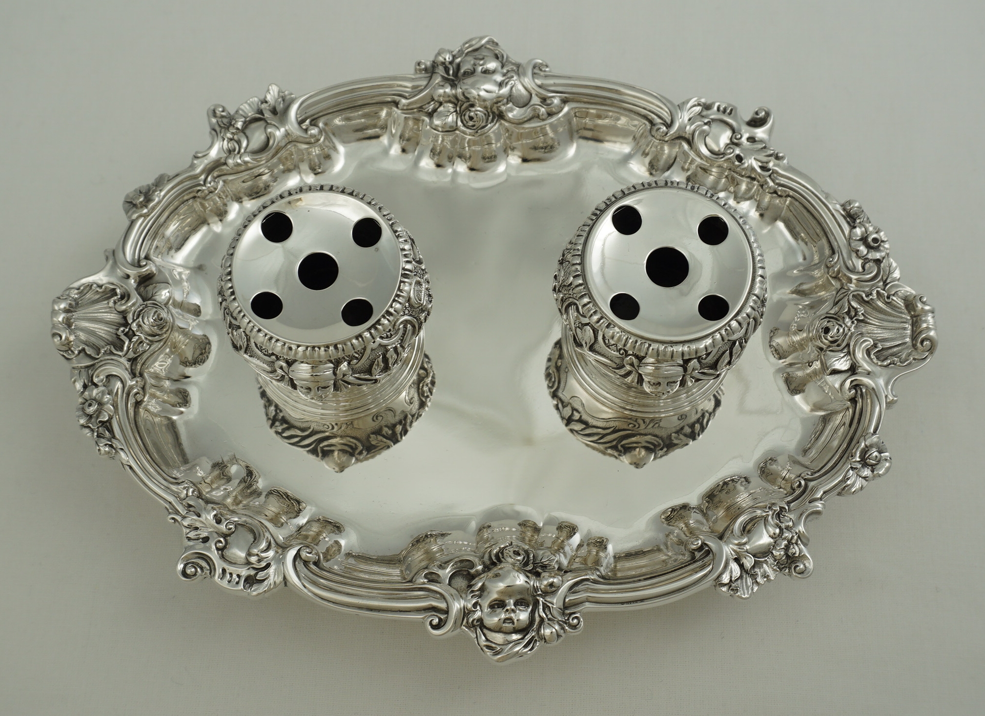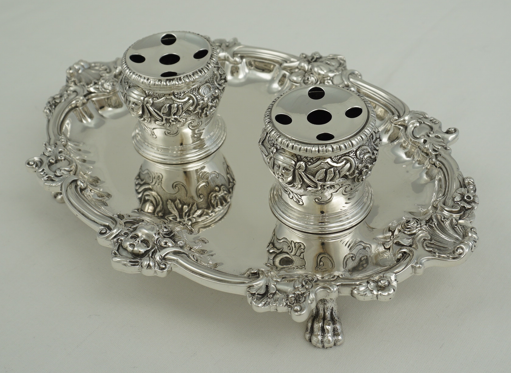 DESCRIPTION | Superb quality and significantly heavy antique English solid sterling silver reproduction of a rococo Paul de Lamerie inkstand from around 1741. There is an original at the V&A item no;0104037 Inkstand | Paul de Lamerie | V&A Explore The Collections. Another of the same weight as this example was sold at auction in 1960 for £3,600 (at the time a nice 3-bedroomed bungalow on the South Downs would have cost less). The magazine clipping is from May 1960. |