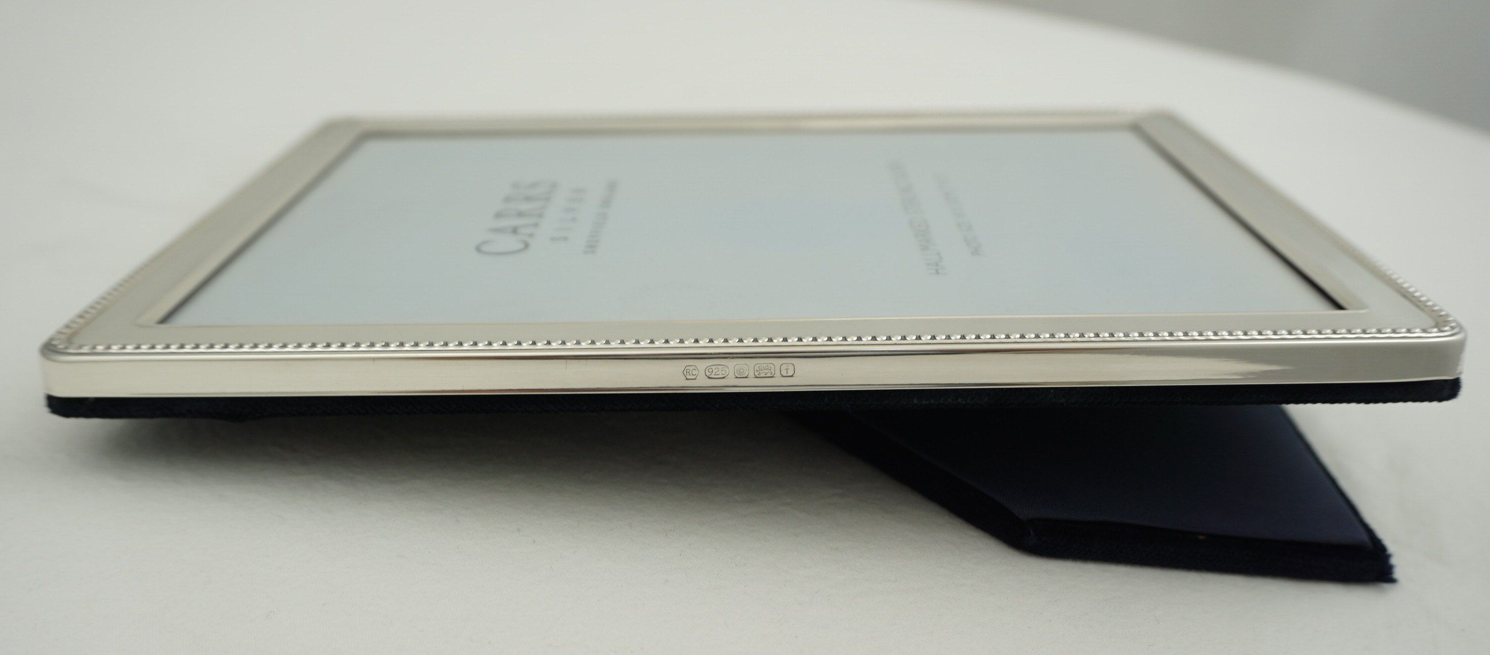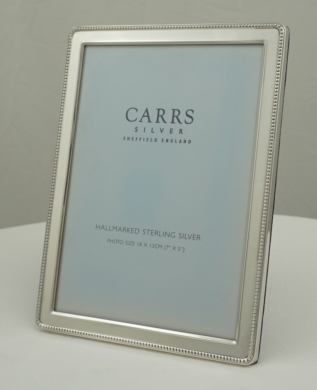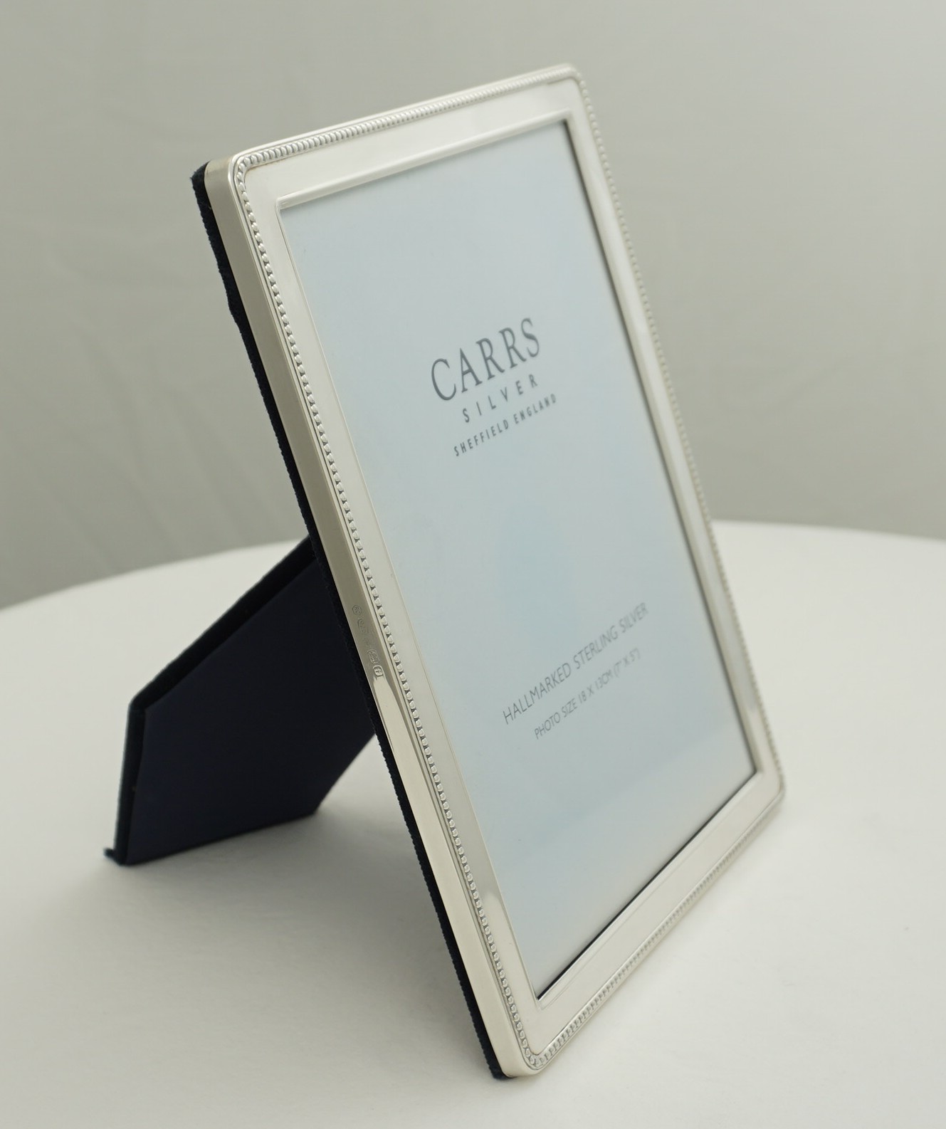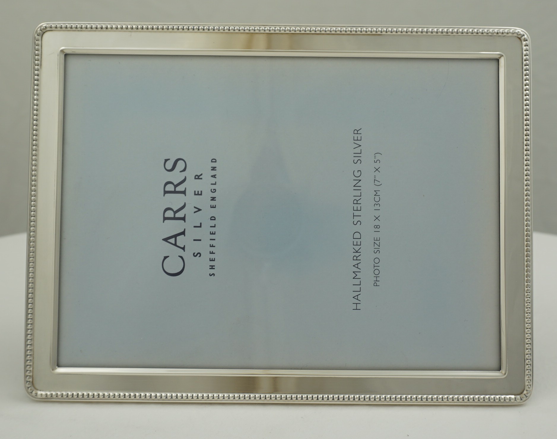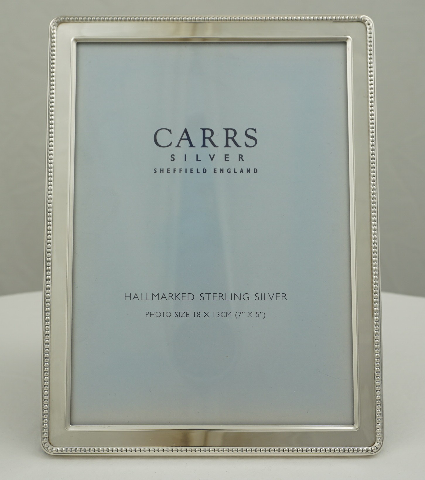 | DESCRIPTION | Perfect solid sterling silver mounted photograph frame with bead edge decoration and a felt strut back that works landscape and portrait. Carrs Silverware currently sell a similar frame for £348. |