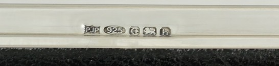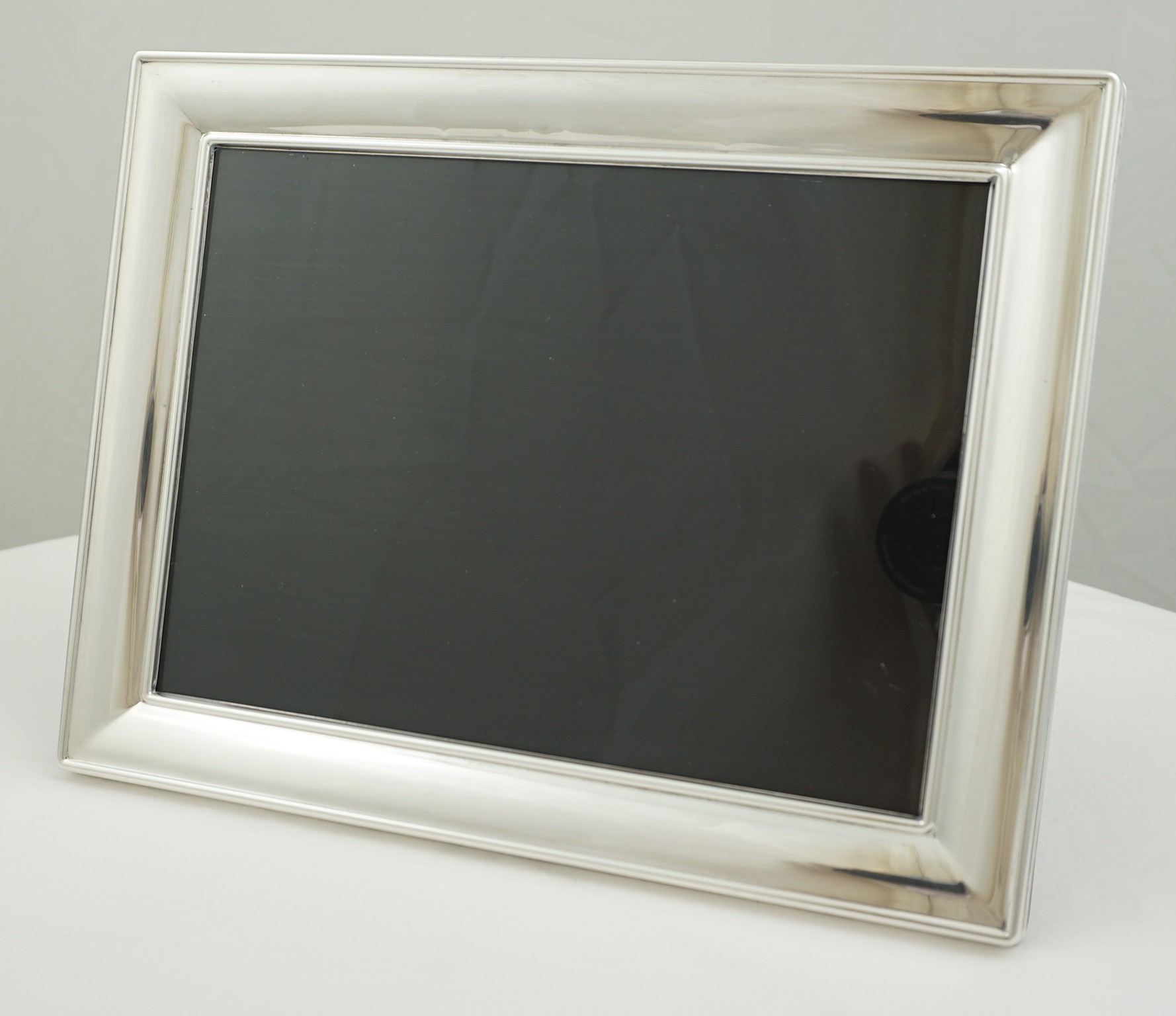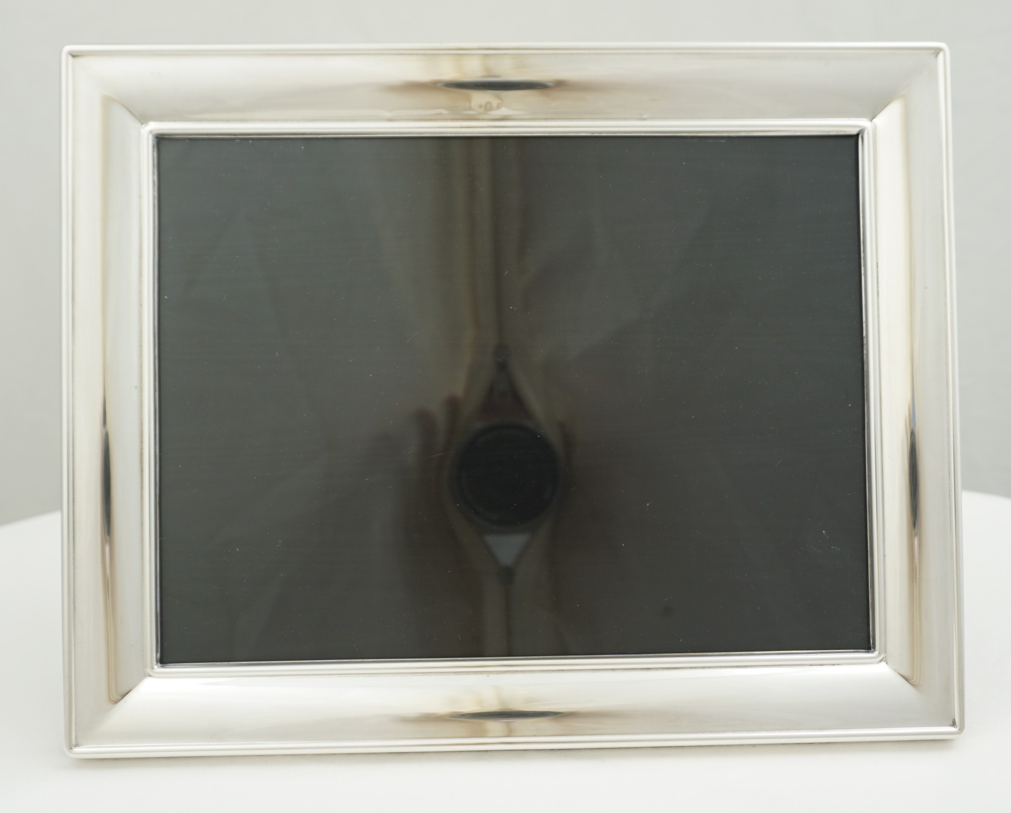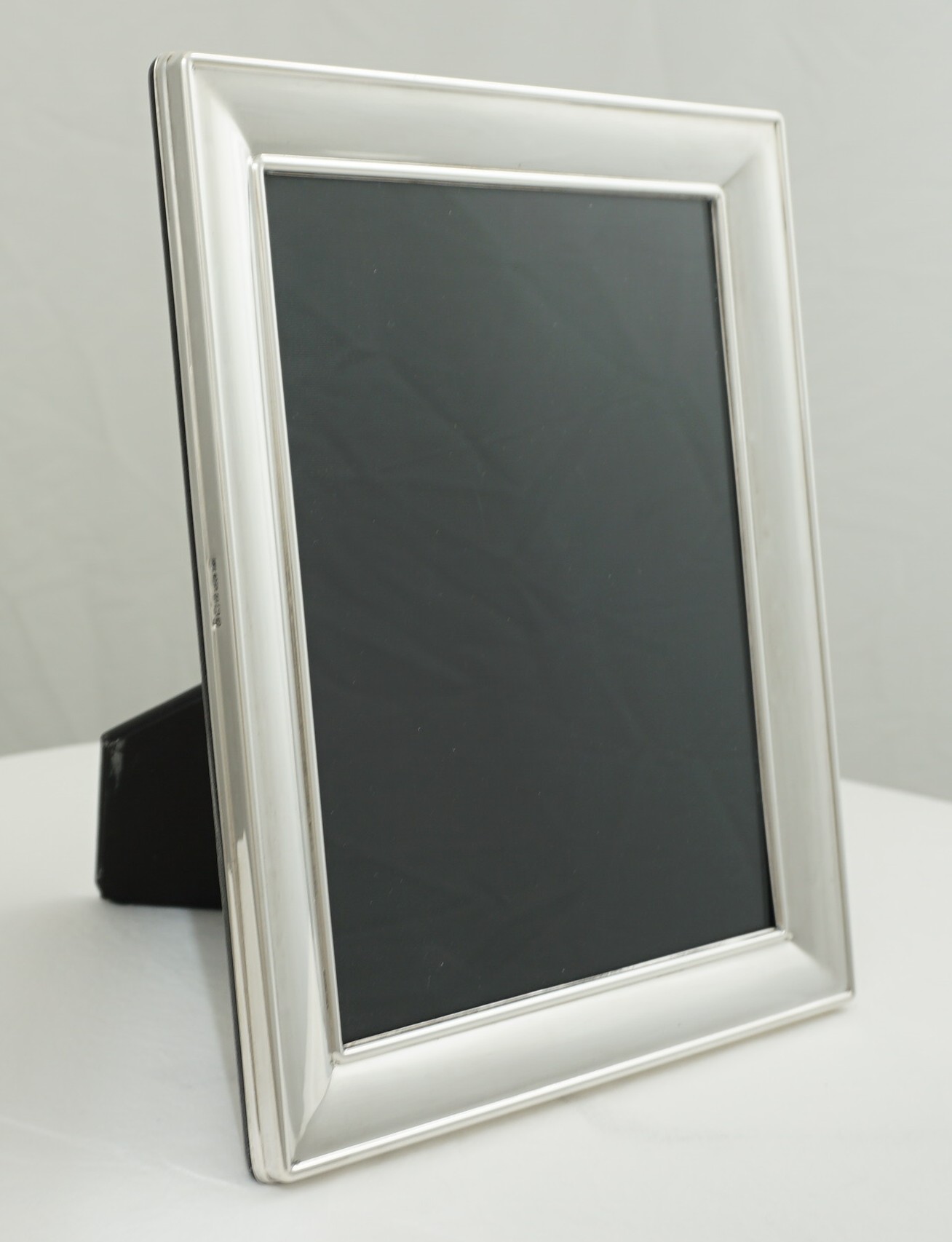 | DESCRIPTION | Good quality solid sterling silver mounted wide and plain border photograph frame with a black strut back that works landscape and portrait. |