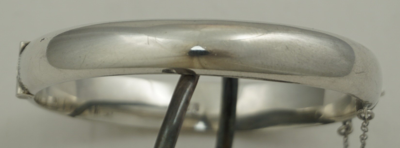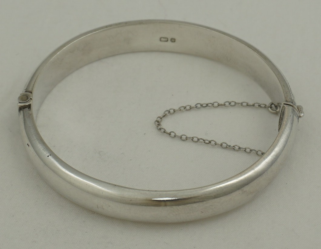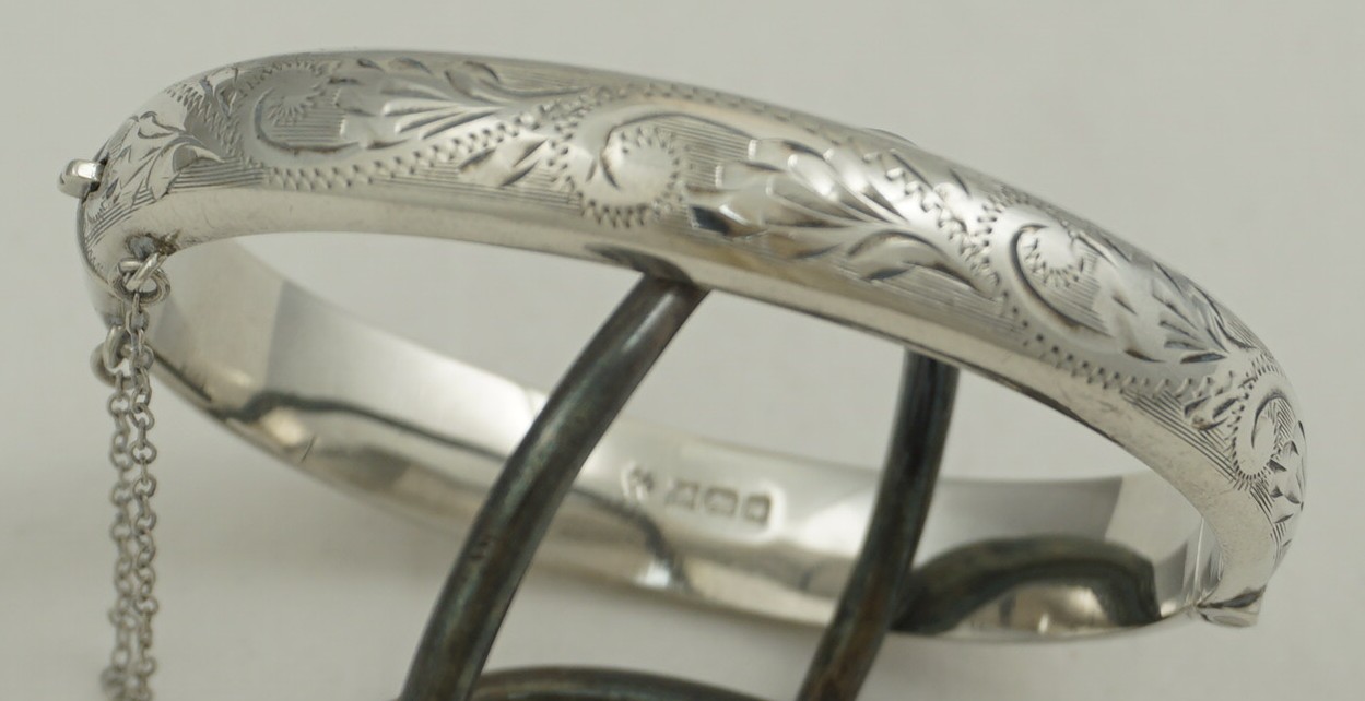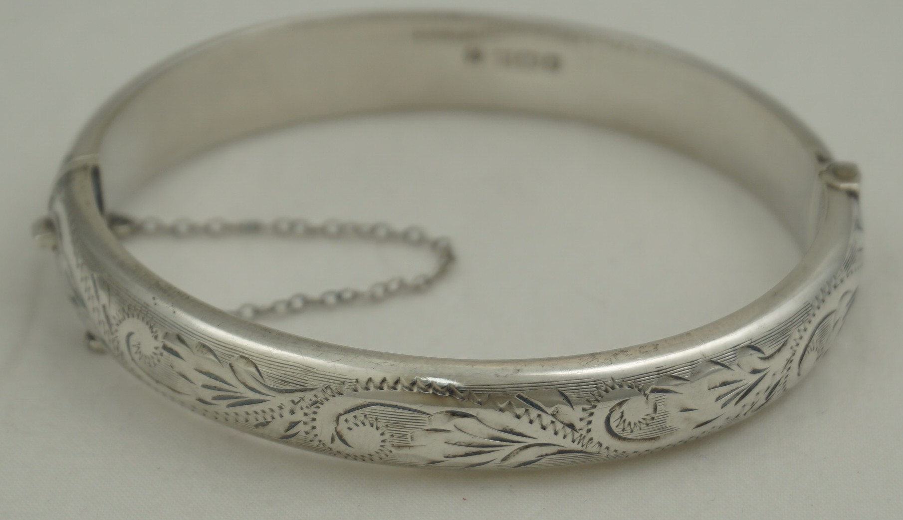 | DESCRIPTION | Attractive vintage sterling silver hinged bangle with bright cut engraved foliate decoration and safety chain. |
