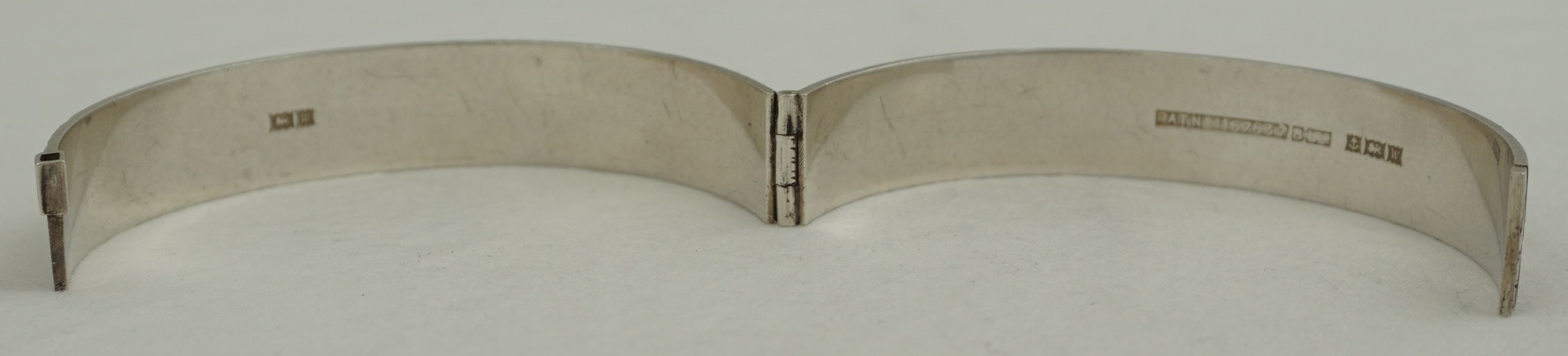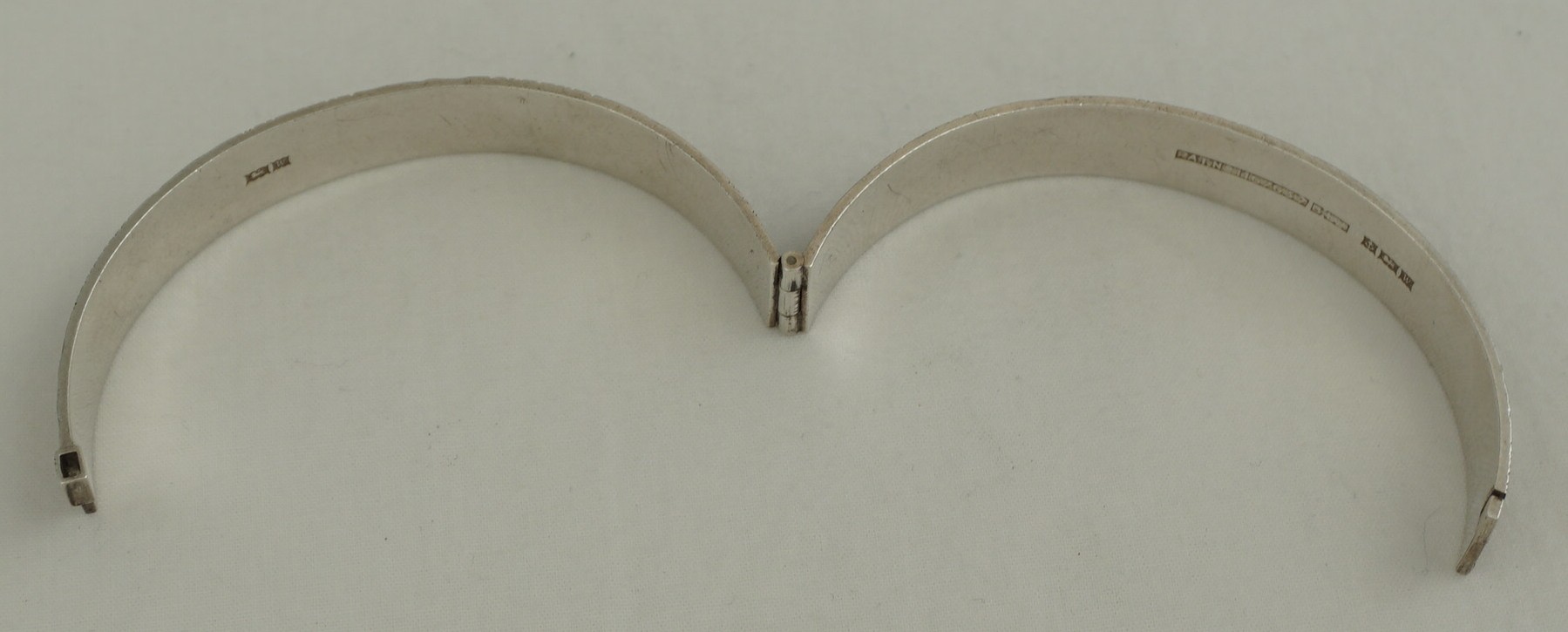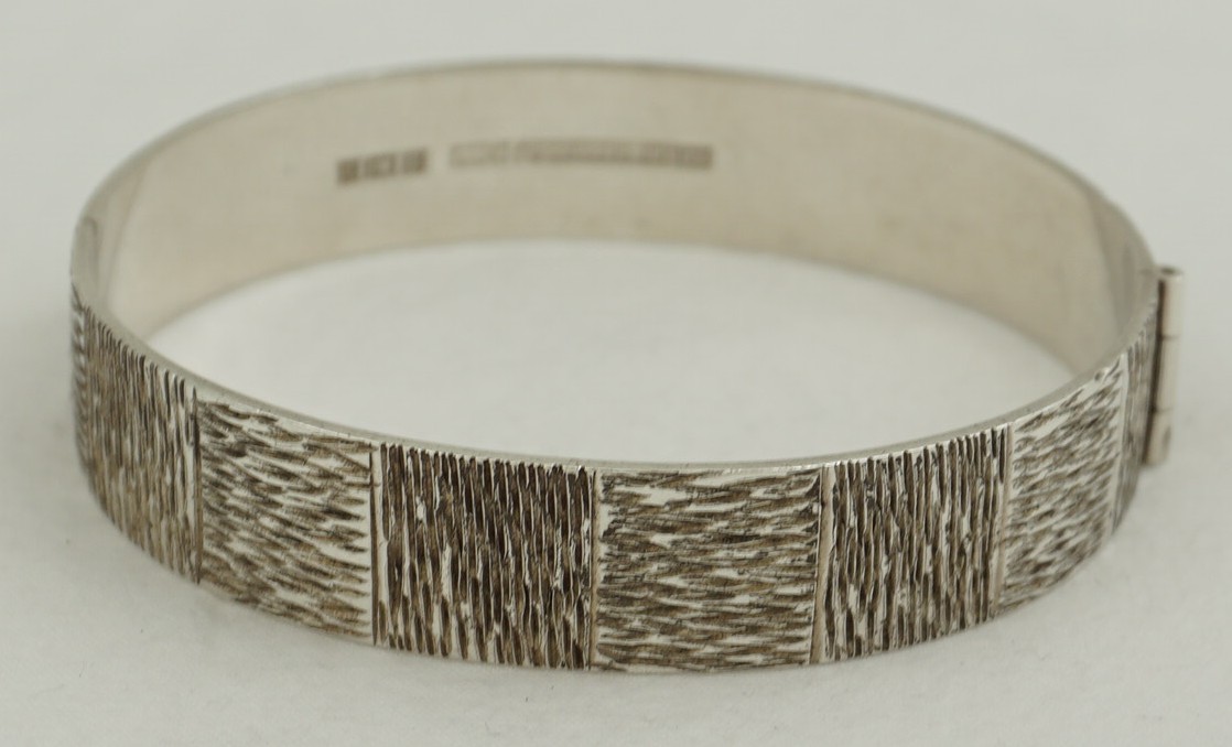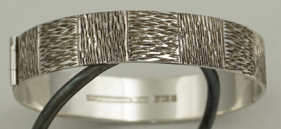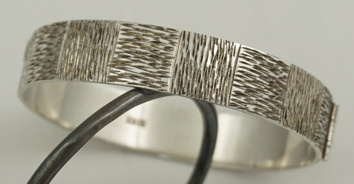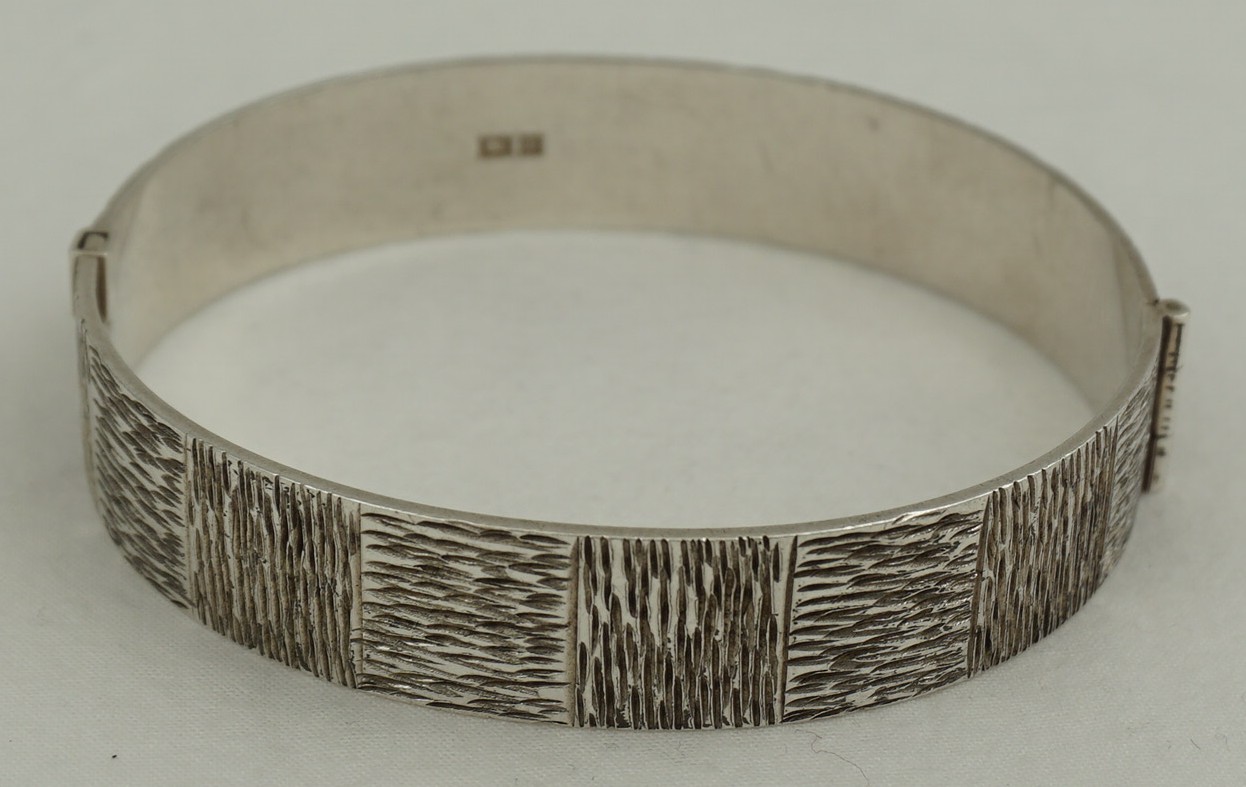 | DESCRIPTION | High quality, heavy and attractive vintage sterling silver hinged bangle with textured bark decoration. This decorative style was popular during the 1960s and 1970s and was usually gilded. Away from my photographic lights there is more than a hint of gilding so I expect that this was also once brightly gilded that has now mostly rubbed and darkened to a mellow golden tinge. |
