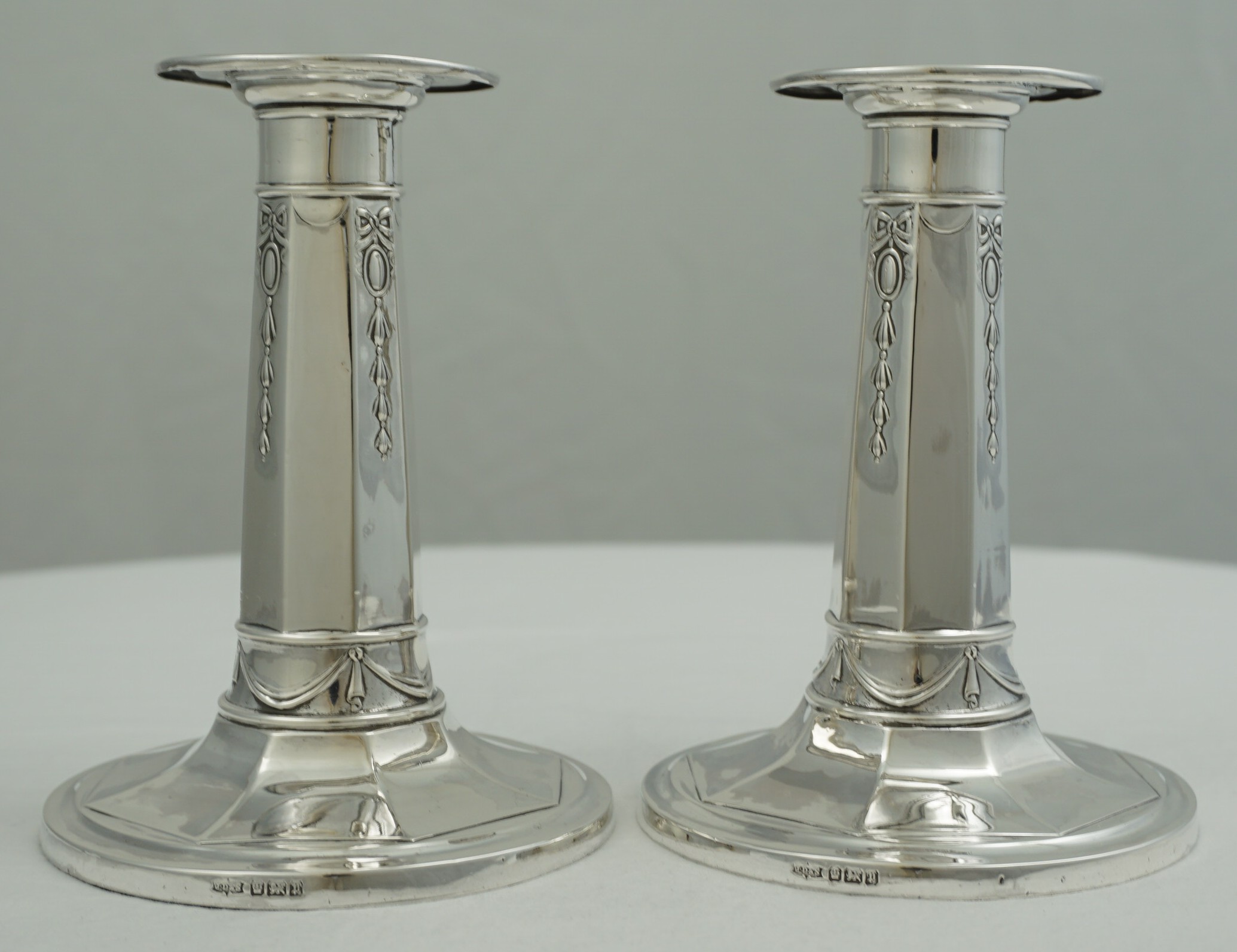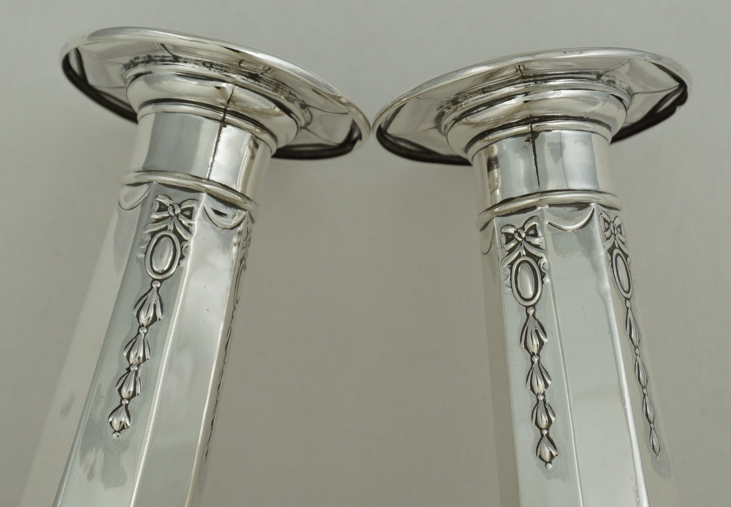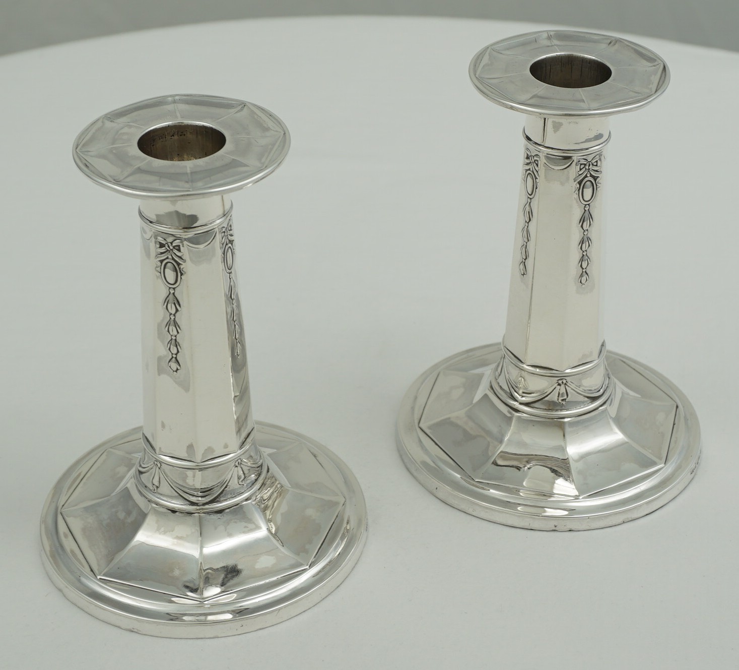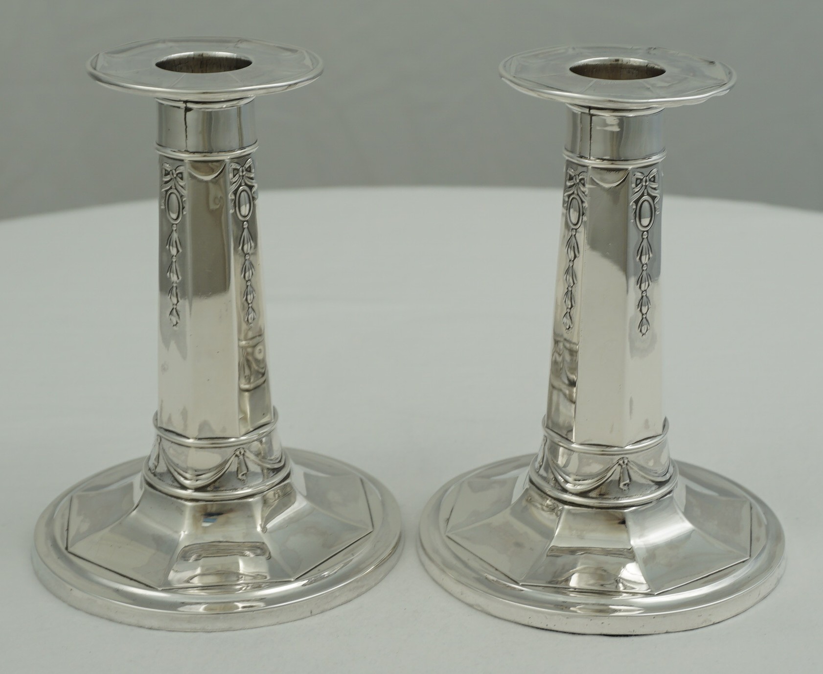 | DESCRIPTION | Stylish pair of antique English Edwardian loaded sterling silver candlesticks with swag decoration and weighted bases. |