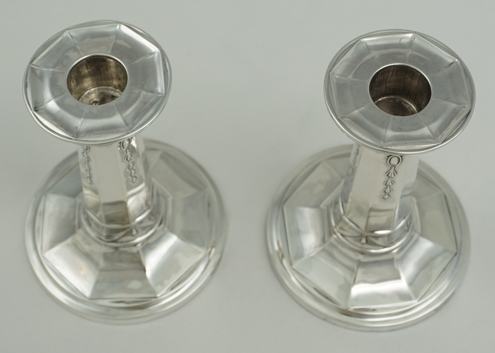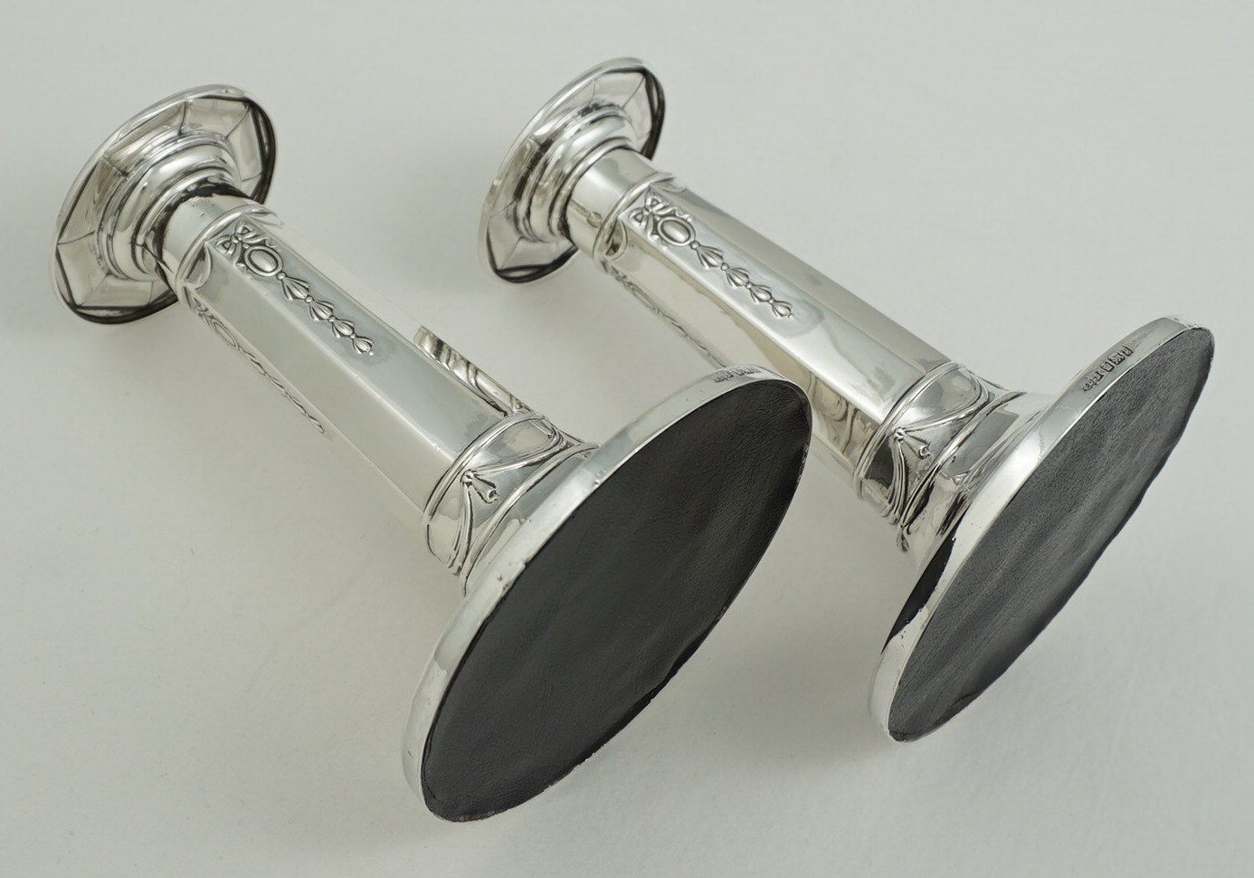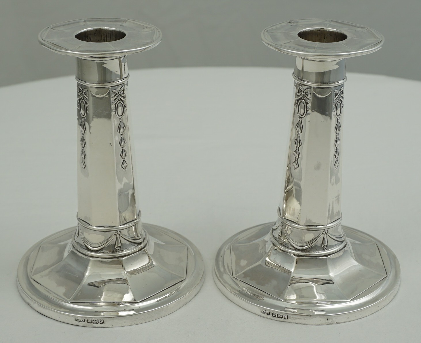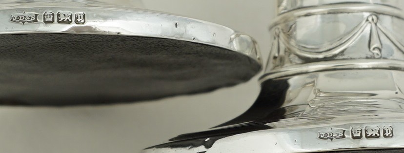 | DESCRIPTION | Stylish pair of antique English Edwardian loaded sterling silver candlesticks with swag decoration and weighted bases. |