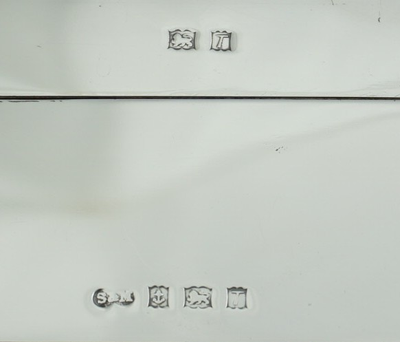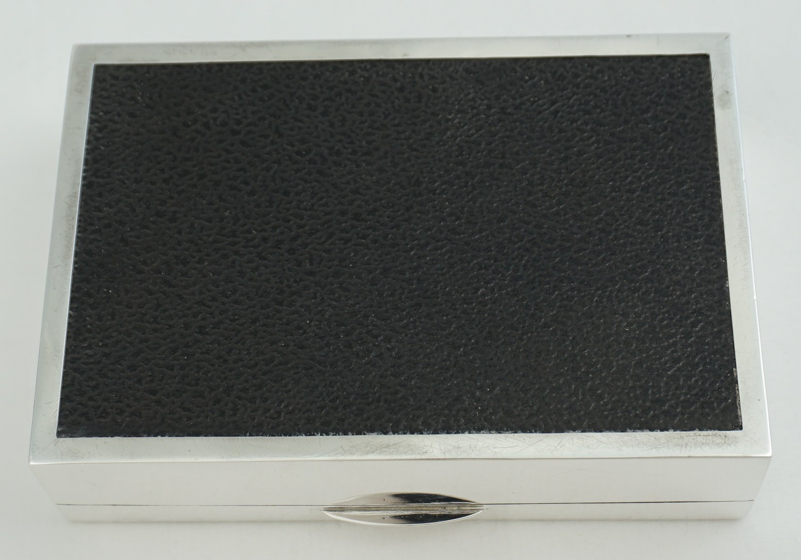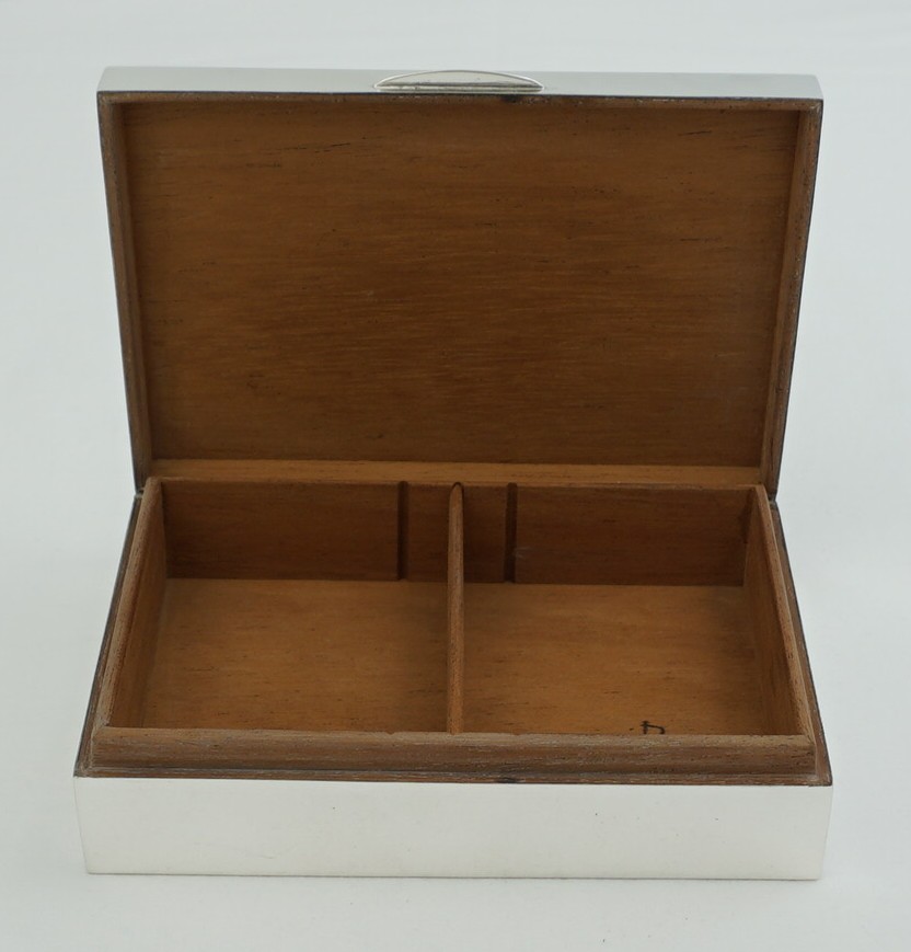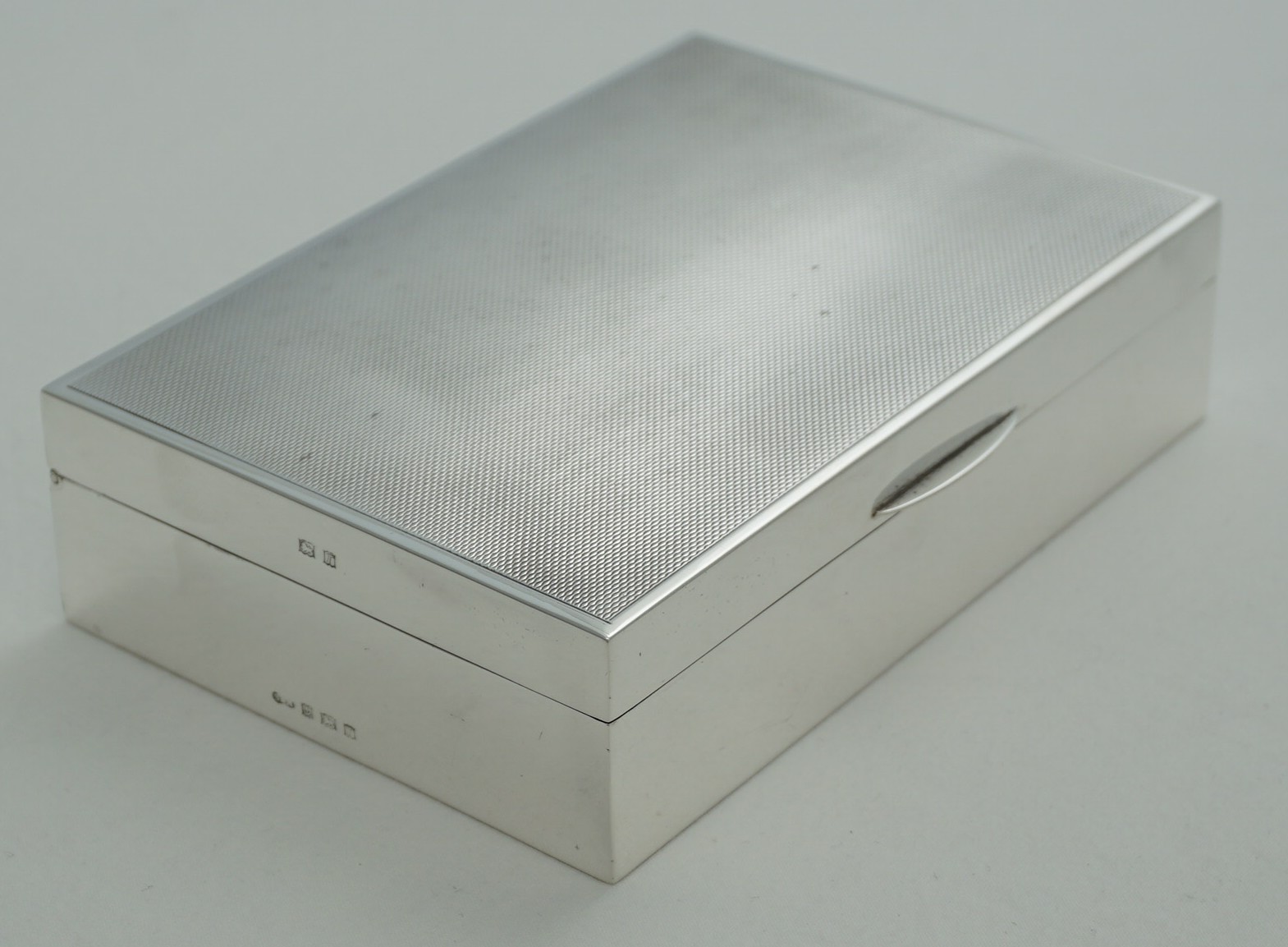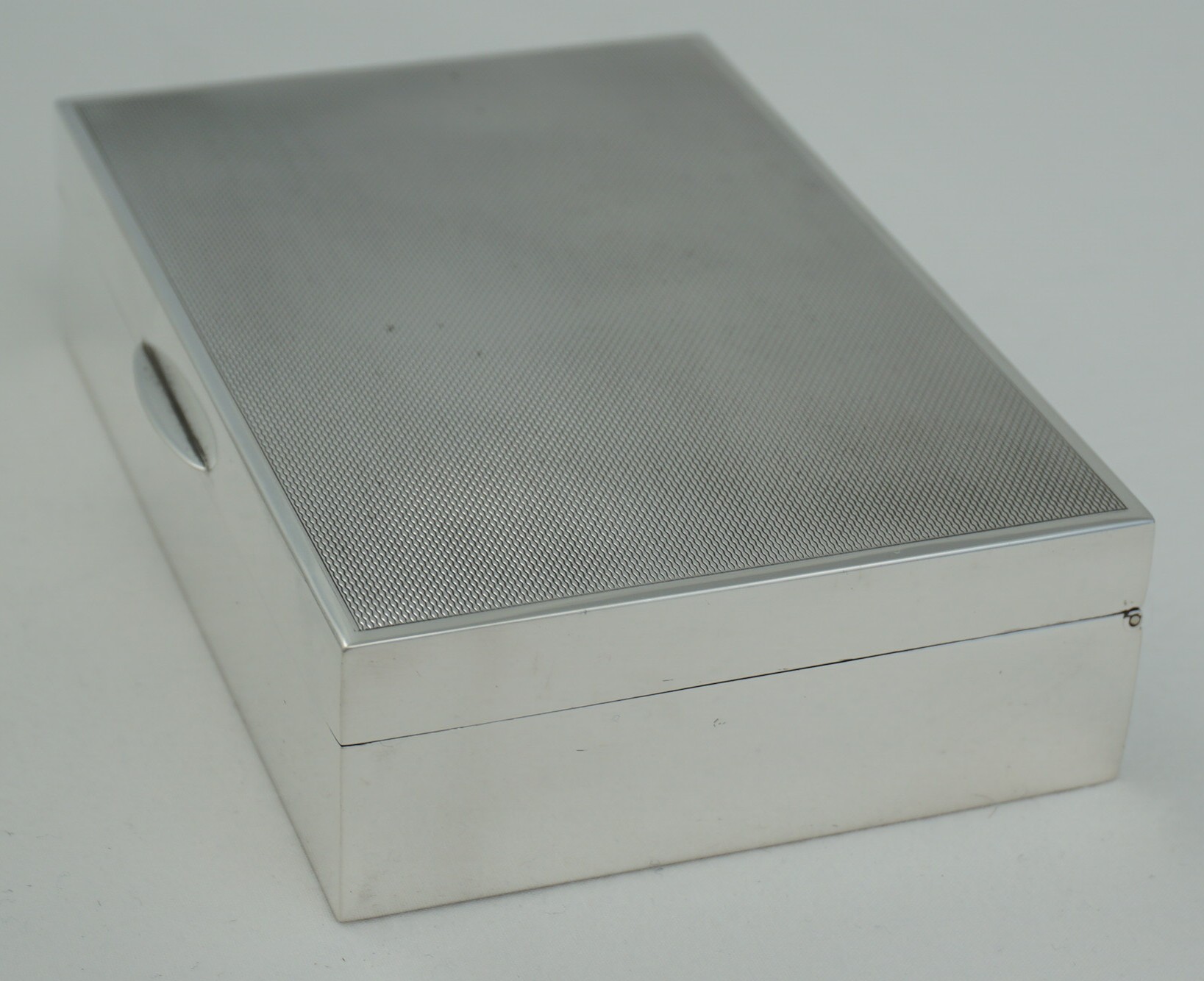 | DESCRIPTION | Very good vintage English silver cigarette box with engine turned engraved decoration and a wood lined interior. |