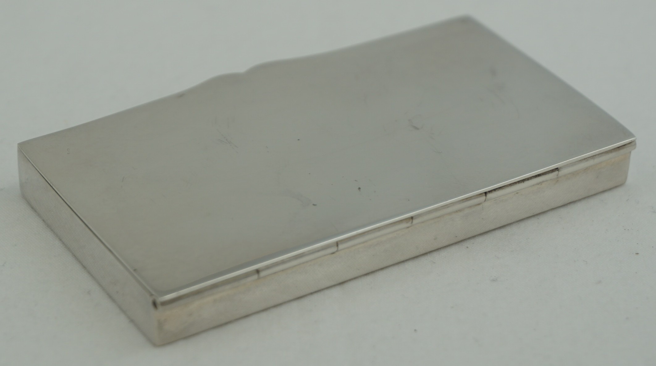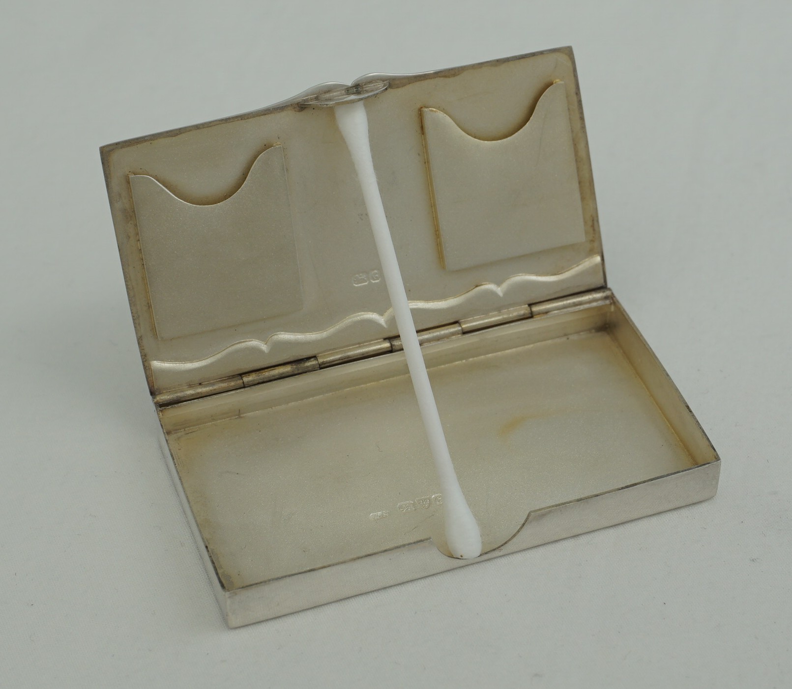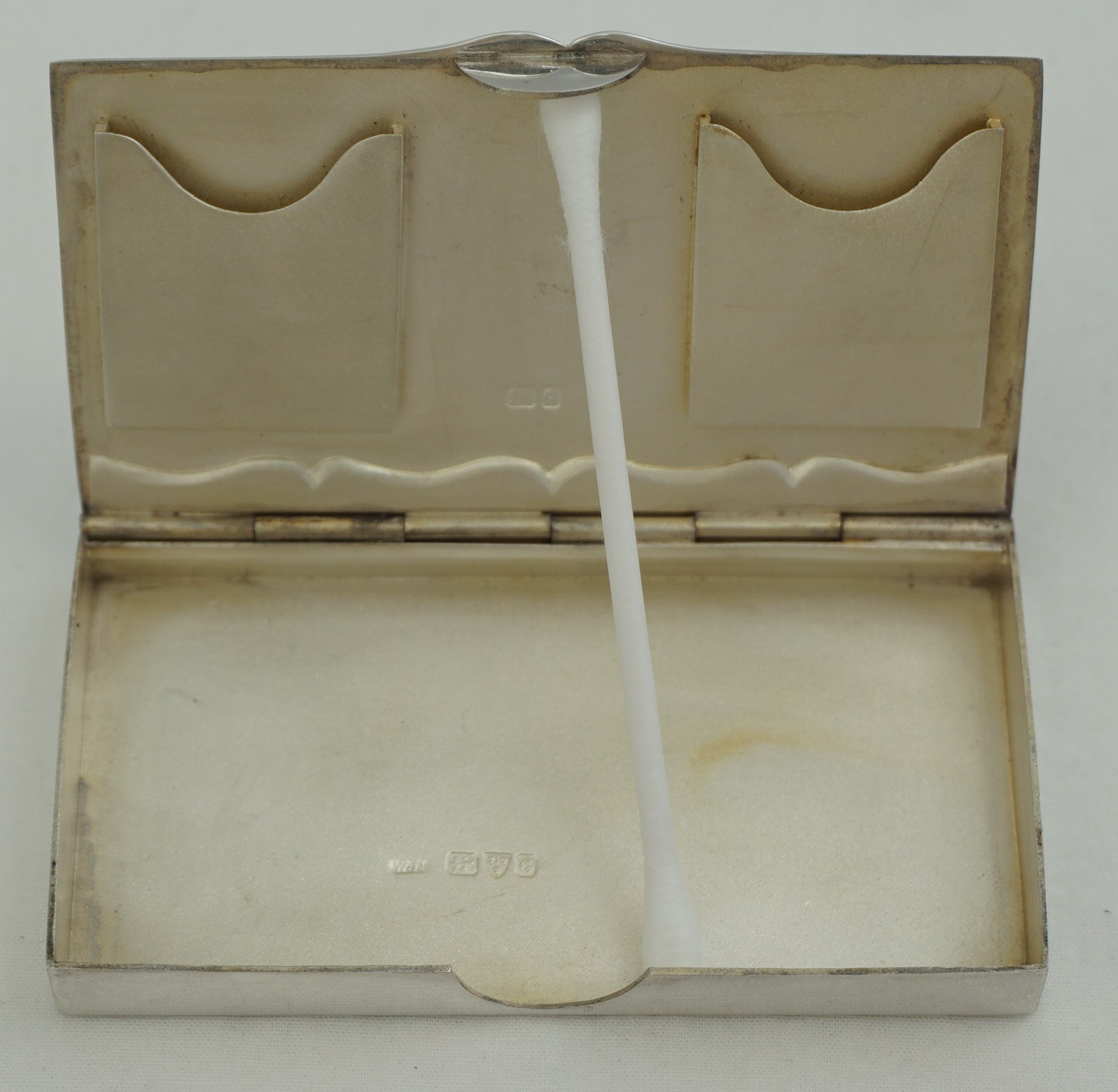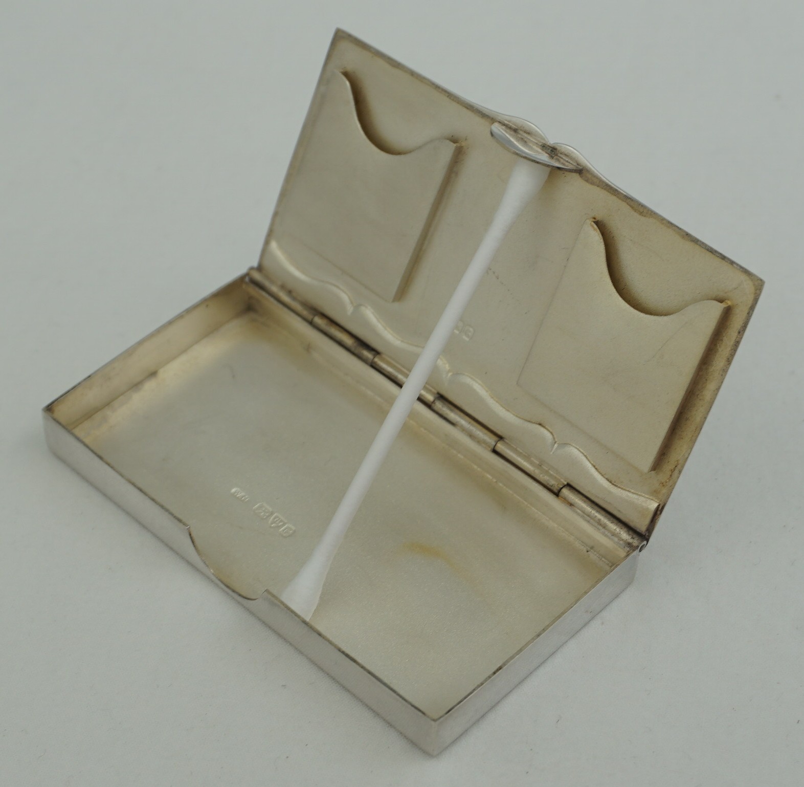 | DESCRIPTION | Very unusual antique English Edwardian solid sterling silver postage stamp case with a lightly gilded matt interior. It has been suggested that the base section was intended for cigarettes/cigarillos but I am sceptical of this theory and think it more likely for the large high value parcel post stamps of the period. The lid spring is reassuringly strong and a cotton bud was required for the photography. |