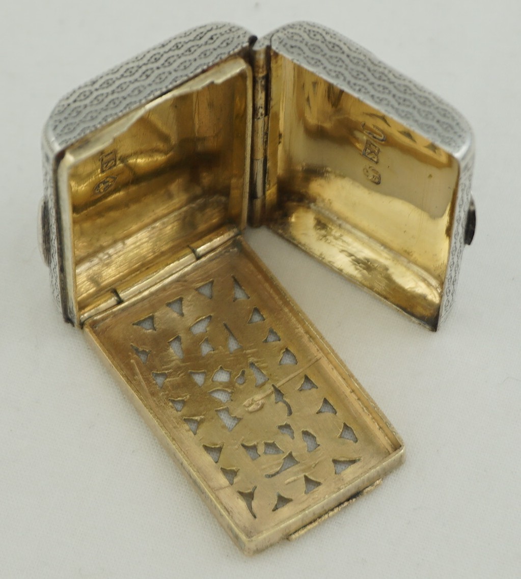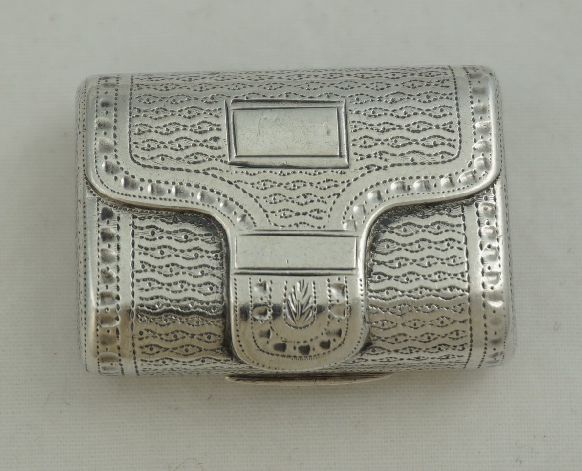 | DESCRIPTION | Unusual Georgian solid sterling silver satchel form vinaigrette with a fully gilded interior. |