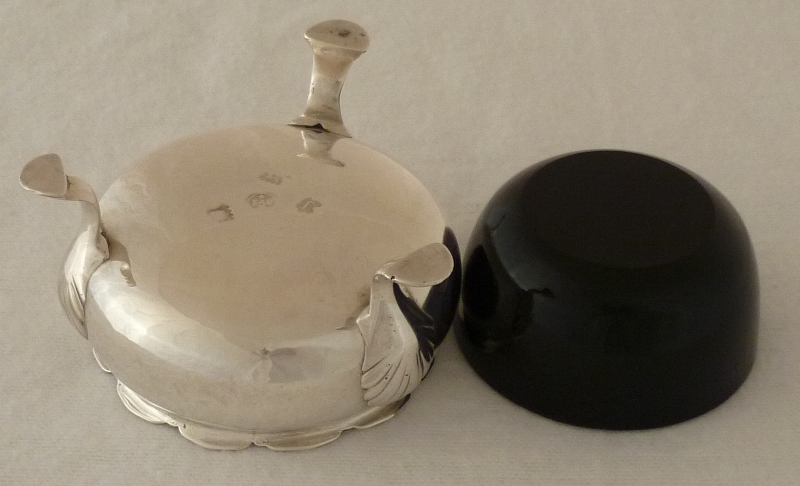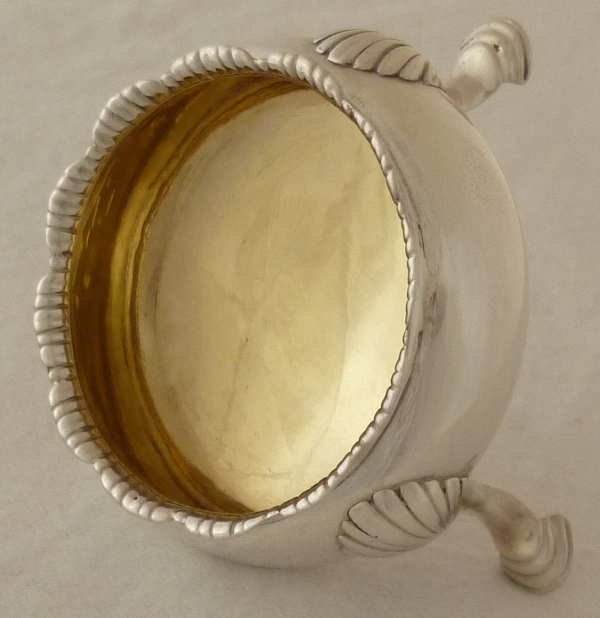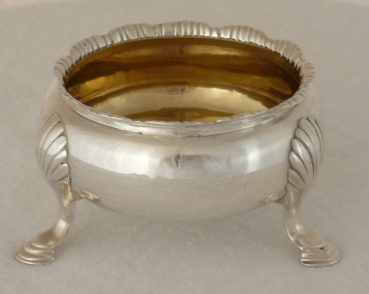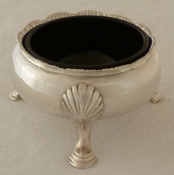 Georgian silver cauldron salt with a gadrooned rim, three shell capped pad feet and nice hallmarks. Recent restoration includes rim split repair and fresh internal gilding. Complete with good quality and well fitting blue glass liner to give you the option. |