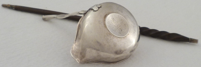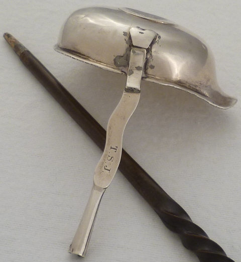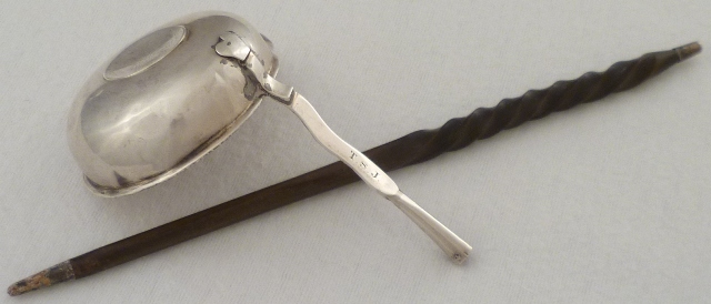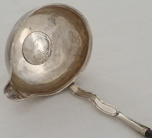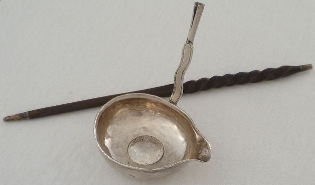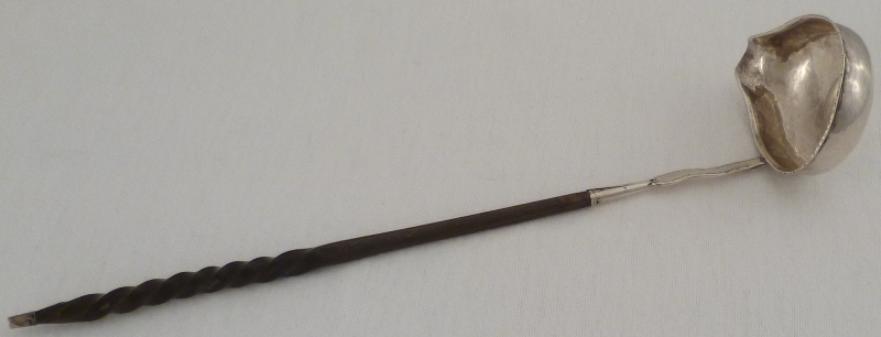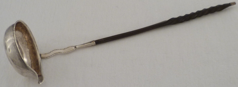 | DESCRIPTION | Unmarked Georgian silver punch ladle inset with a Queen Anne shilling. The silver part of the stem has bright cut edge decoration and an initial engraving verso. The twisted baleen handle is loose and although correct in style and period probably is not the original. |