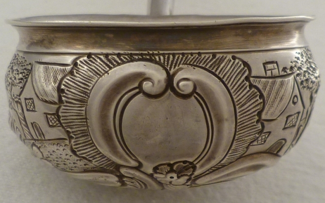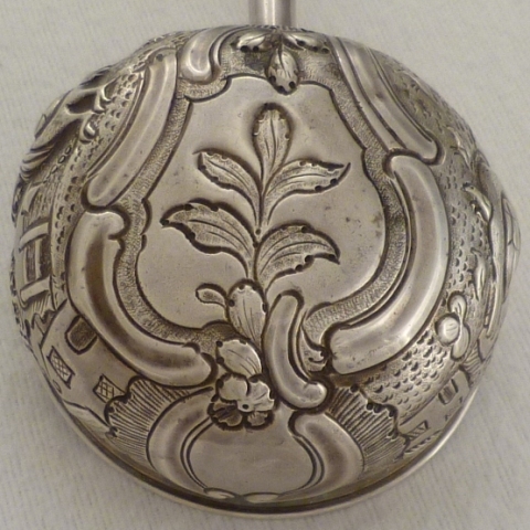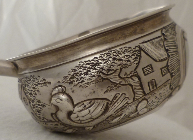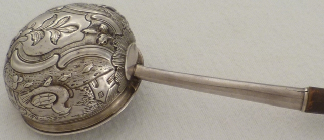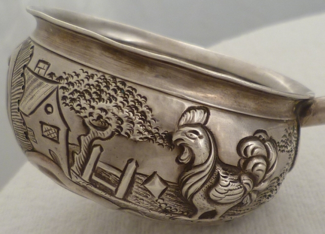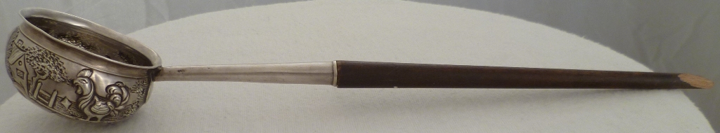 Georgian silver punch ladle with embossed, chased and engraved decoration including; foliate, C scroll, rococo cartouche, rural buildings, trees, one cockerel, one chicken and several chicks. The silver feels so hard that my