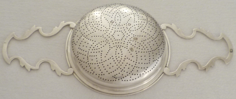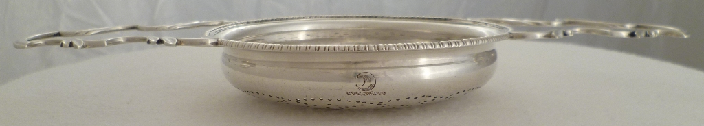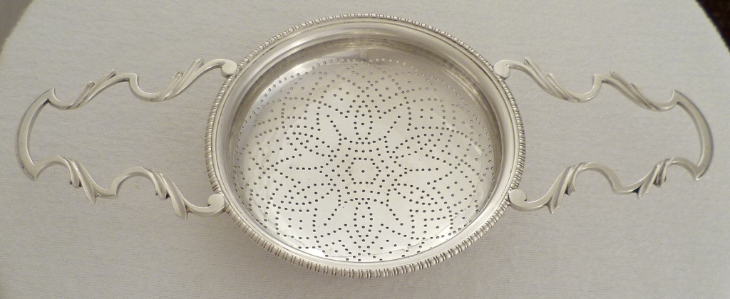 | DESCRIPTION | Magnificent Georgian silver orange strainer with a stylised flower pierced bowl, two leaf capped 'S' scroll handles, gadroon decorated applied top rim, a small crest engraved to one side and beautifully clear hallmarks. |