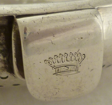 that is discreetly crested with a nine pearl coronet indicative of a Viscount. The circular bowl is extensively pierced in a flower pattern that has partly obscured the otherwise very clear hallmarks.