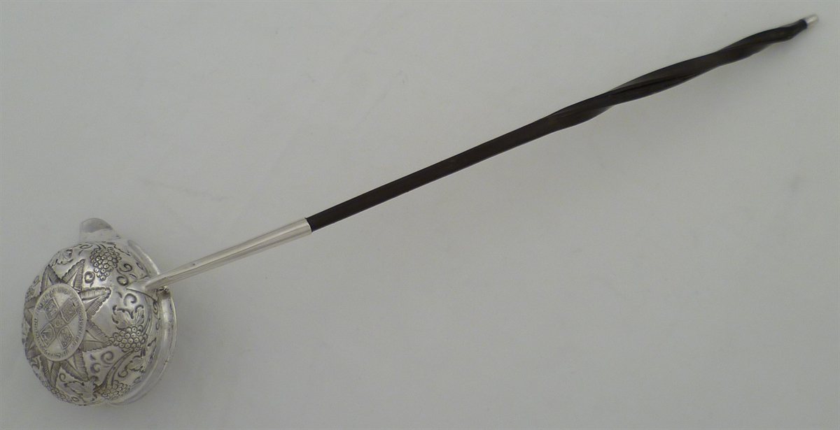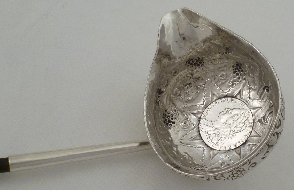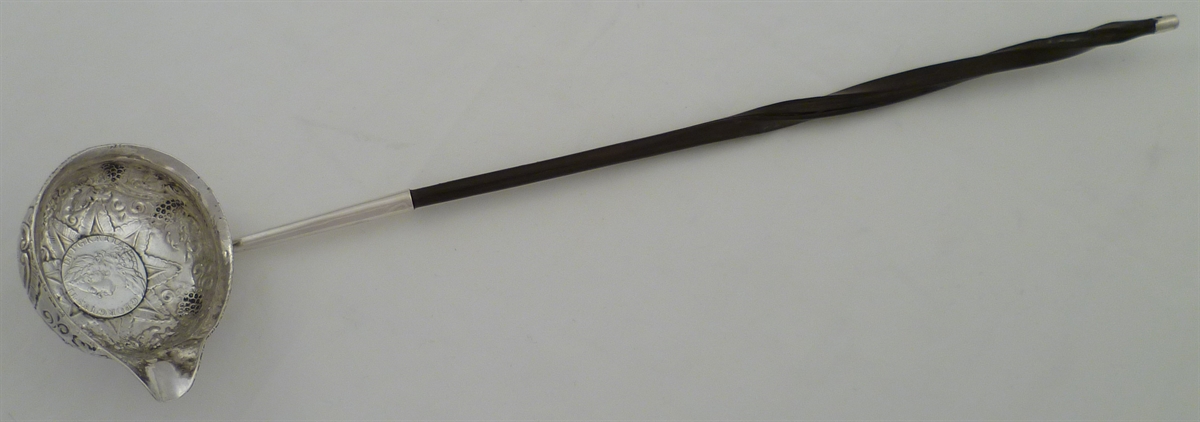 Georgian silver punch ladle inset with a 1758 George II silver shilling. The twisted baleen handle is split centrally and has a