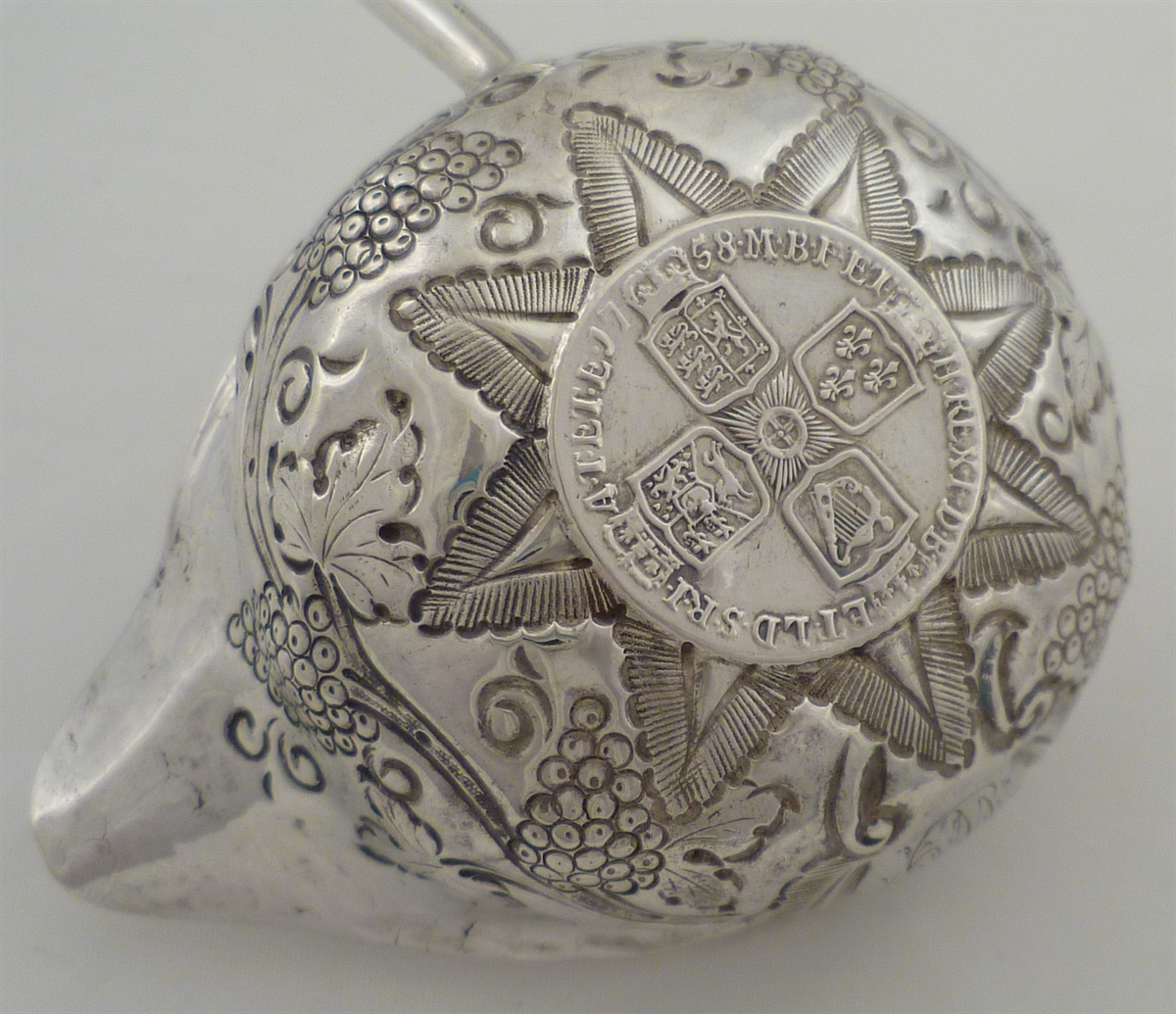 silver end terminal cap. Embossed and engraved vine decoration to the bowl and the rococo cartouche has a monogram engraving. |