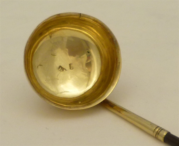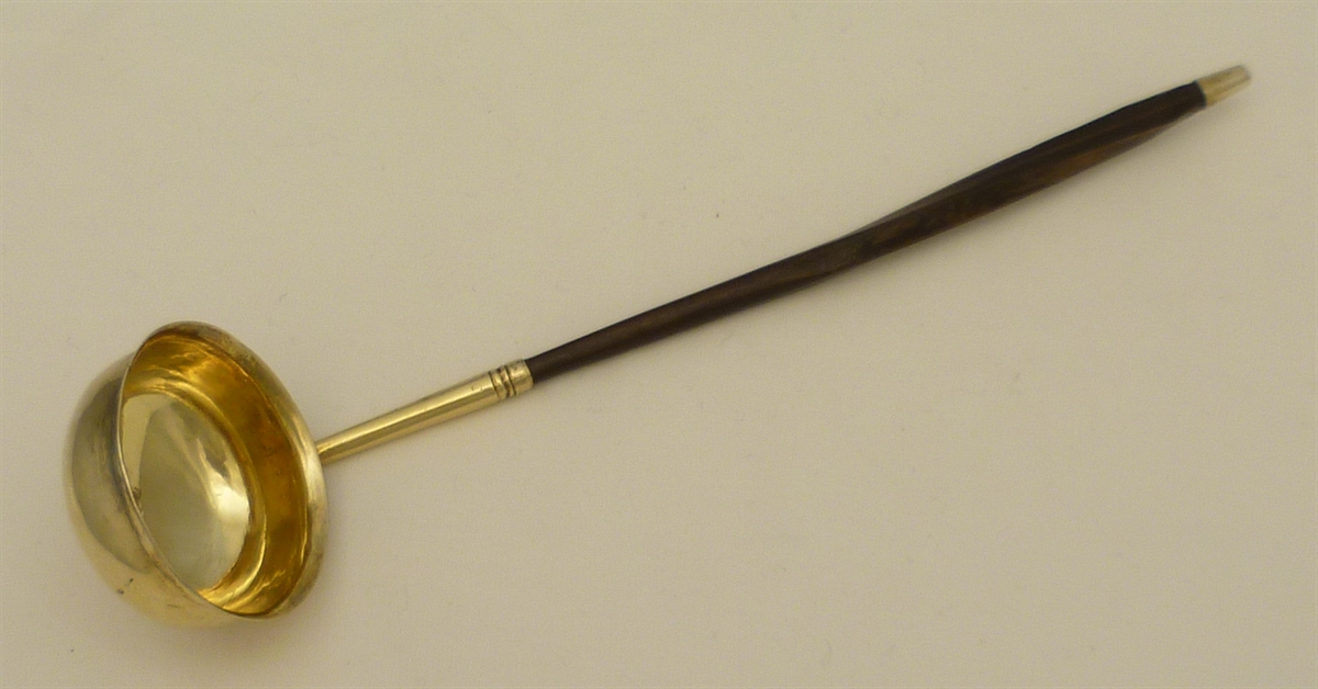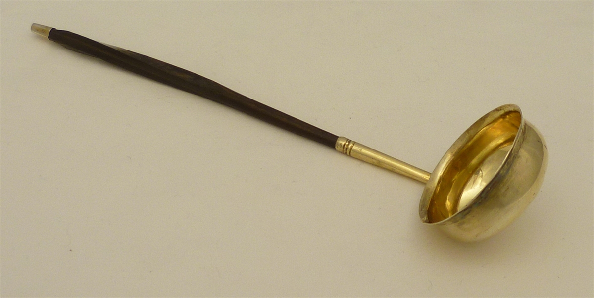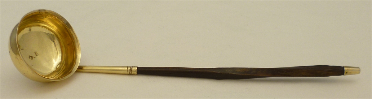 | DESCRIPTION | Georgian sterling silver toddy ladle with a round and gilded bowl and silver gilt capped twisted baleen handle. |