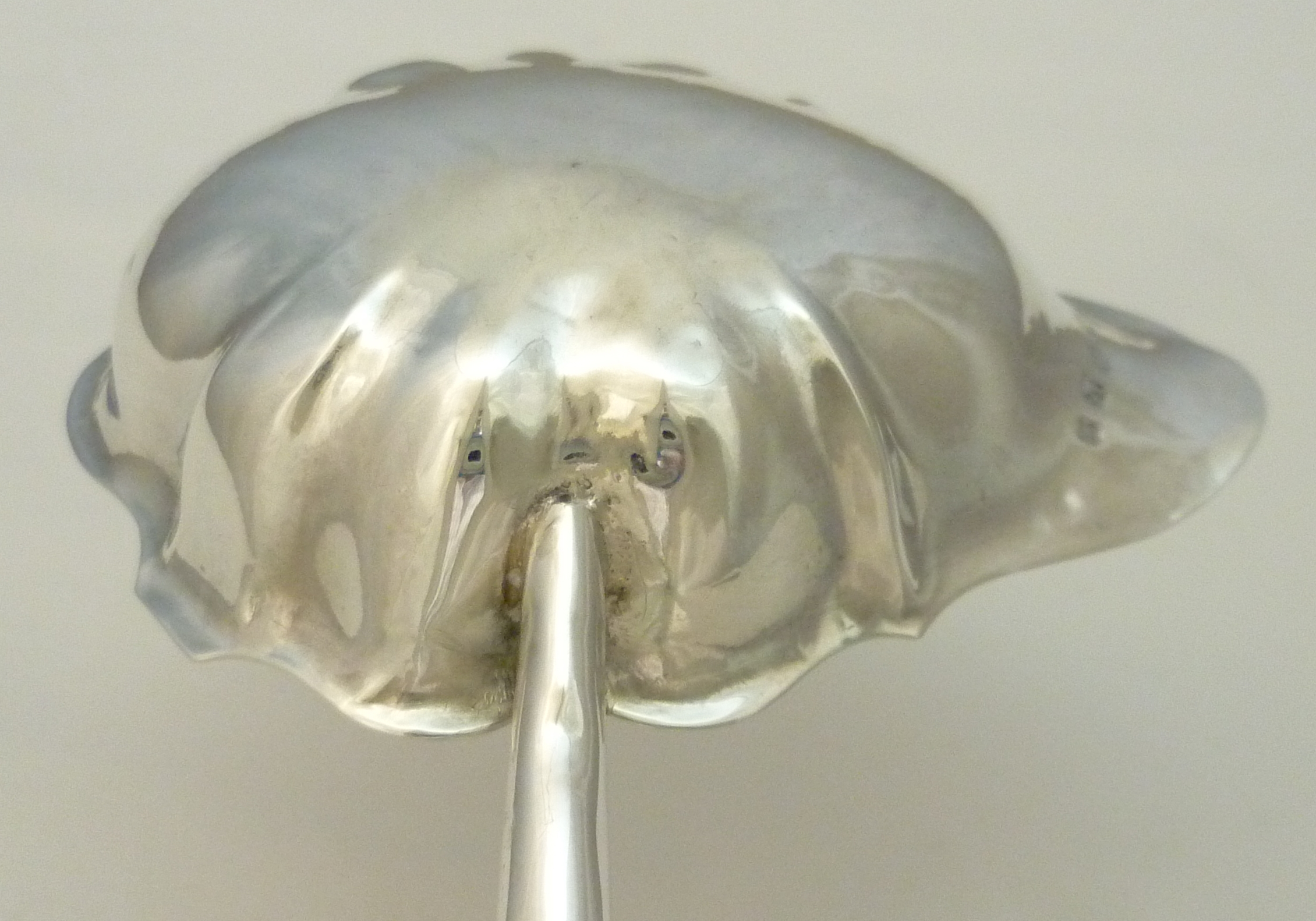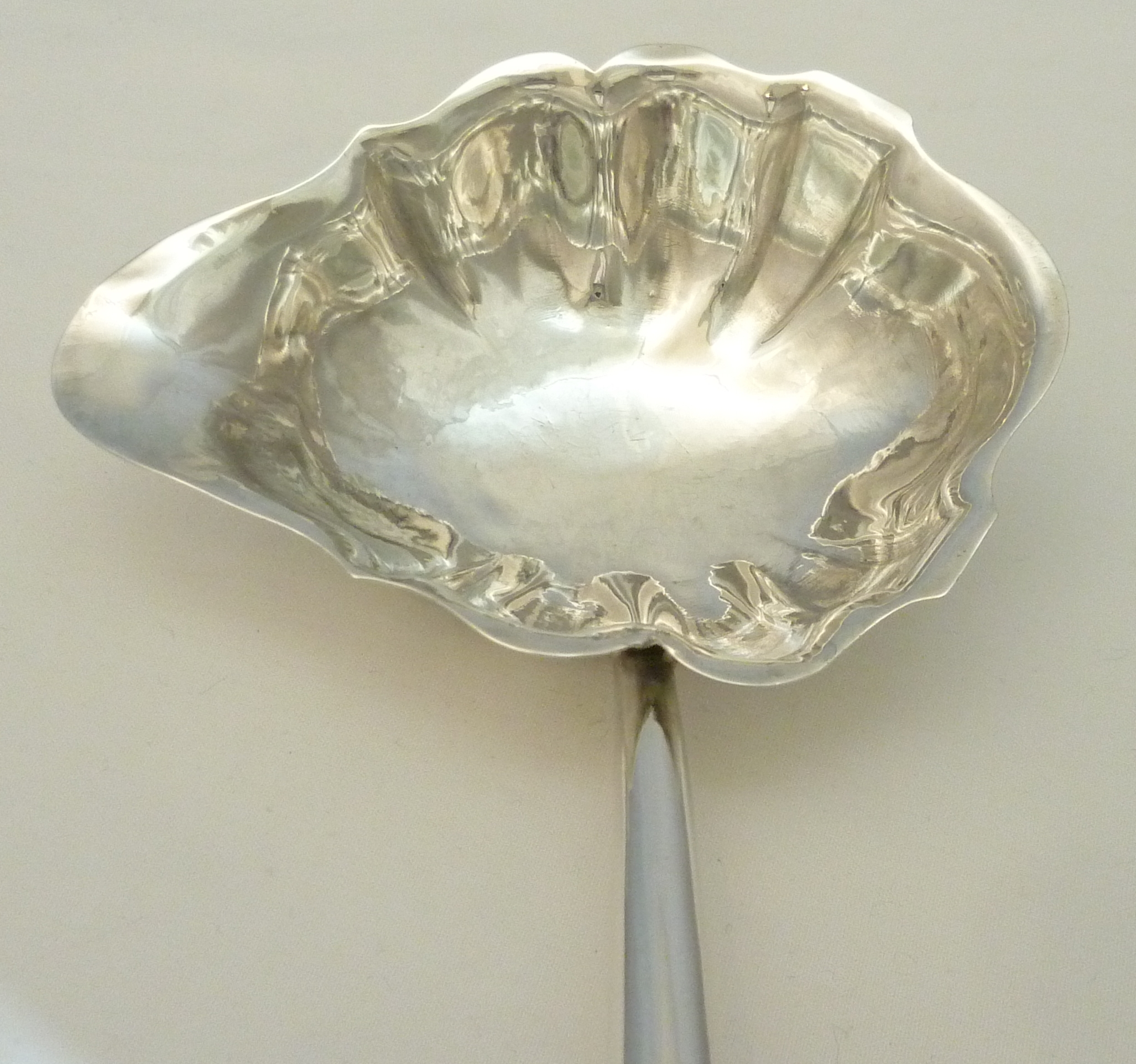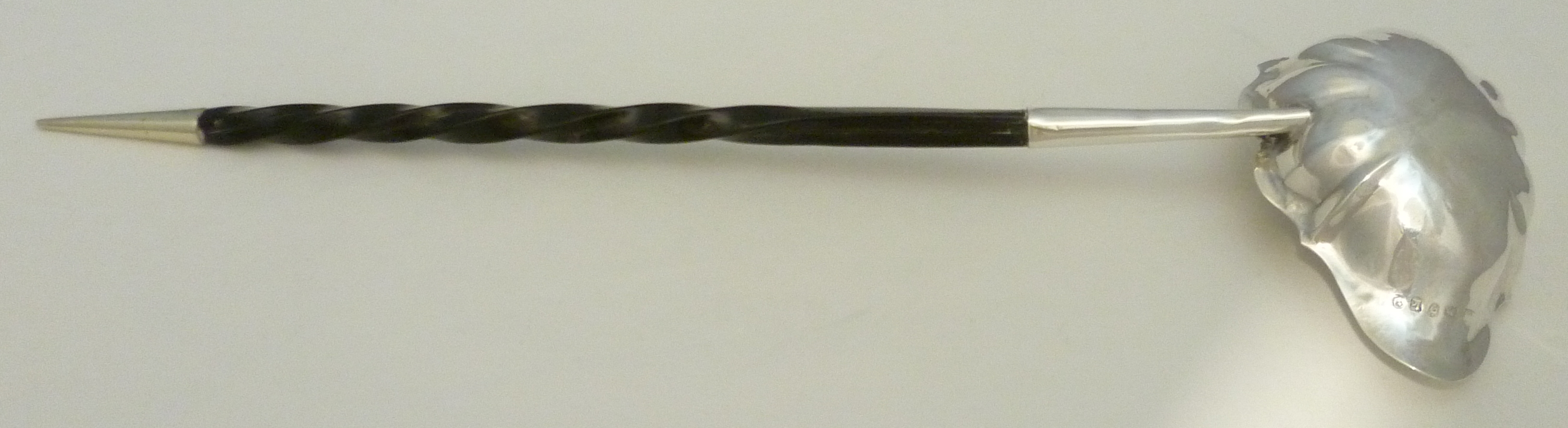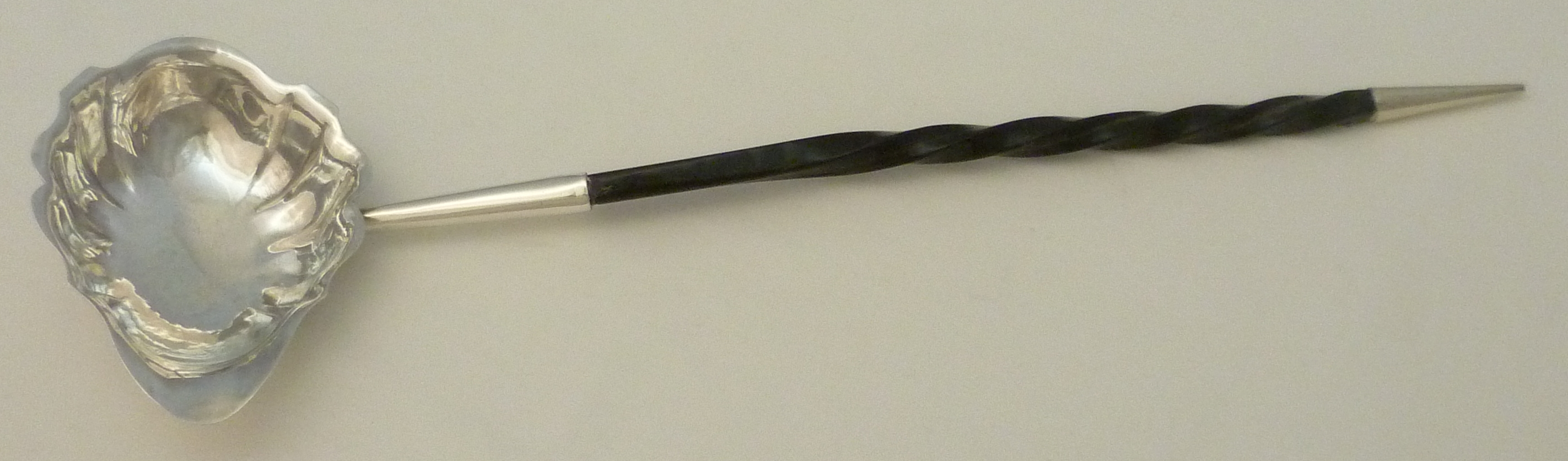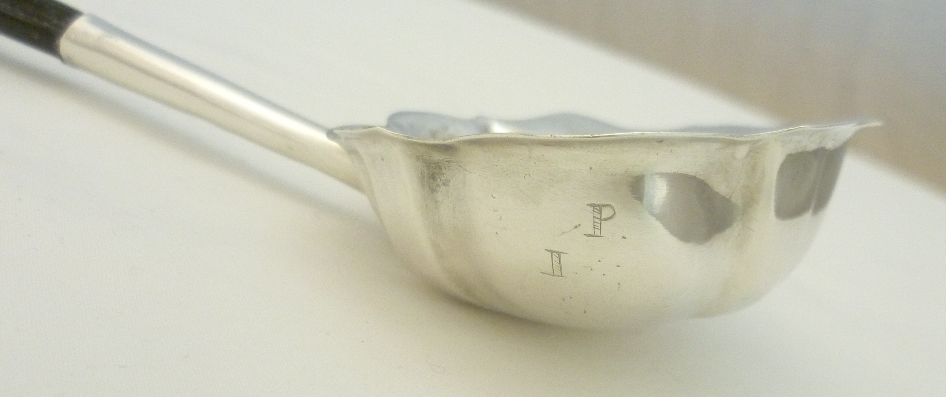| DESCRIPTION | Georgian solid sterling silver punch ladle with a silver cone capped spiral twist baleen handle. Typical engraving of the period. This one is for a Mr I (John would be a fair guess) P. There are four little spacer devices below the P that would go between the 'I' and the wife's first initial and then a void. Mrs P has been erased, obliterated from history. I wonder what she did to deserve this fate. Must have been significant as the erasure was very well done and would have been an otherwise unnecessary expense. |