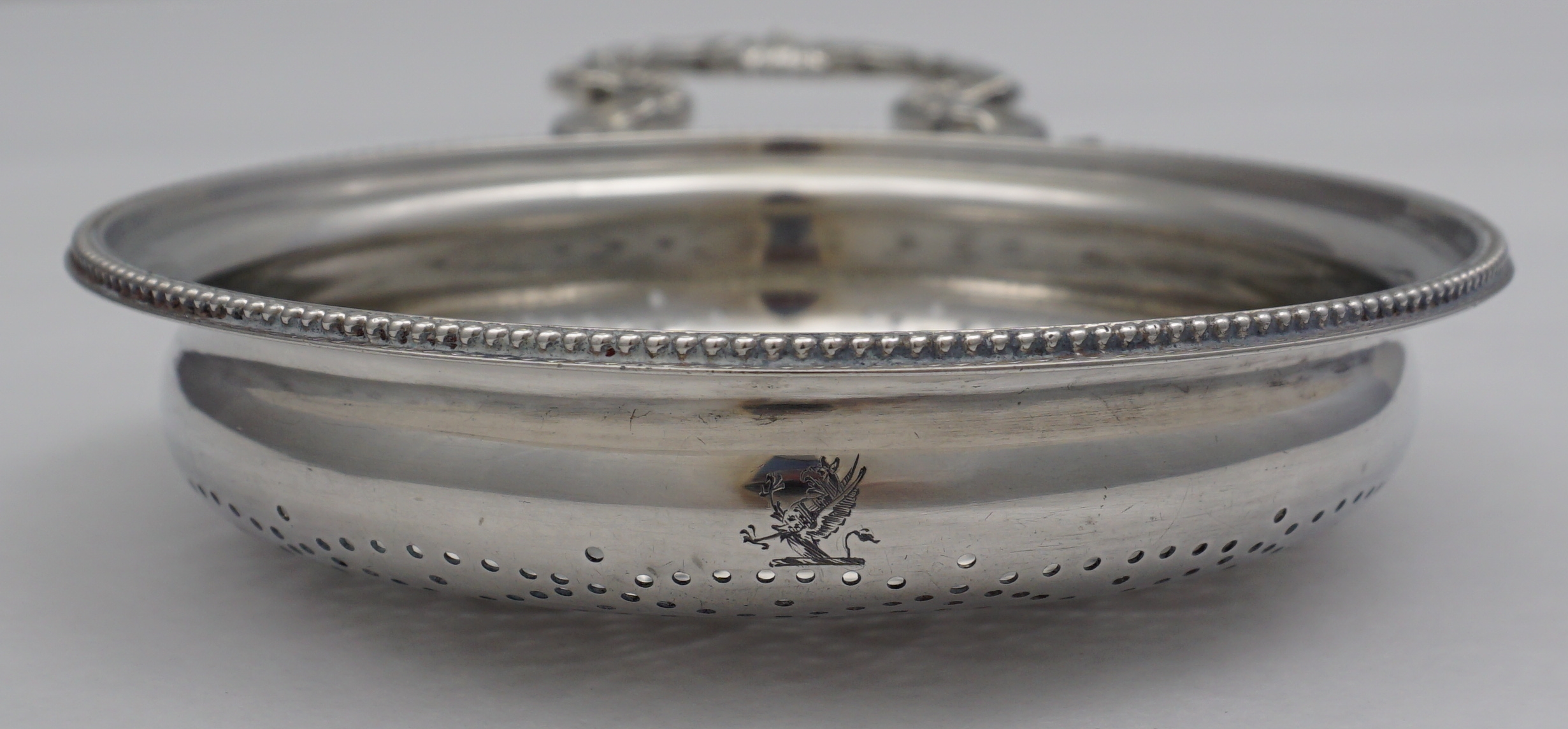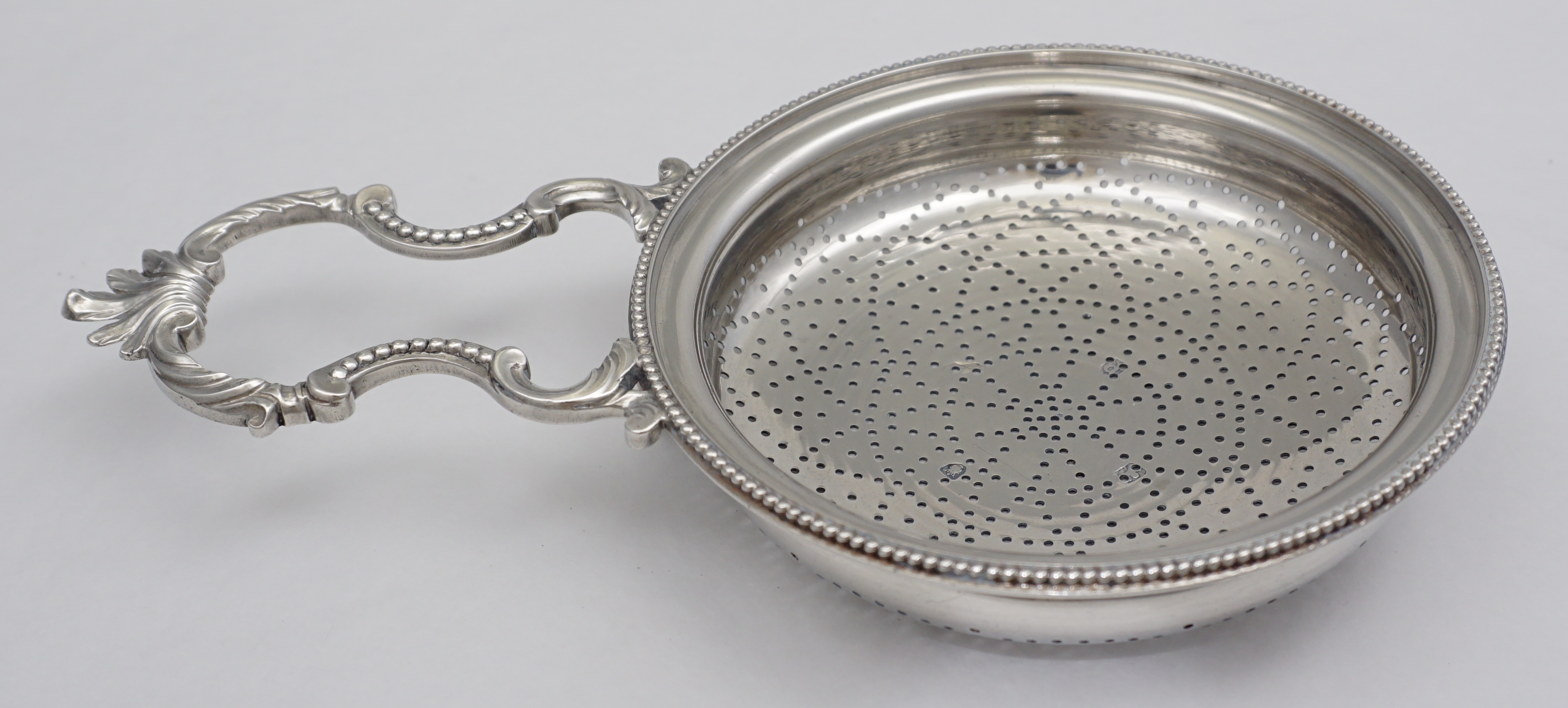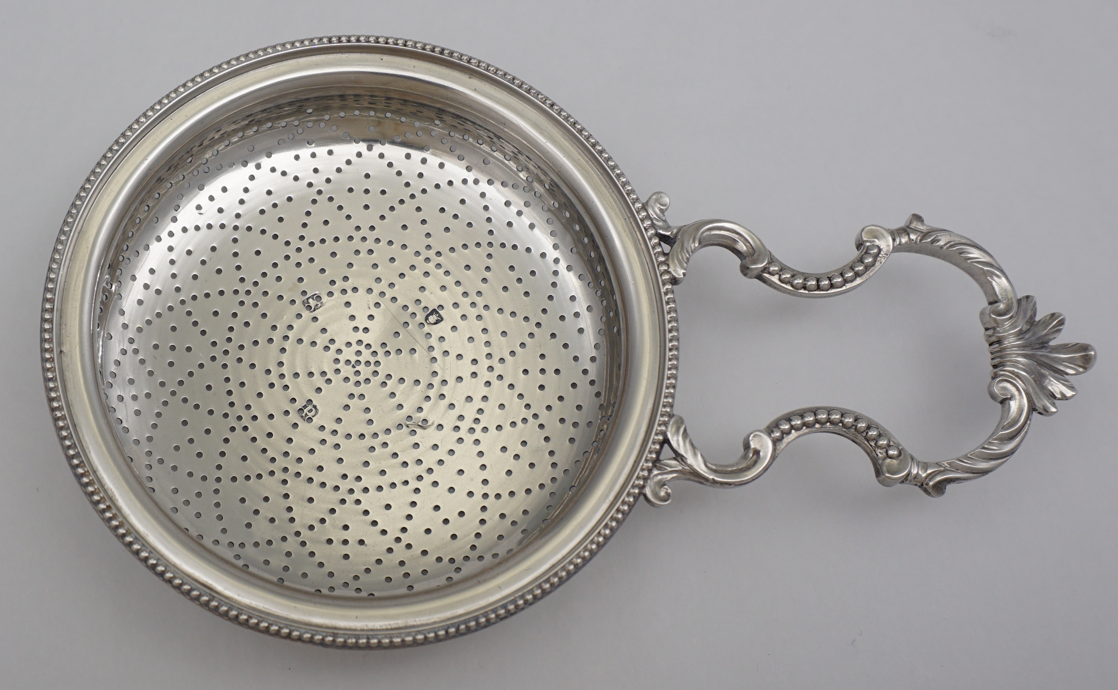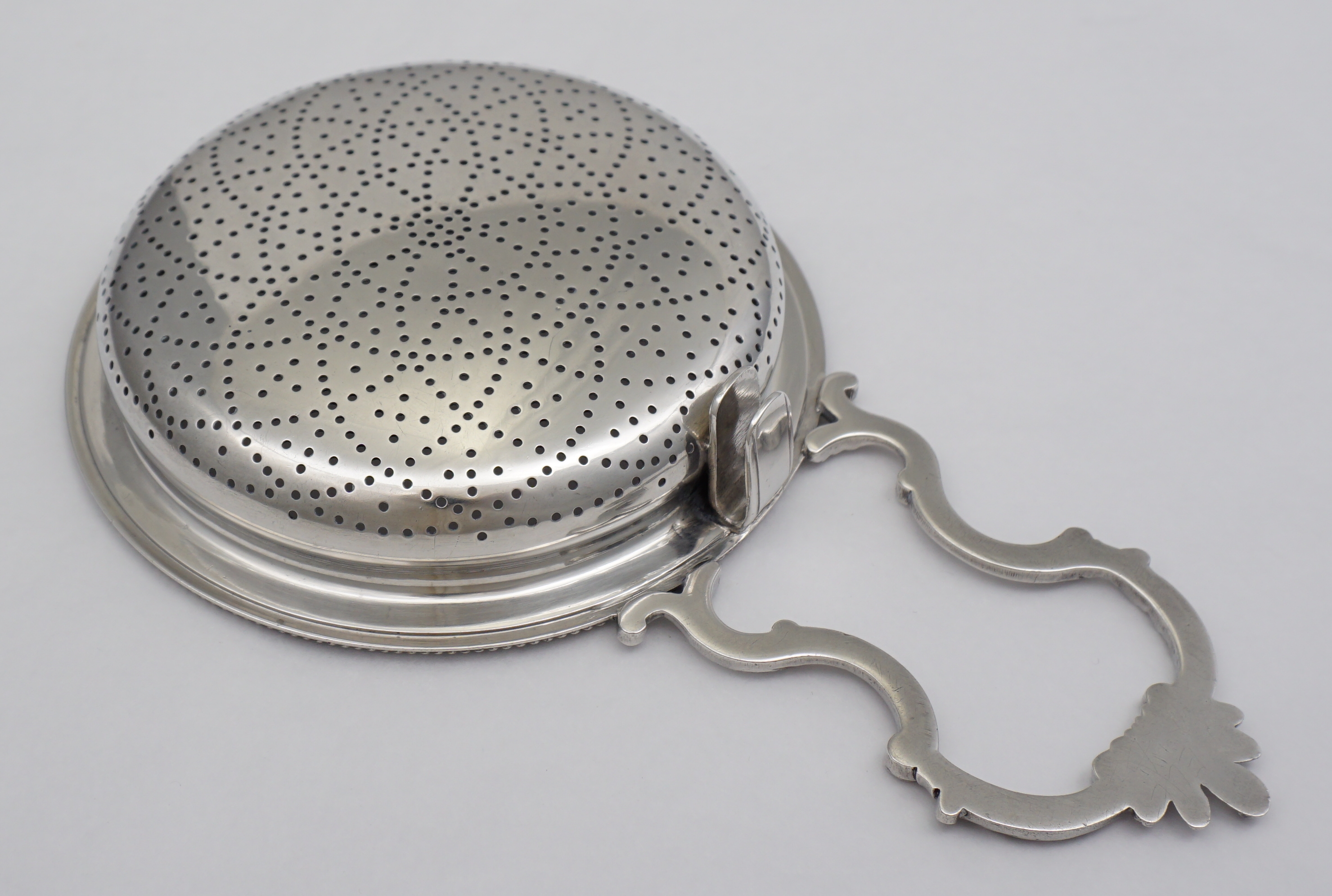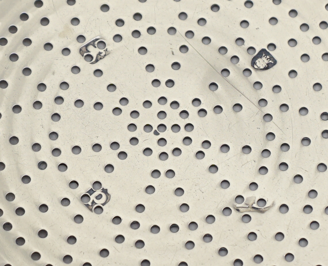 | DESCRIPTION | Highest quality antique English Georgian solid sterling silver orange or lemon strainer with stylised petal form piercing, discreet frontal crest engraving, thread decorated suspension clip and a magnificent cast handle. The detail and quality of this cast silver handle is outstanding. Probably the last of this type as the fashion for simpler and cheaper loop handles was already gaining popularity. To learn more about orange/lemon/punch strainers see the fabulous new book on the subject 'Silver Lemon Strainers 1686-1846' by Michael Adams. |