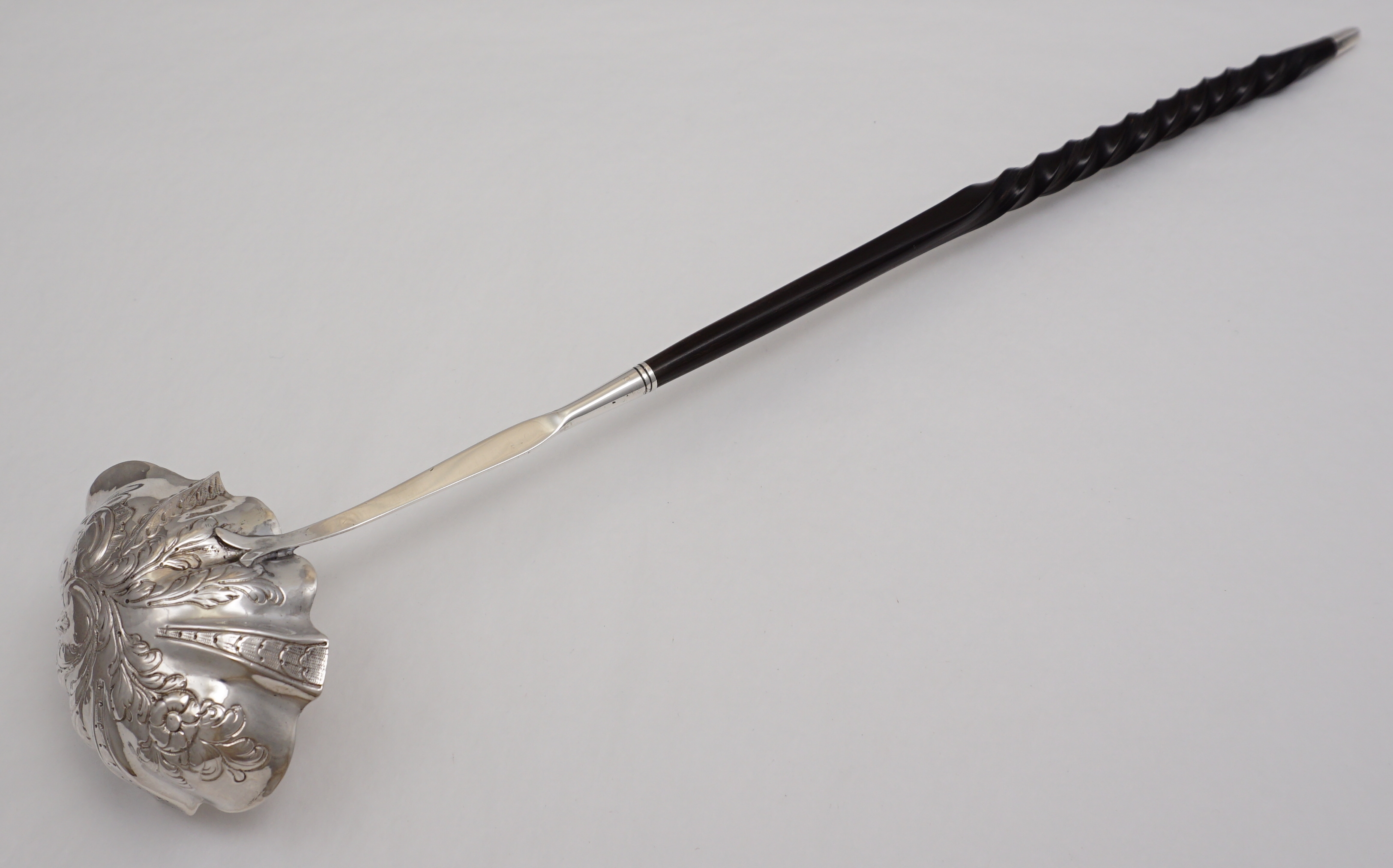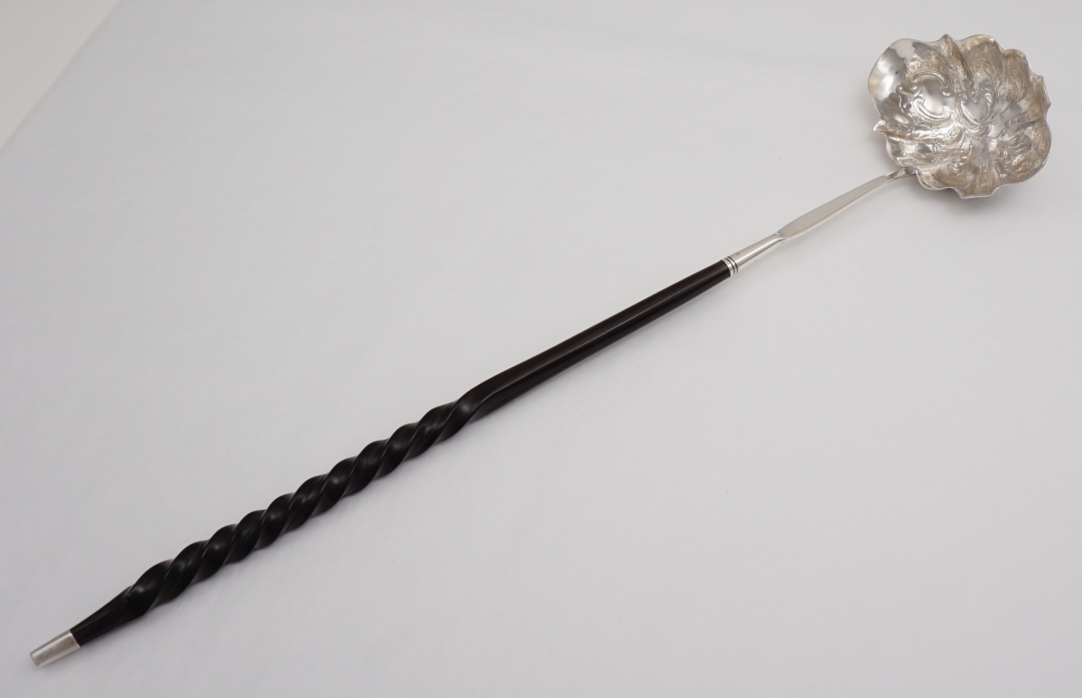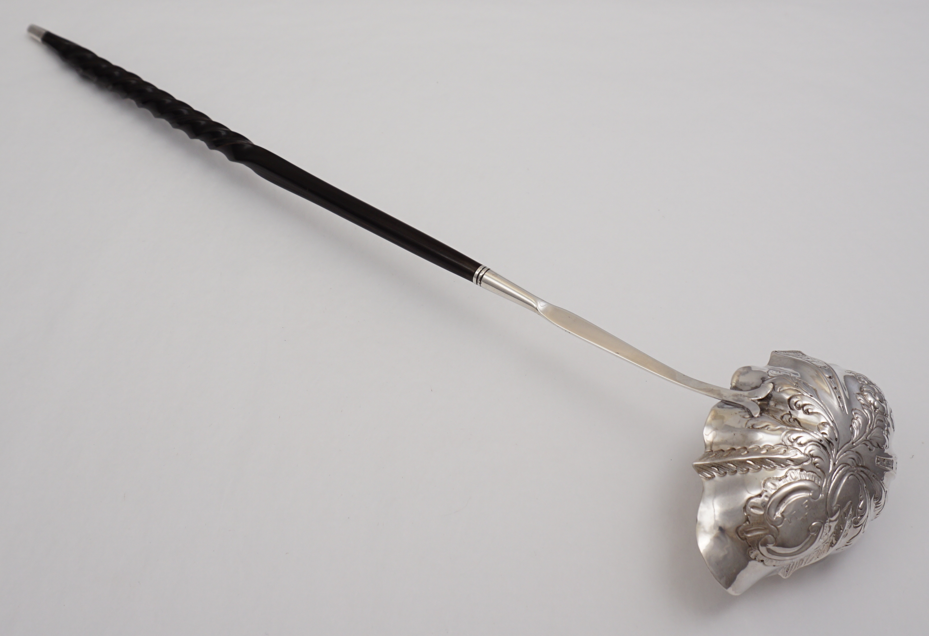 | DESCRIPTION | Long antique English Georgian punch ladle with a solid sterling silver bowl and baleen handle. The bowl with embossed and engraved rococo decoration and, unusually, a full set of well struck and readable hallmarks. The bowl back is engraved with an original betrothal engraving where "A" is the surname initial of the happy couple and "E" and "M" their first names. So often the handle breaks off in the socket but here the silversmith has ingeniously flattened the lower section of the socket to give it some spring and this has worked well, the handle is perfect and also secure within the socket. |