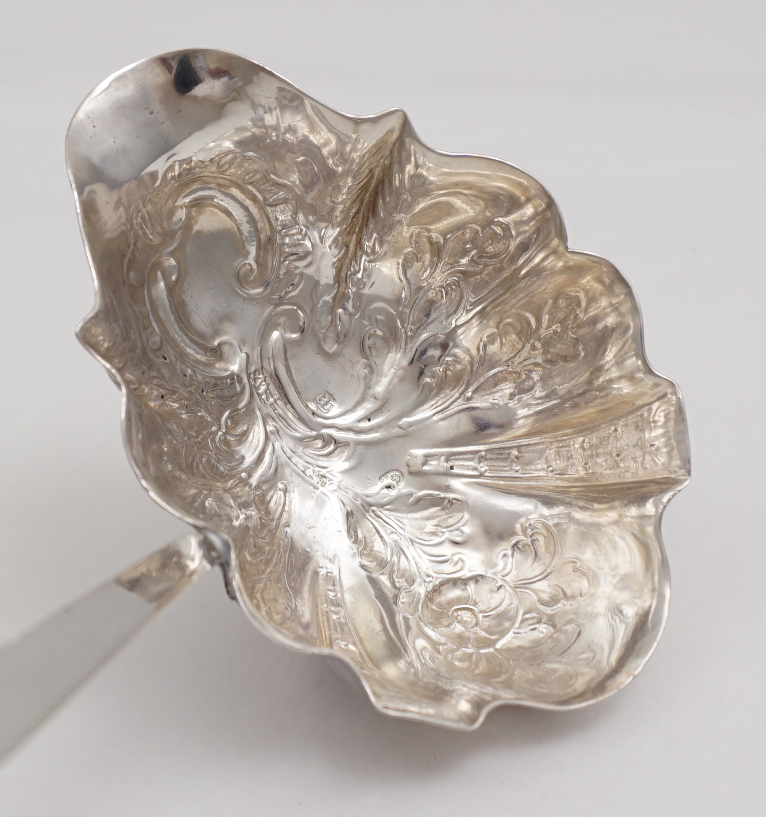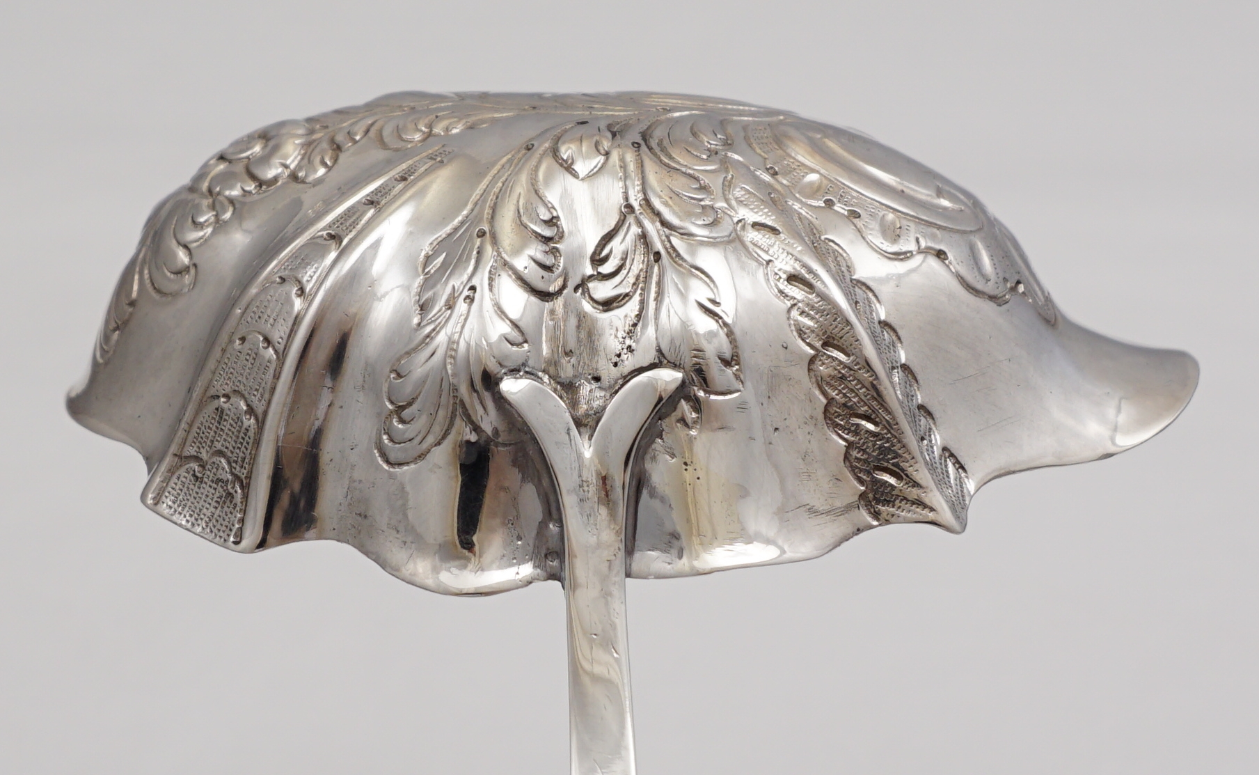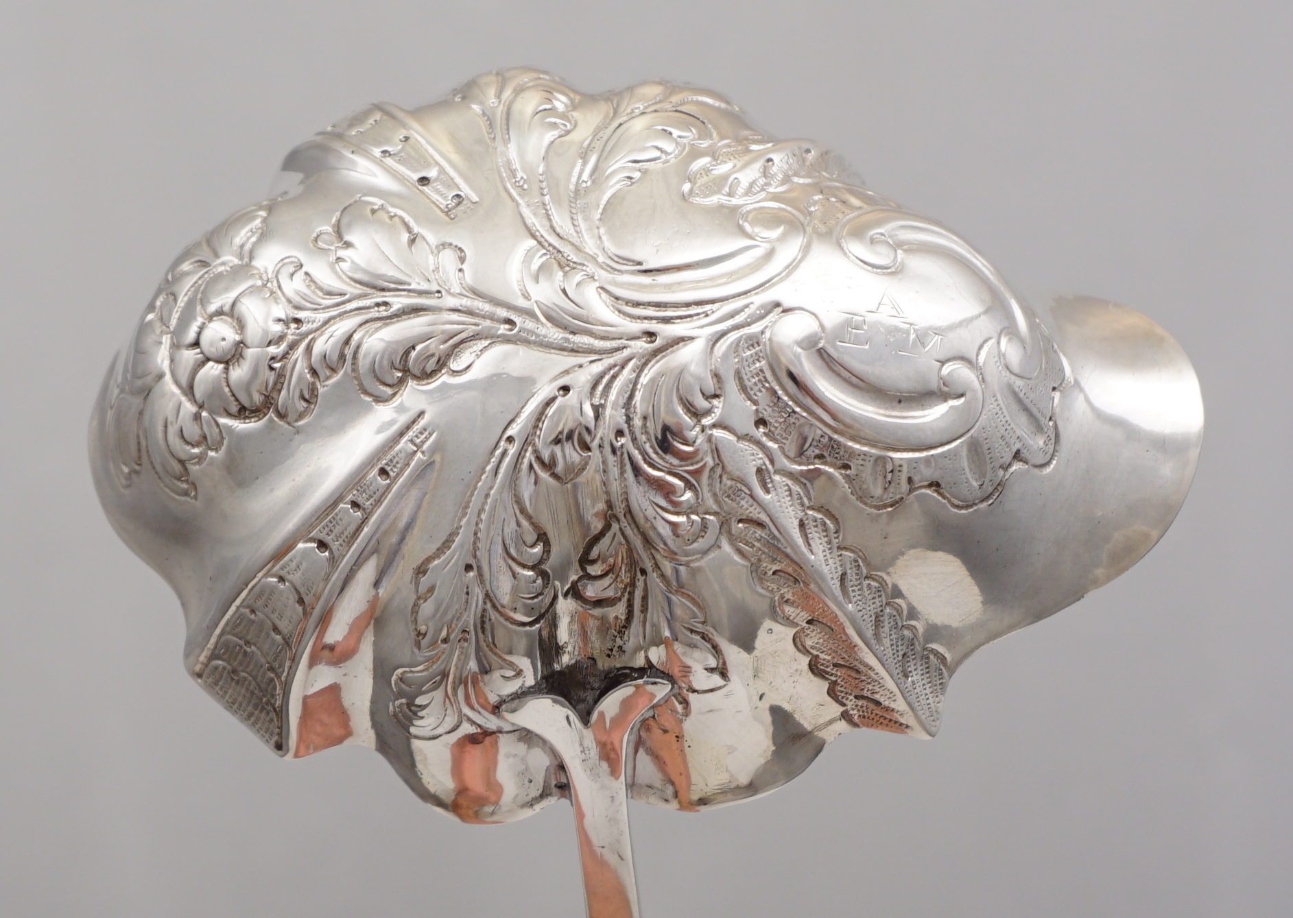 | DESCRIPTION | Long antique English Georgian punch ladle with a solid sterling silver bowl and baleen handle. The bowl with embossed and engraved rococo decoration and, unusually, a full set of well struck and readable hallmarks. The bowl back is engraved with an original betrothal engraving where "A" is the surname initial of the happy couple and "E" and "M" their first names. So often the handle breaks off in the socket but here the silversmith has ingeniously flattened the lower section of the socket to give it some spring and this has worked well, the handle is perfect and also secure within the socket. |