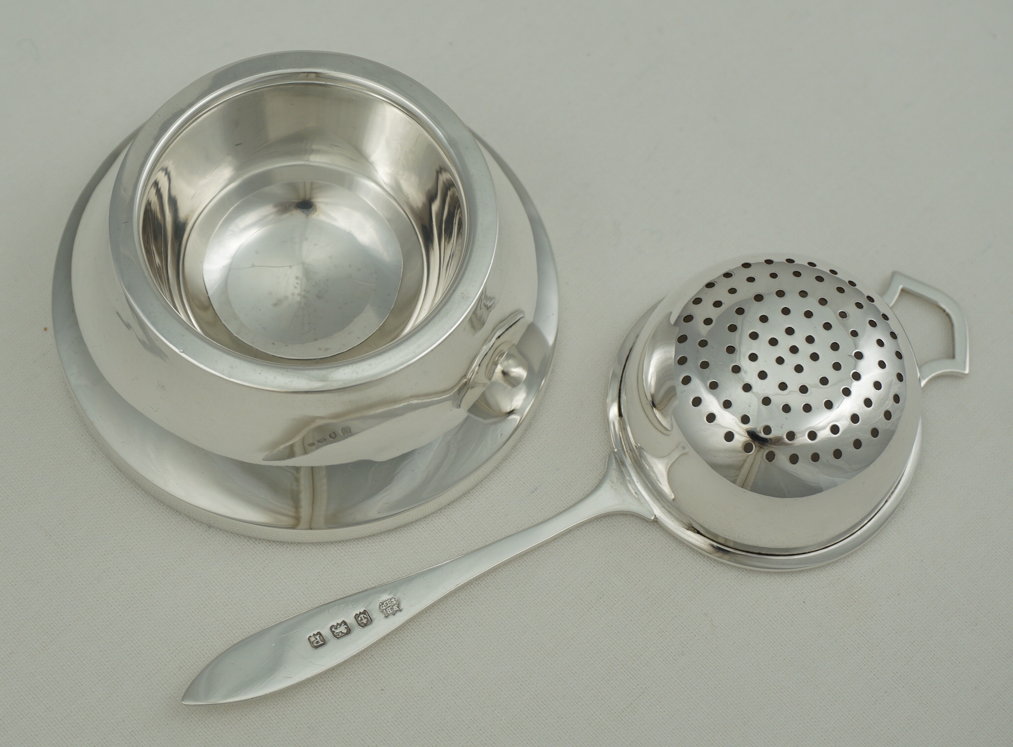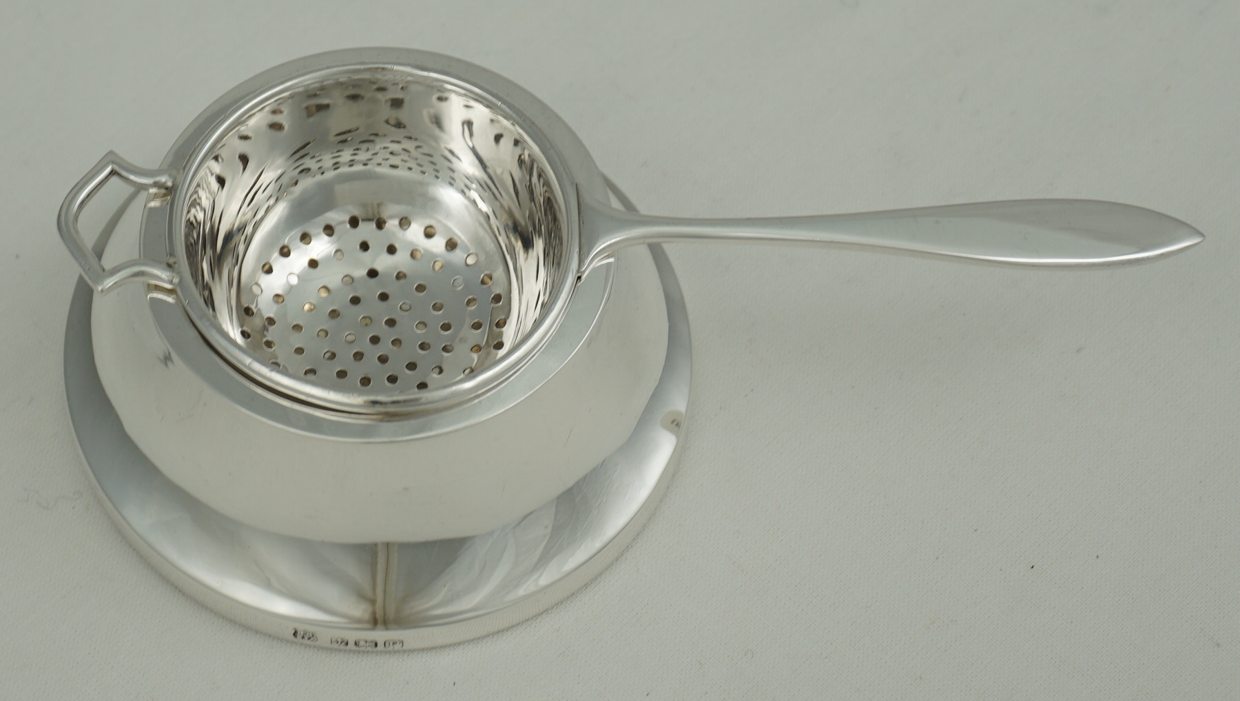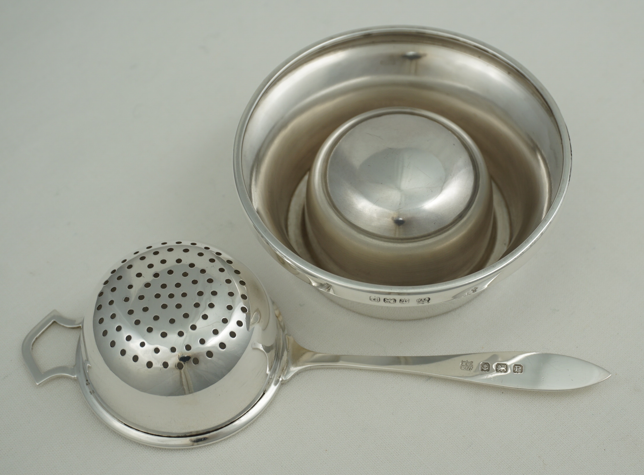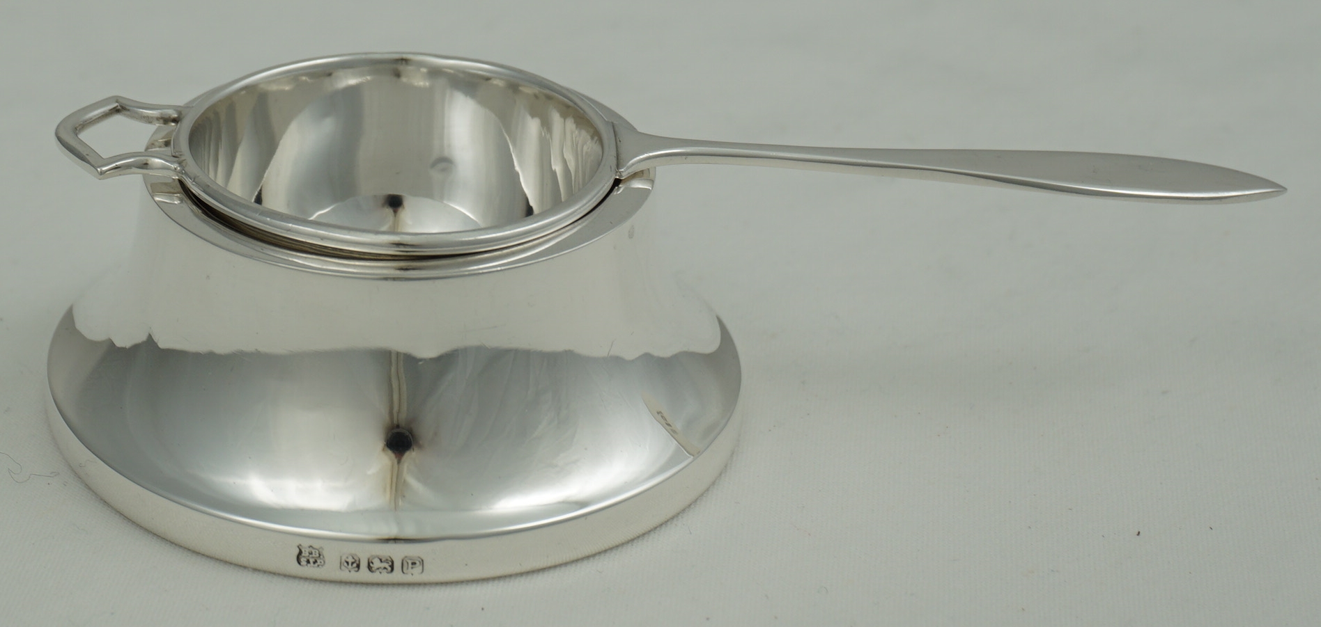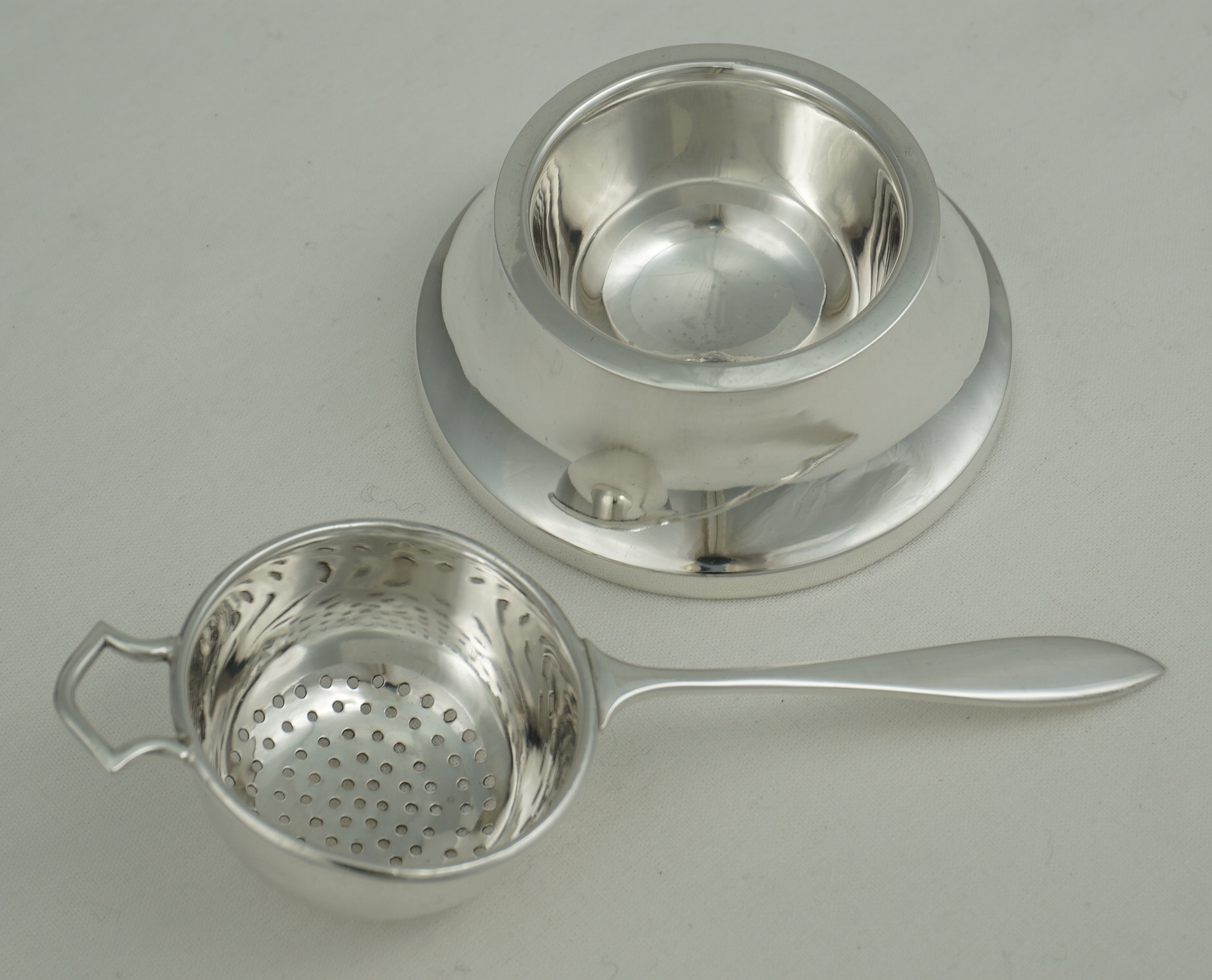 | DESCRIPTION | Vintage English solid sterling silver tea strainer and stand. |