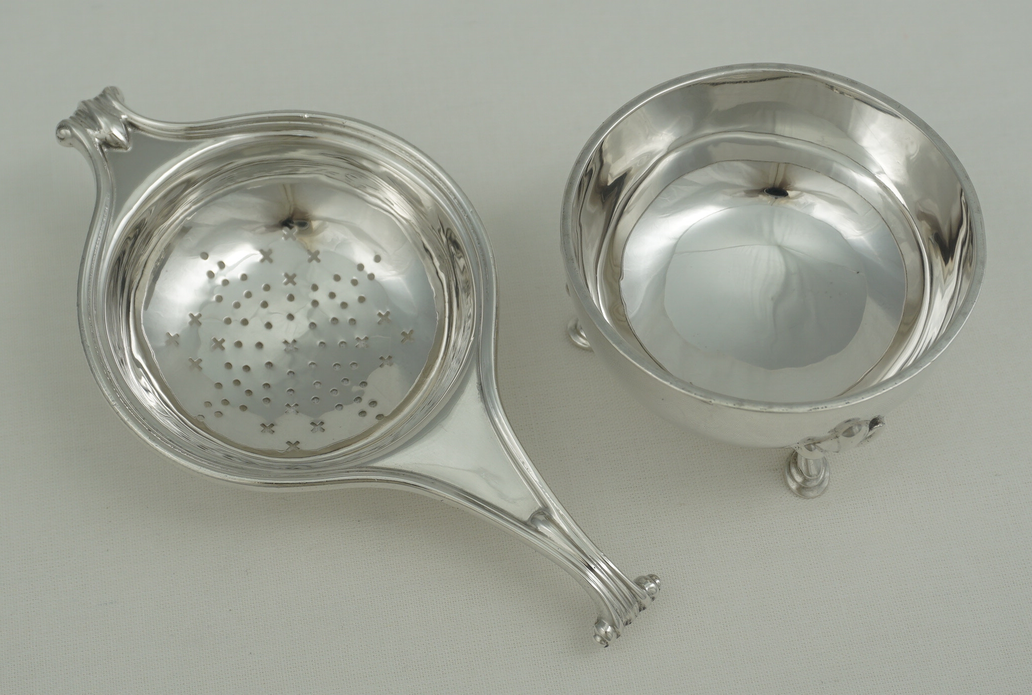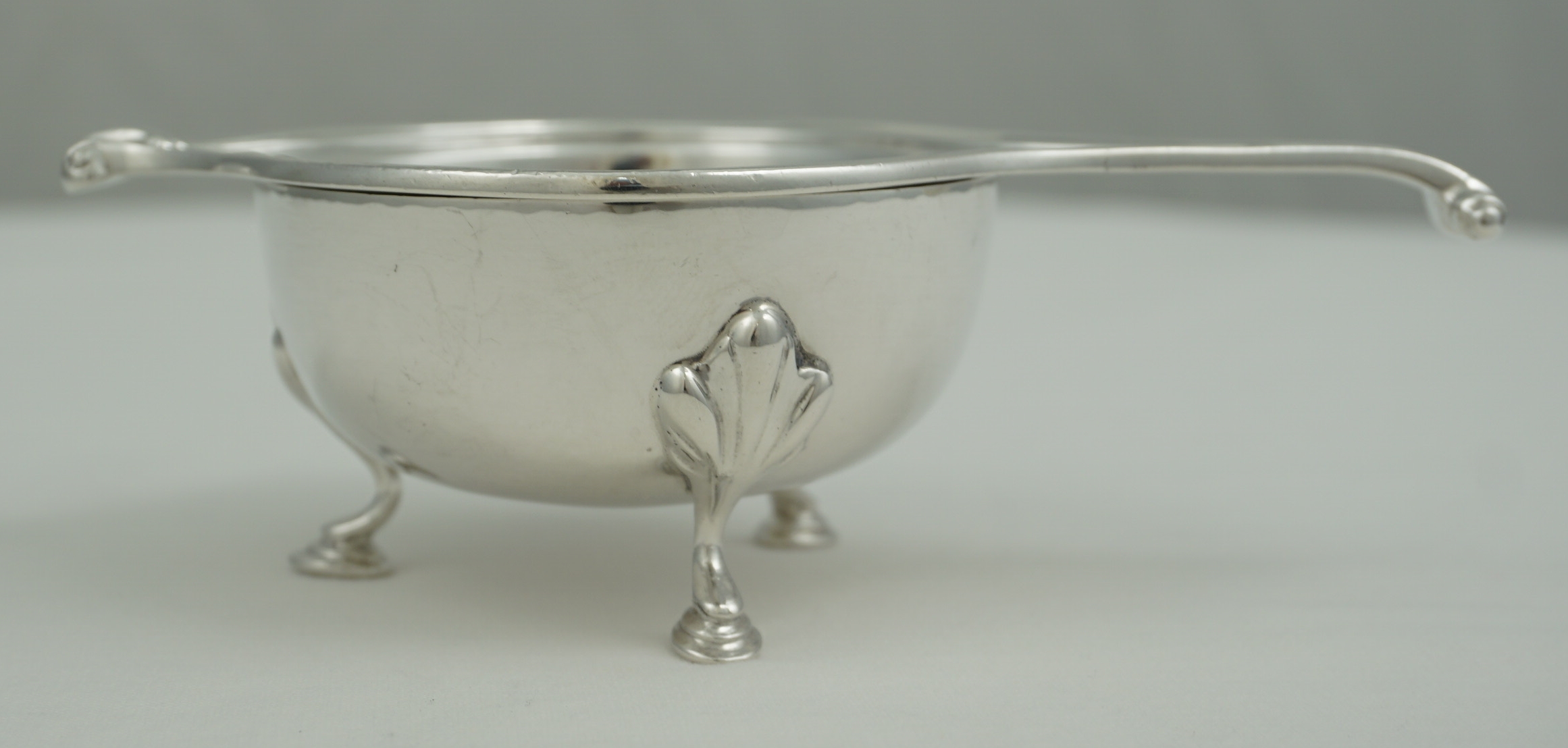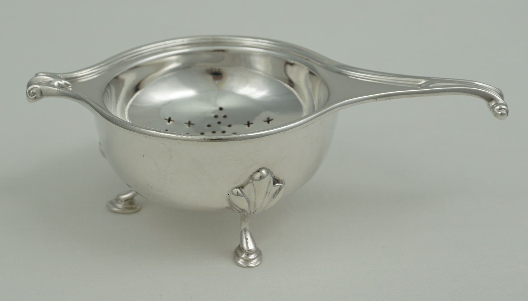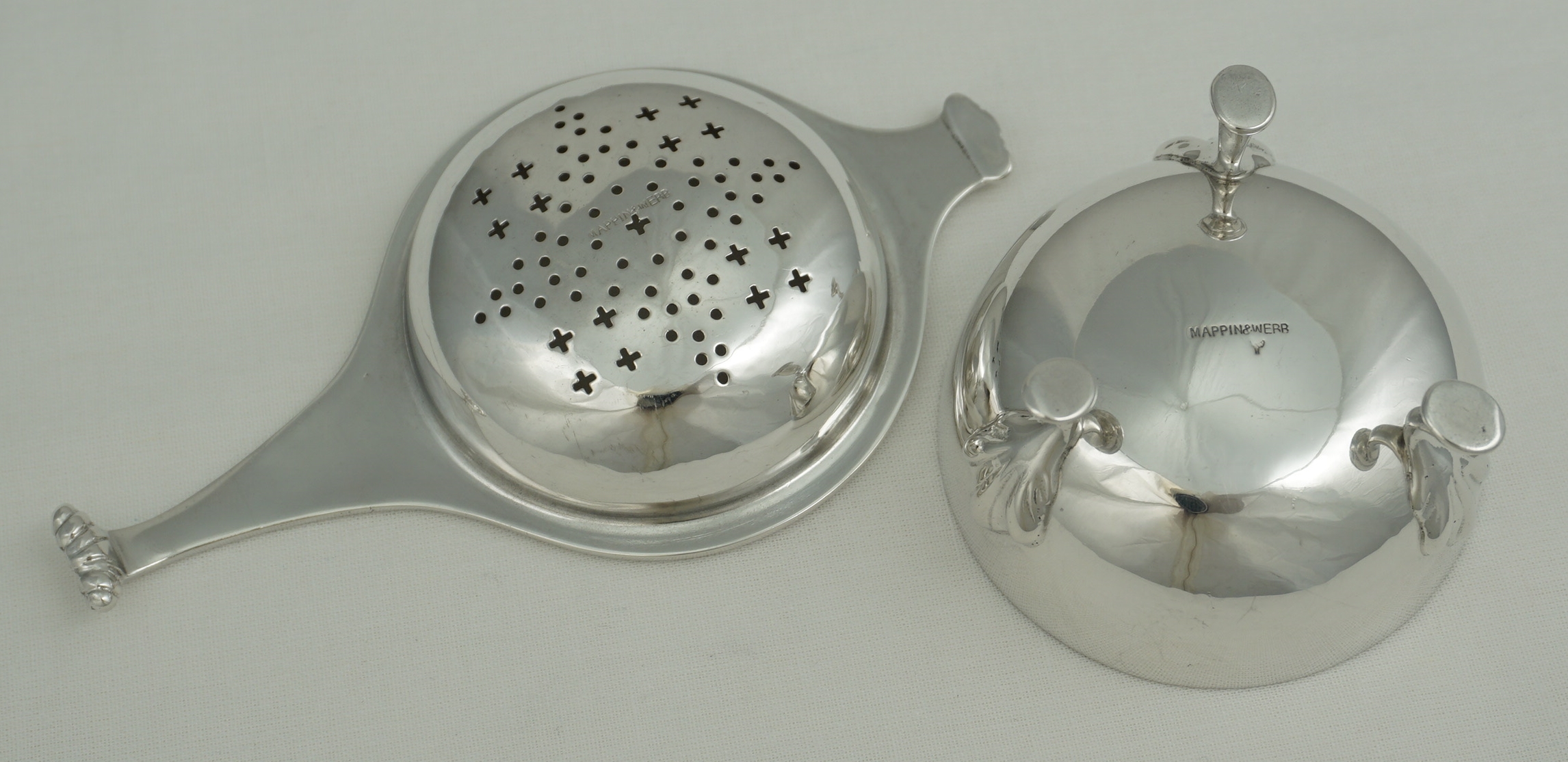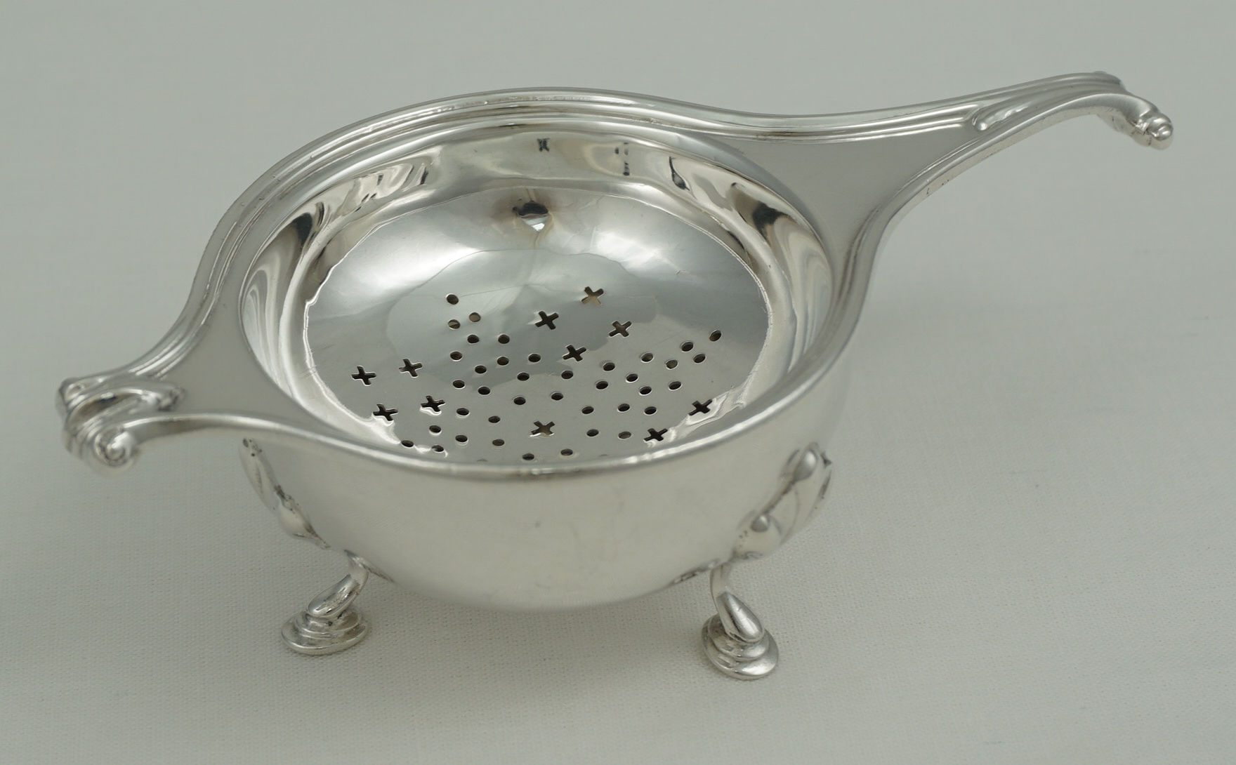 | DESCRIPTION | Good vintage English solid sterling silver tea strainer with the matching stand. Both pieces correctly hallmarked. |