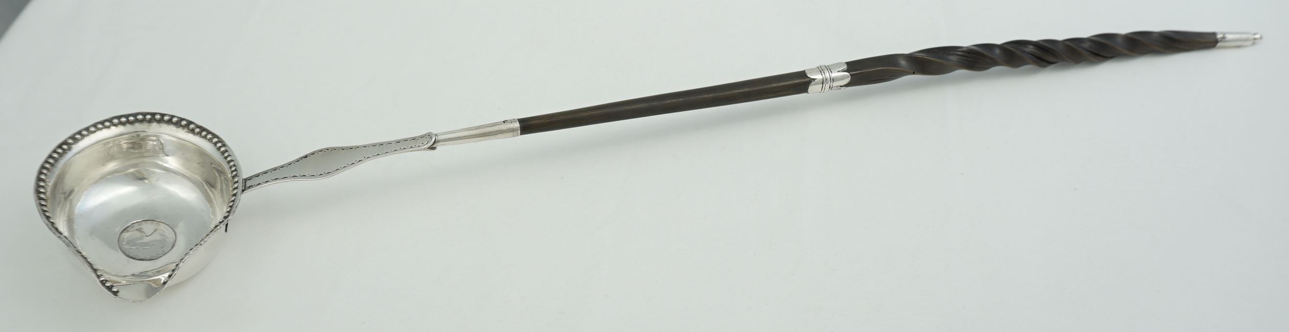 | DESCRIPTION | Exceptionally long antique English Georgian solid sterling silver toddy ladle, the bowl inset with a silver 1705 Queen Anne fourpence. |