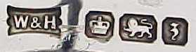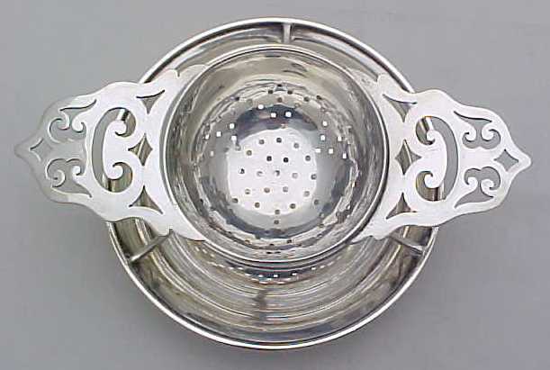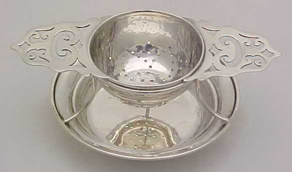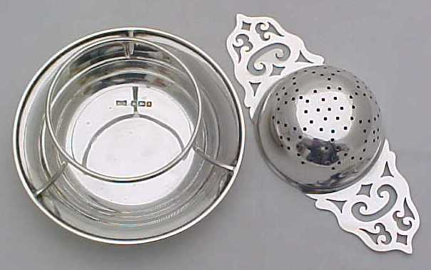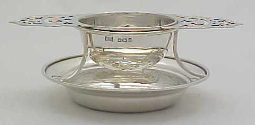 Good and useful silver two handled tea strainer and original drip bowl with integrated three legged stand. |