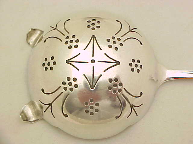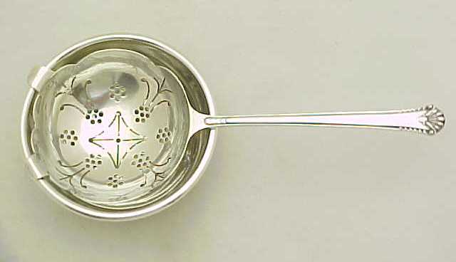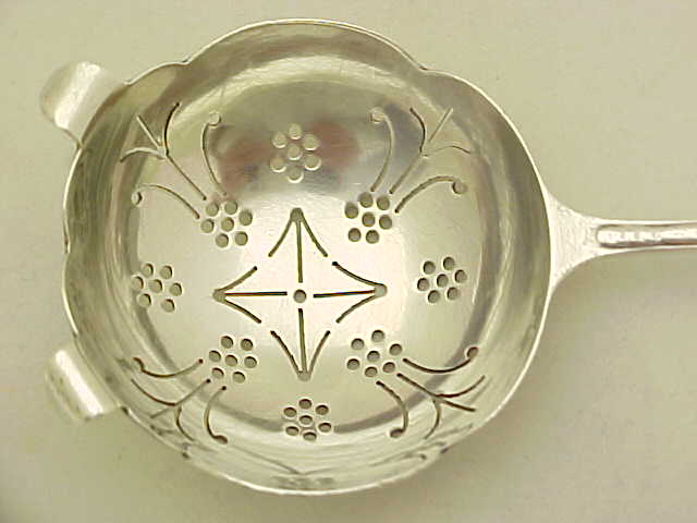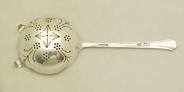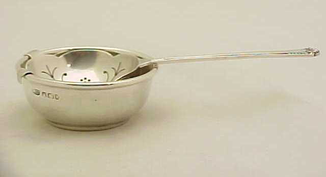 Good quality silver tea strainer and original silver drip bowl from of design registered in the mid 1940s. |
