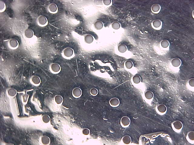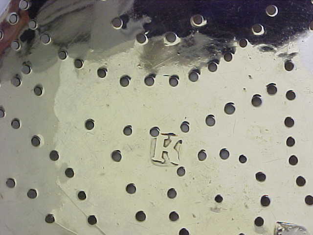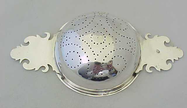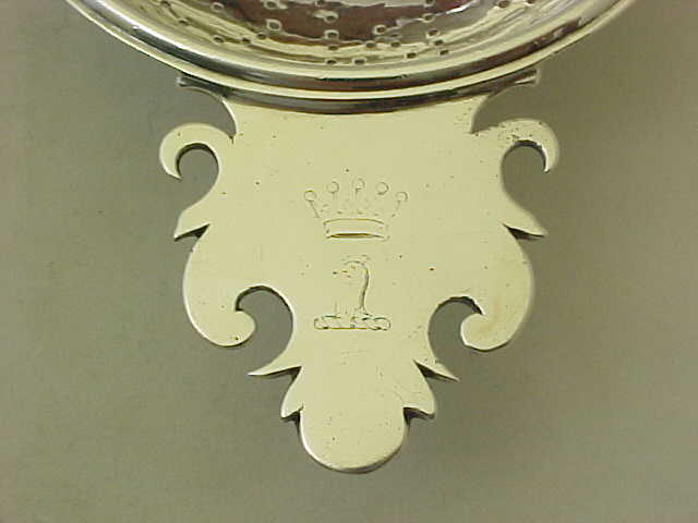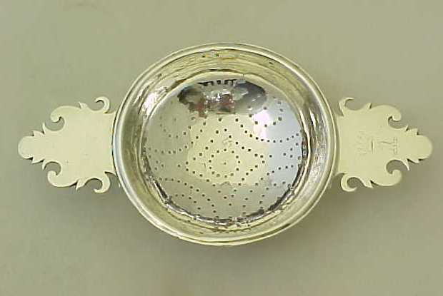 Edward Gibbon, probably, based on the following: All that I can discern from the rubbed maker's mark is that the punch is flat bottomed, contains two letters, second one 'G', both below a device. As we are five years into the reestablishment of the old standard and marking protocol, this should be a silversmith with a second name beginning with G. Three fit our criteria; Edward Gibbons seen on a small tray of 1723, Meshach Godwin on a communion cup of 1722 and John Gorsuch on a coffee pot of 1726. The G fits that of Edward Gibbons far better than it does the others and it is no great leap from making a small tray to making this lemon strainer although I expect that the others were equally capable. |