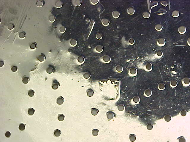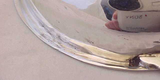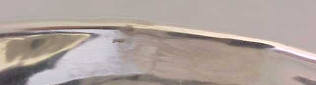 one handle has been soldered back on. It was a good effort but the two handles do not align perfectly. In the same area some silver solder has been flooded along the underside of the bowl rim for about an inch. This was most likely done at the time of the handle reattachment to beef up the metal at a thin spot in the rim and to help the reattachment. A little bump can also be seen on the inside of the rim at this point. |