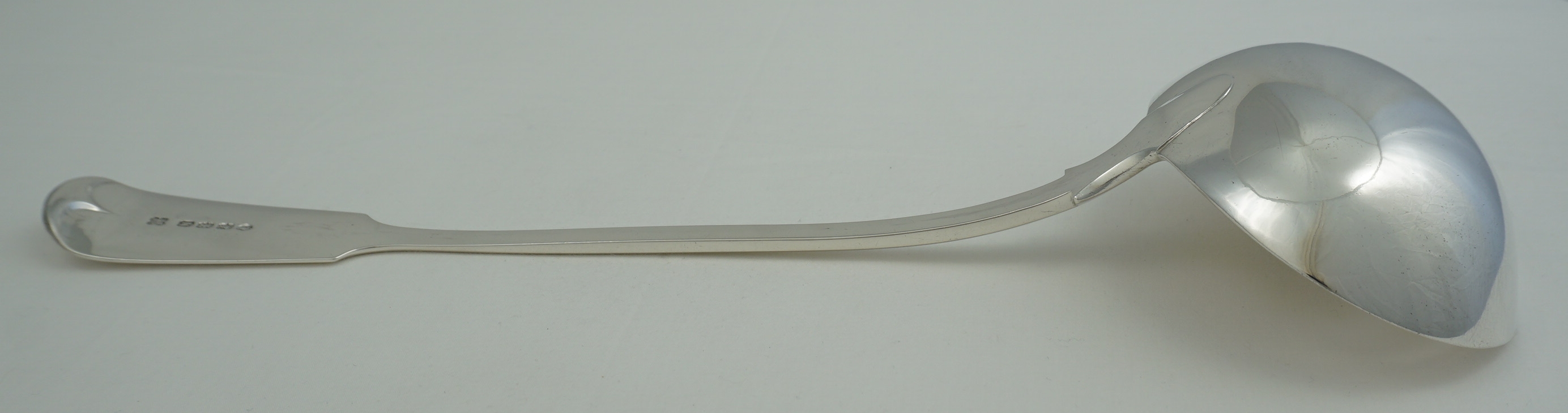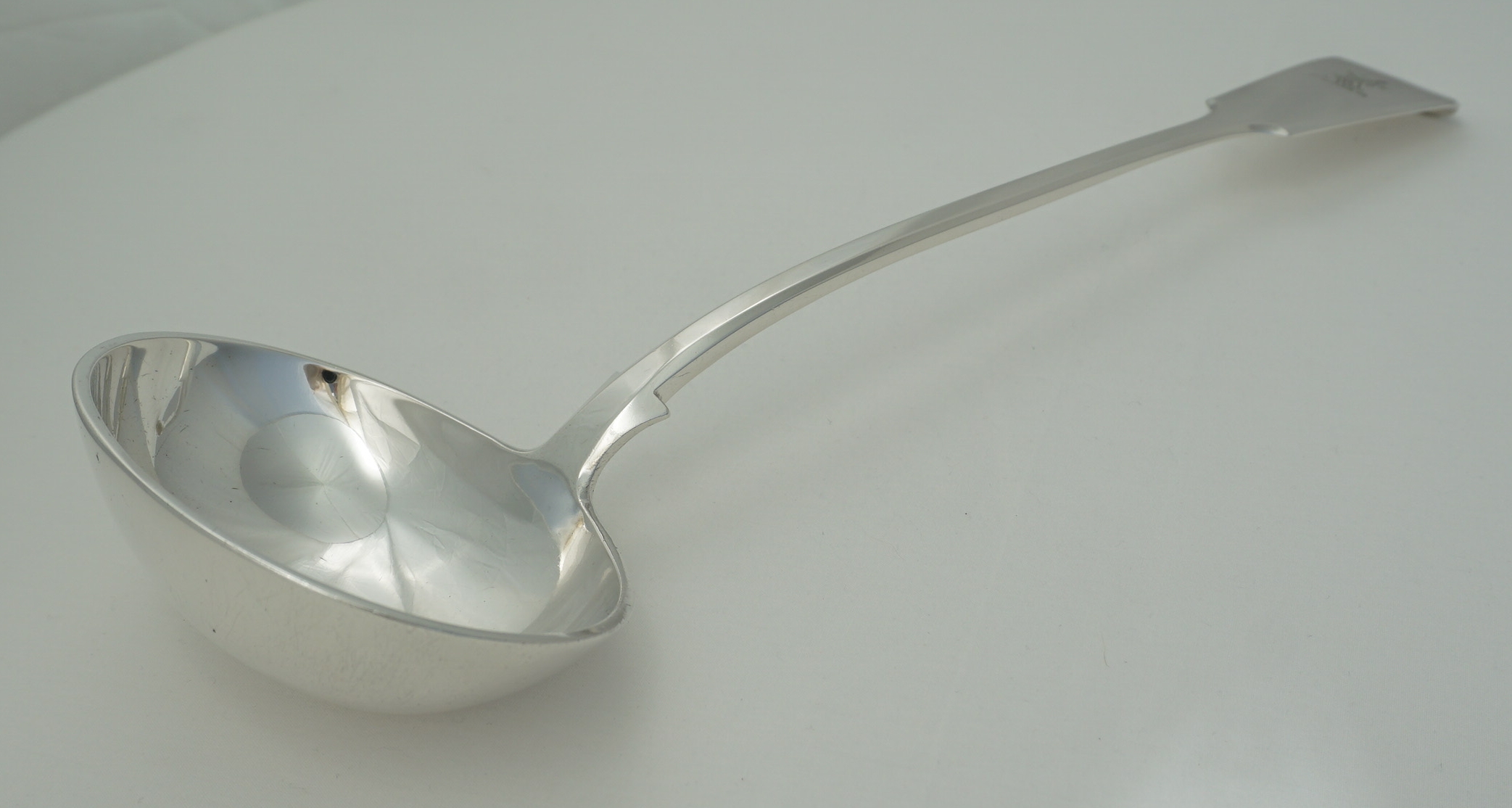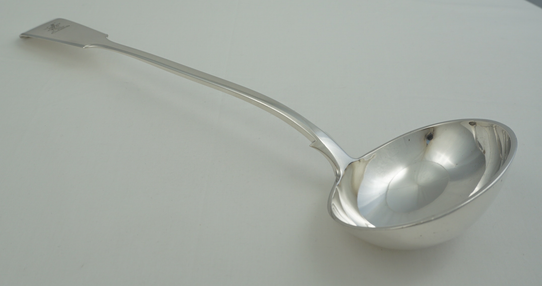 DESCRIPTION | Exceptionally large, heavy and impressive antique English Victorian solid sterling silver Fiddle pattern soup ladle with a crisp frontal crest engraving. |