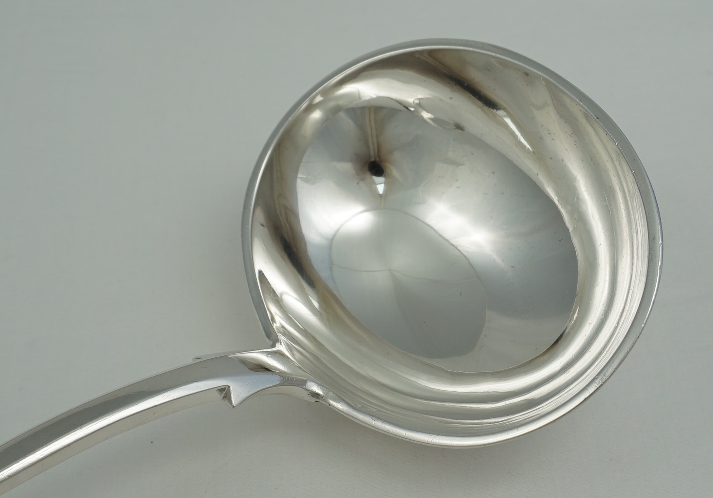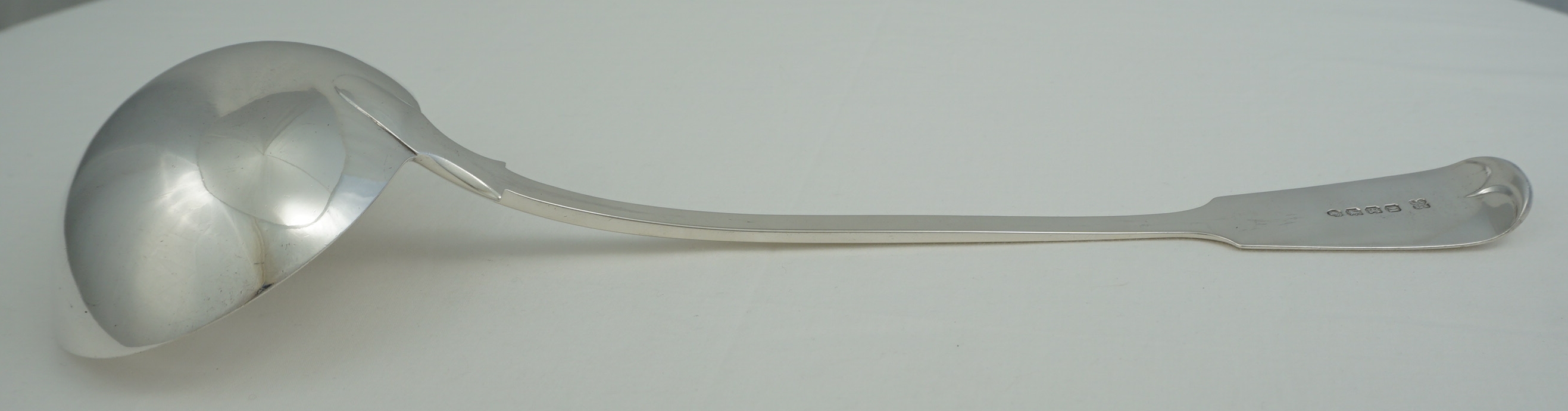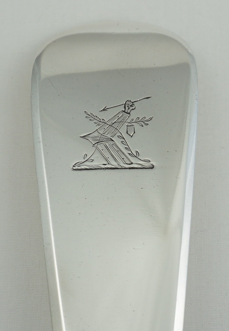 DESCRIPTION | Exceptionally large, heavy and impressive antique English Victorian solid sterling silver Fiddle pattern soup ladle with a crisp frontal crest engraving. |