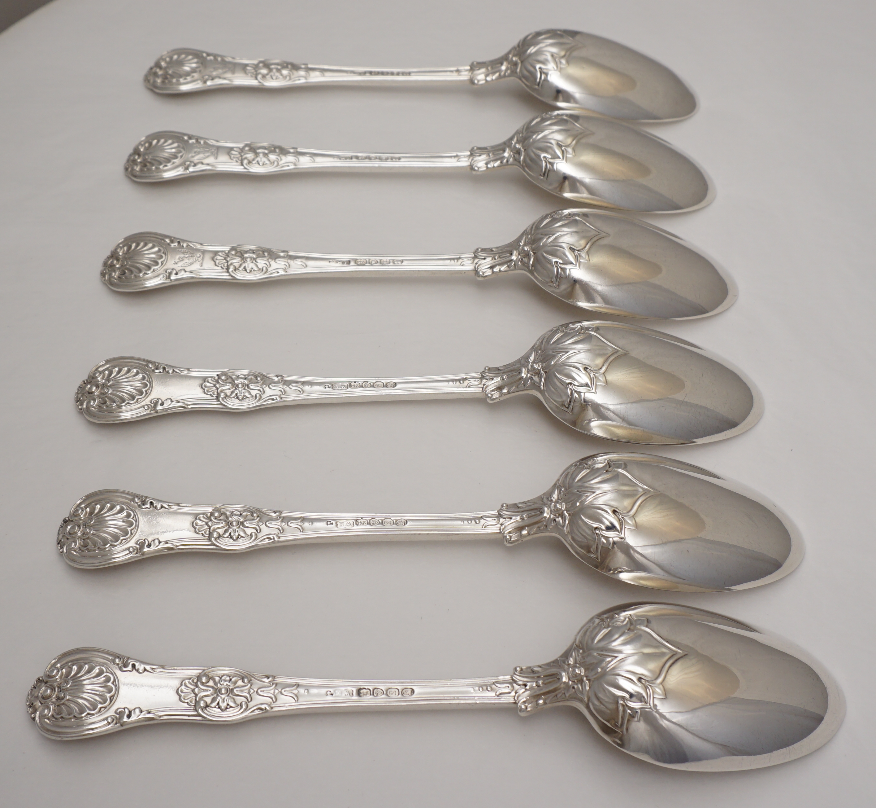 DESCRIPTION | Very good set of six antique English Georgian and William IV solid sterling silver double struck (pattern both sides) Scroll Rosette pattern table spoons, three with crest verso and three with frontal crest and motto. |