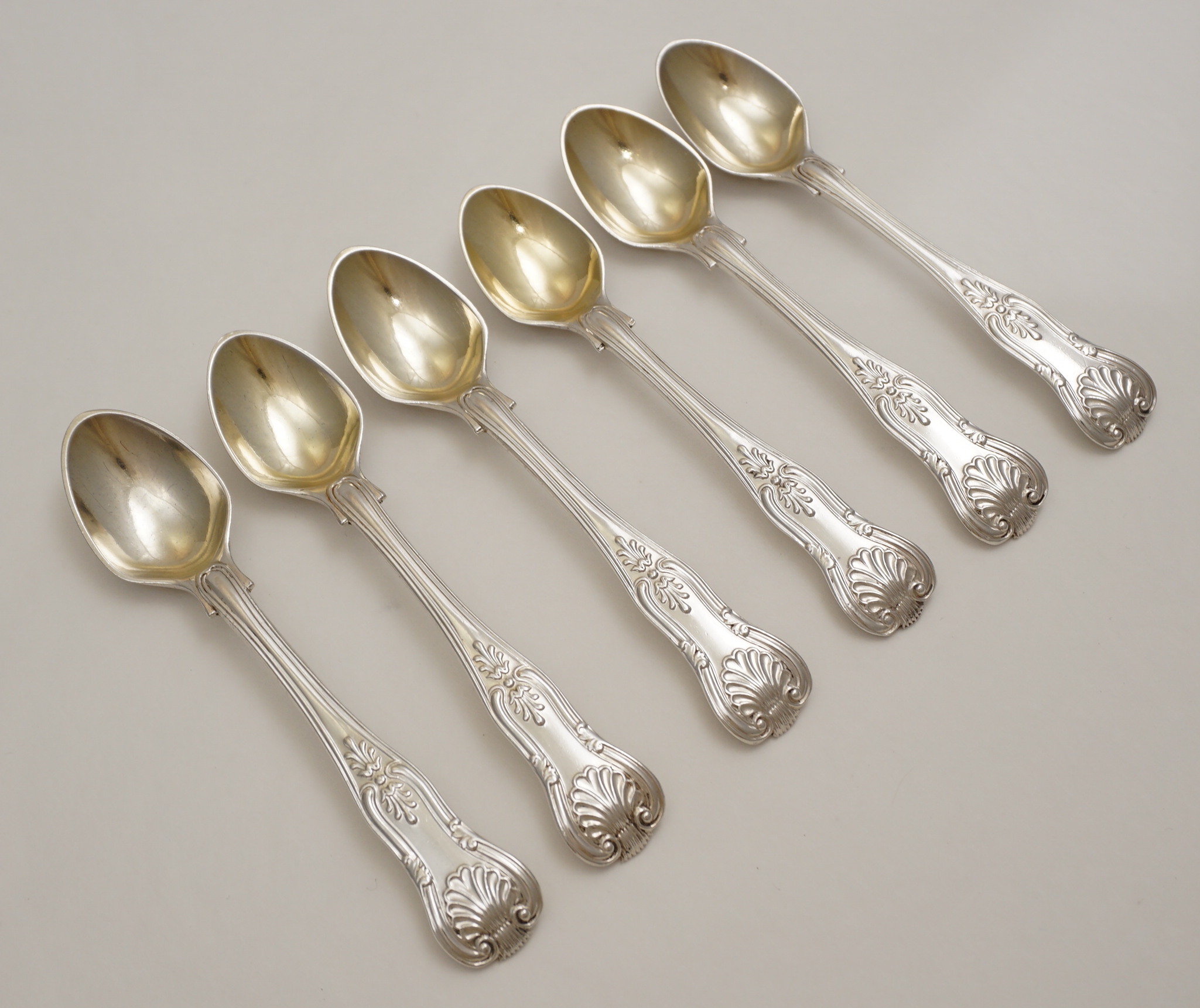 DESCRIPTION | Superb set of six antique English Victorian solid sterling silver double struck (pattern both sides) King's pattern egg spoons with gilded bowls and no engraving or erasure. |