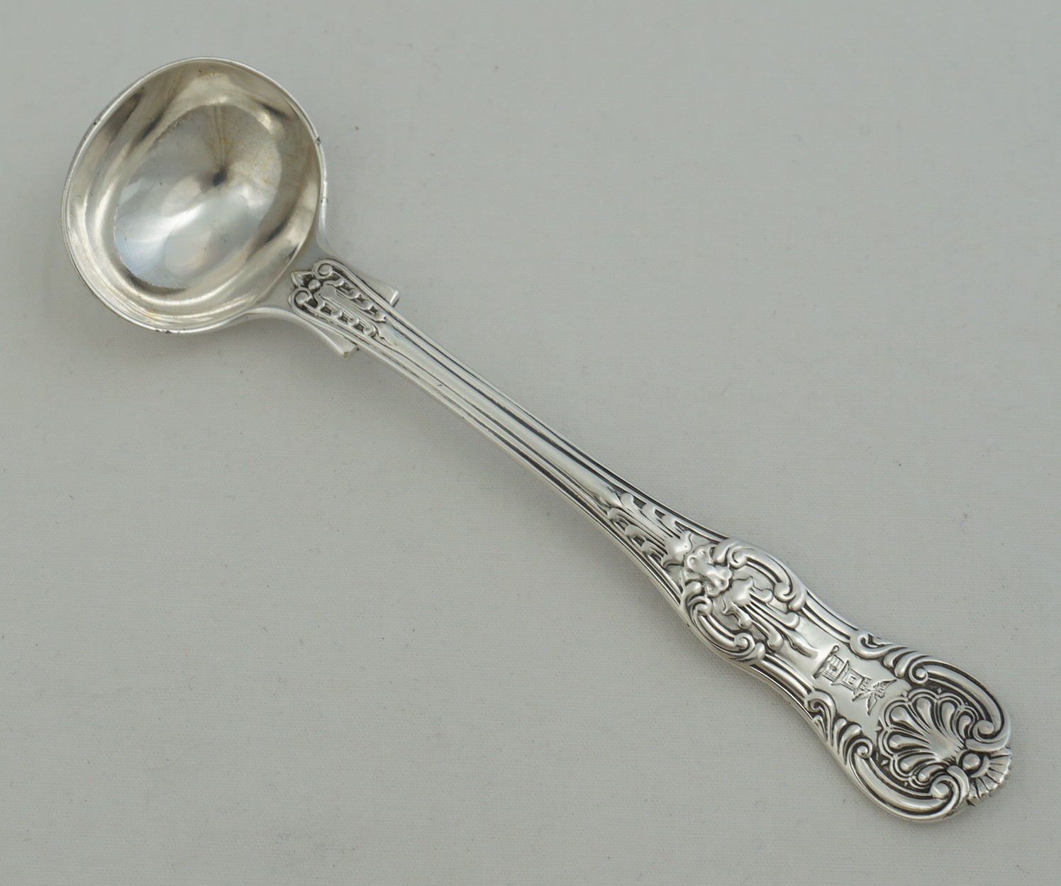| DESCRIPTION | Good quality and hefty antique English Victorian solid sterling silver double struck (pattern both sides) Queen's pattern salt spoon with the original frontal crest engraving and no erasures. |