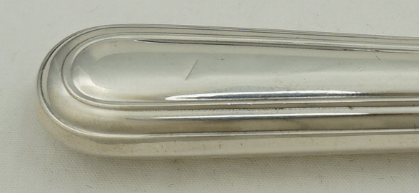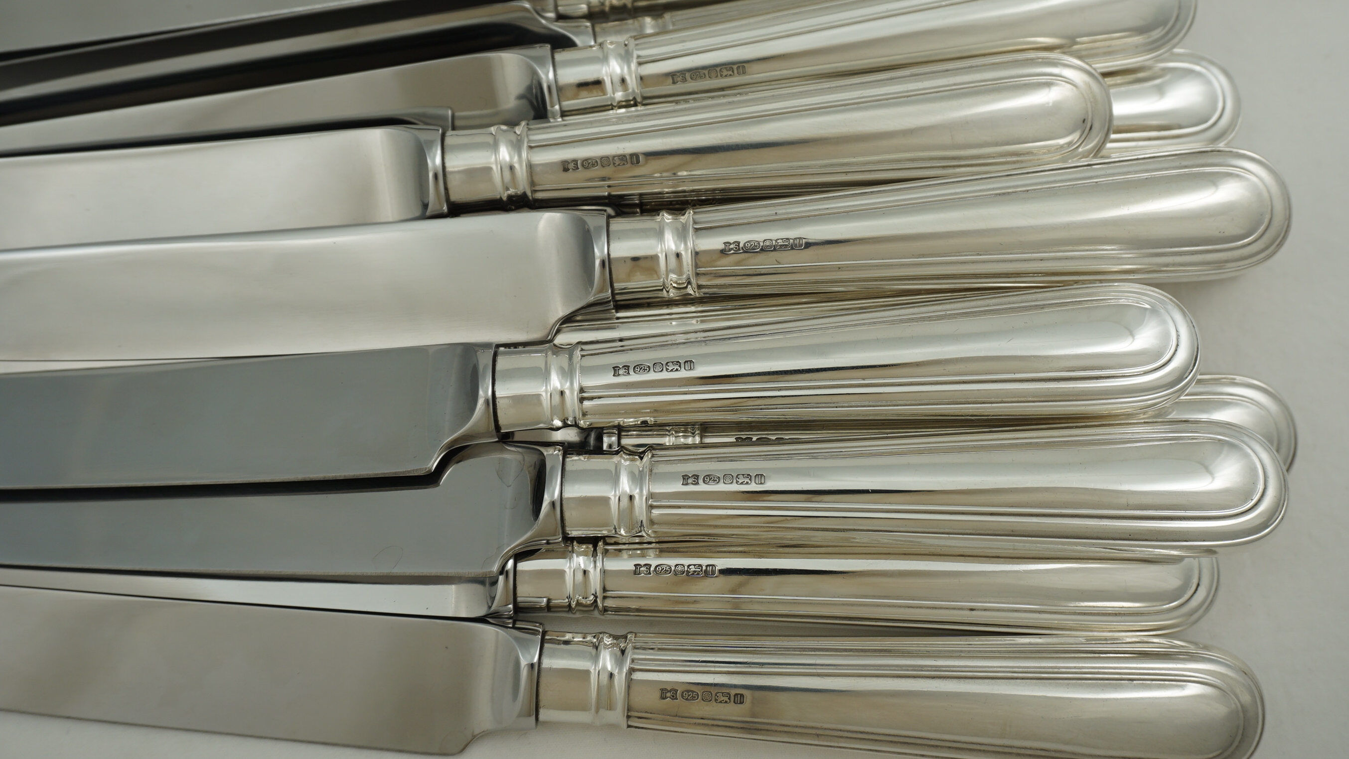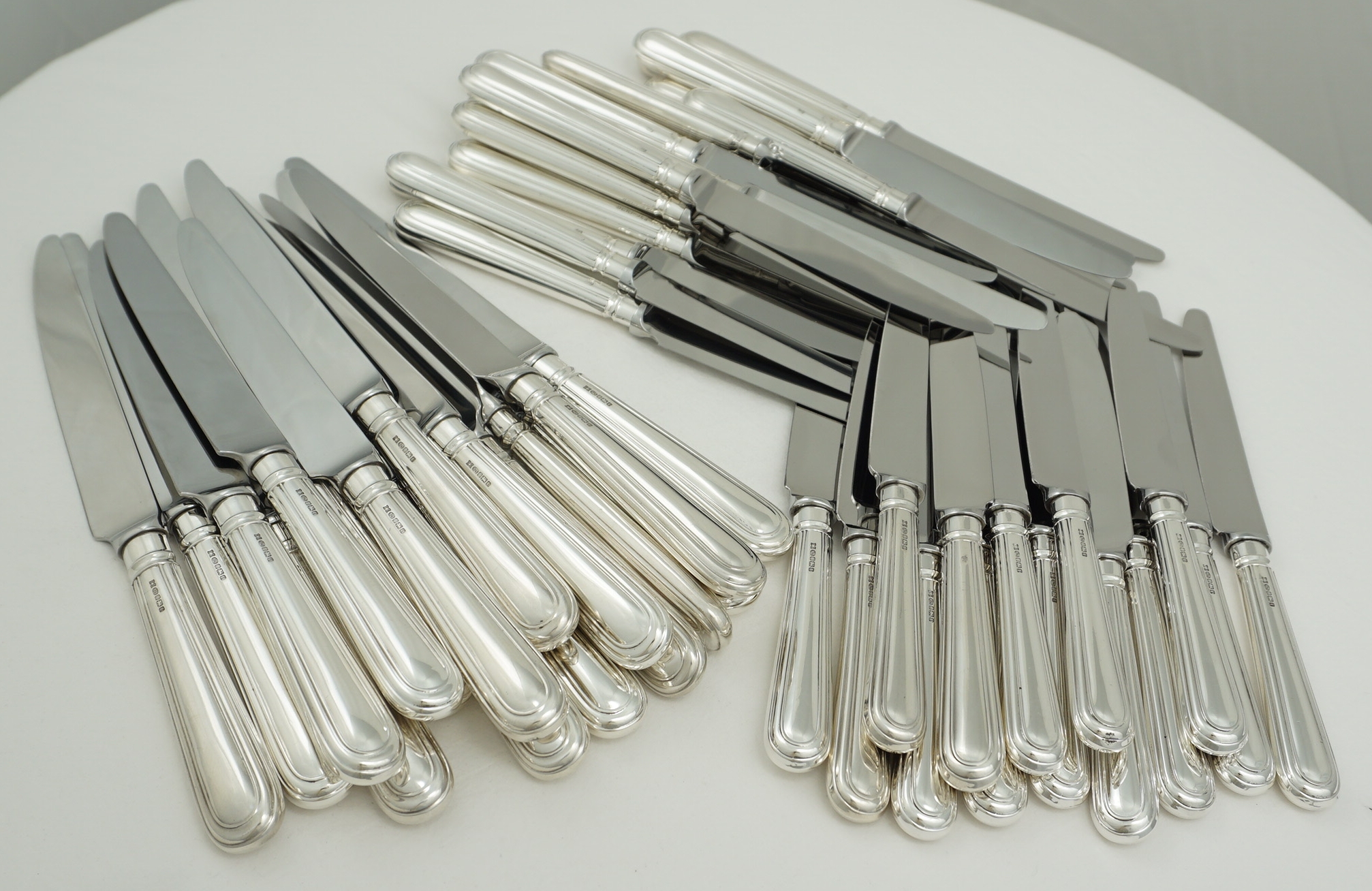 | DESCRIPTION | High quality and useful set of loaded sterling silver Old English & Thread pattern handled knives with Sheffield made mirror finished stainless steel blades. Ideal yet hard to find combination of sixteen large main course knives and thirty-two smaller starter/salad/dessert/cheese knives. Similar knives are available new from Carrs at £327 each for the large and £291 each for the smaller, totalling £14,544. |