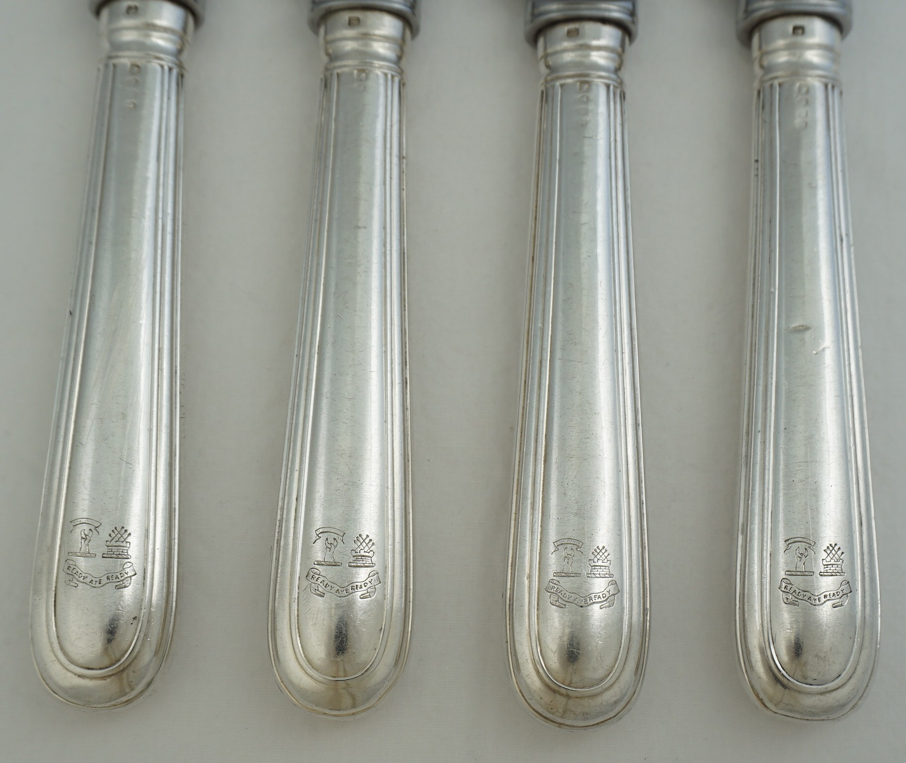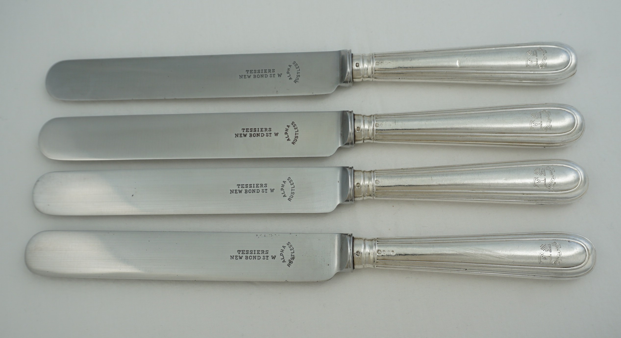 | DESCRIPTION | Wonderful set of four antique English Victorian pitch loaded solid sterling silver Old English & Thread pattern handled table knives with a double crest above a motto and later rustless steel blades by Tessiers of New Bond Street, London. I daily use a set of eight similar handles fitted with exactly these generously proportioned blades by Tessiers and they are an absolute pleasure to use. I do not recommend using a dishwasher on your antique silver, especially pitch loaded knives, but can confirm that my examples have been "accidentally" run through the dishwasher many times with no adverse effects. To use a perfectly balanced large dinner knife such as these is one of life's simplest yet greatest pleasures and I recommend everyone to try it at least once. |