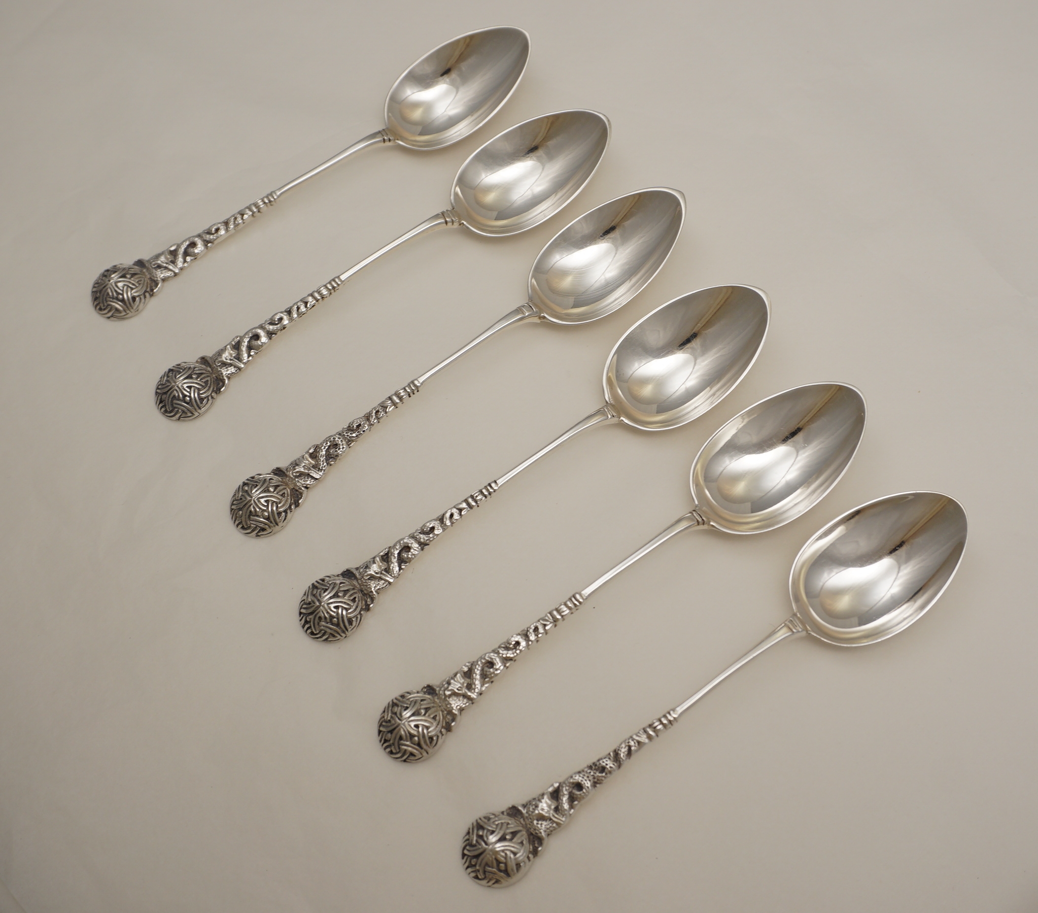 DESCRIPTION | Unusual and high quality set of six antique Scottish solid sterling silver teaspoons with Celtic knot decoration and rat tails to the bowl backs. |