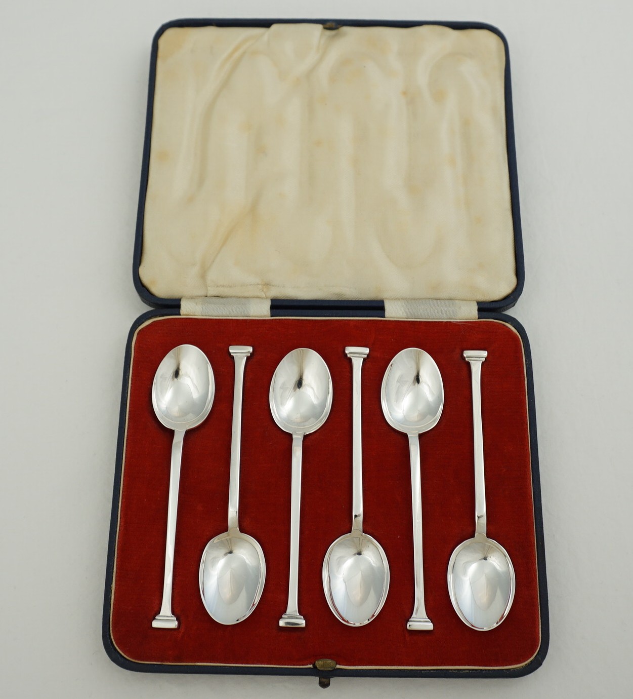 | DESCRIPTION | Good set of vintage English solid sterling silver coffee spoons with original fitted case. |