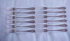 Twelve 6 ¾" Dog Nose 3-tine dessert forks, James Parkes, London 1909, 578g. |