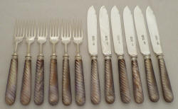 Fish eaters with carved mother of pearl handles, Goldsmiths & Silversmiths, London 1905, total 584g. |