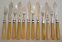 Twelve fish eaters with silver blades and tines and ivory handles, Goldsmiths & Silversmiths Co. Ltd., Sheffield 1926, 210mm, total 503g. |