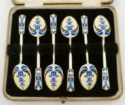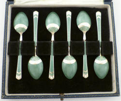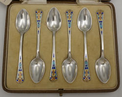 Six gilded Norwegian sterling silver coffee spoons with enamel decoration, Aksel Holmsen.